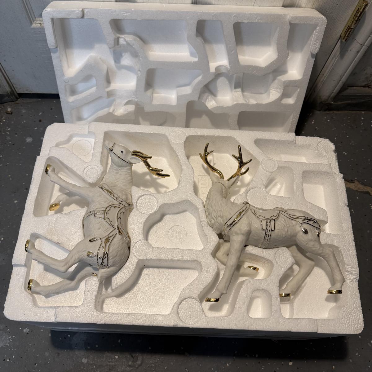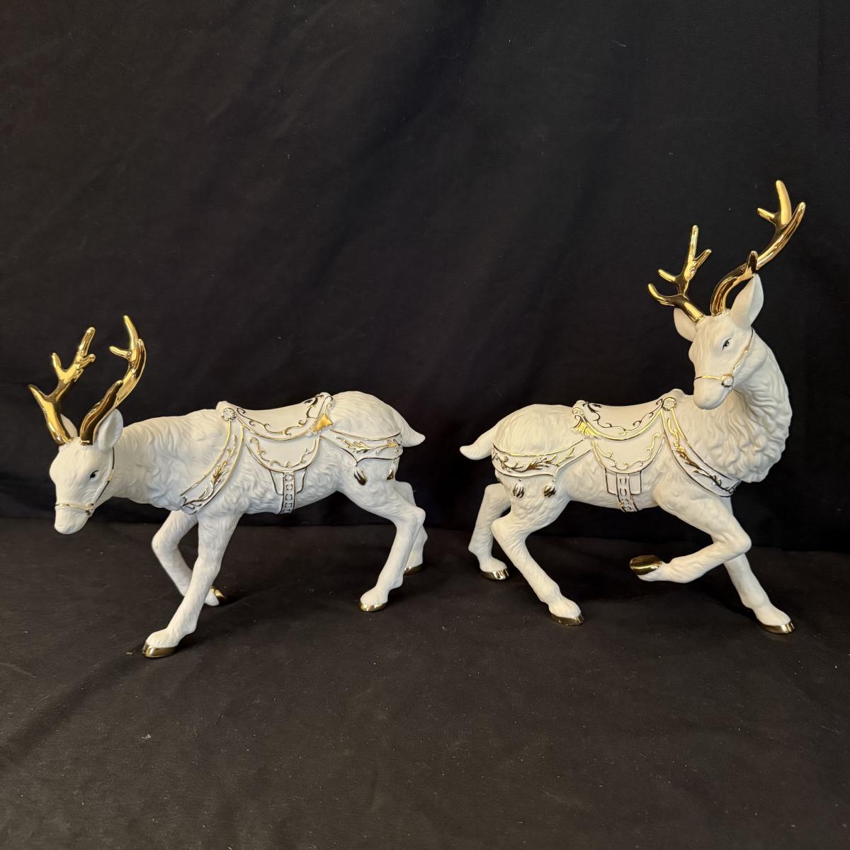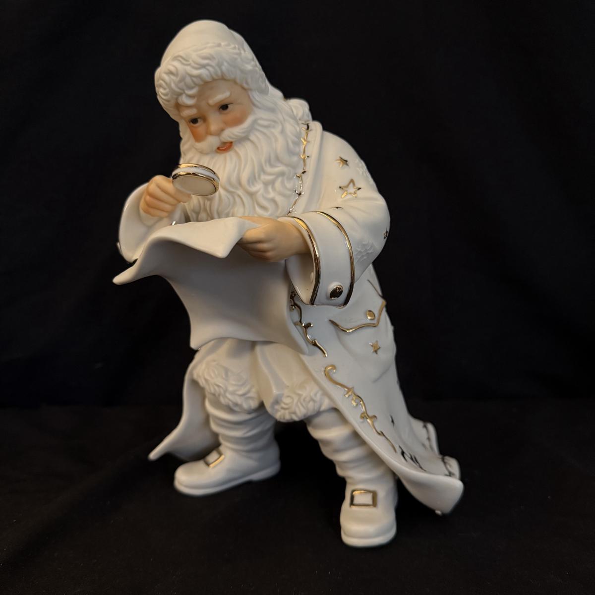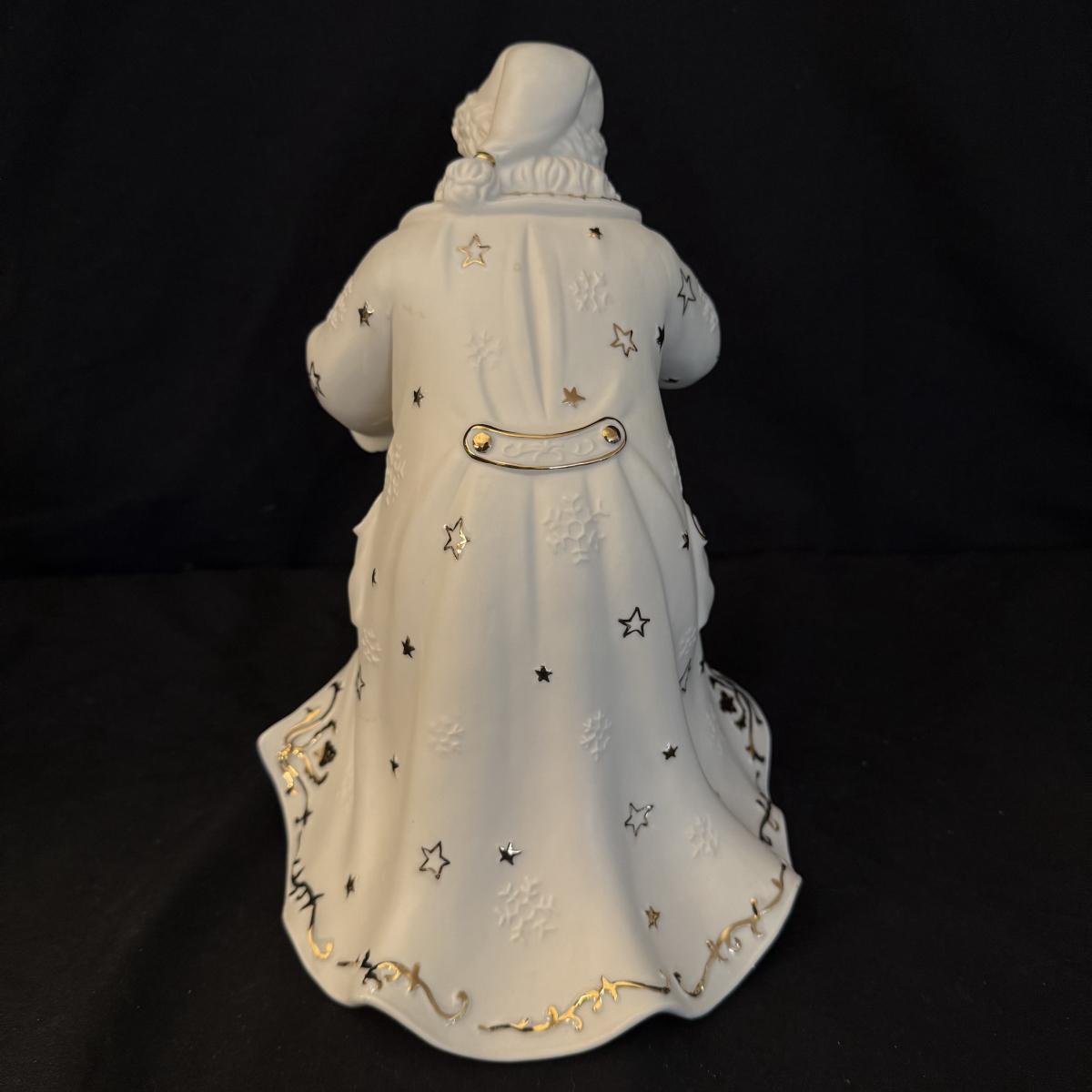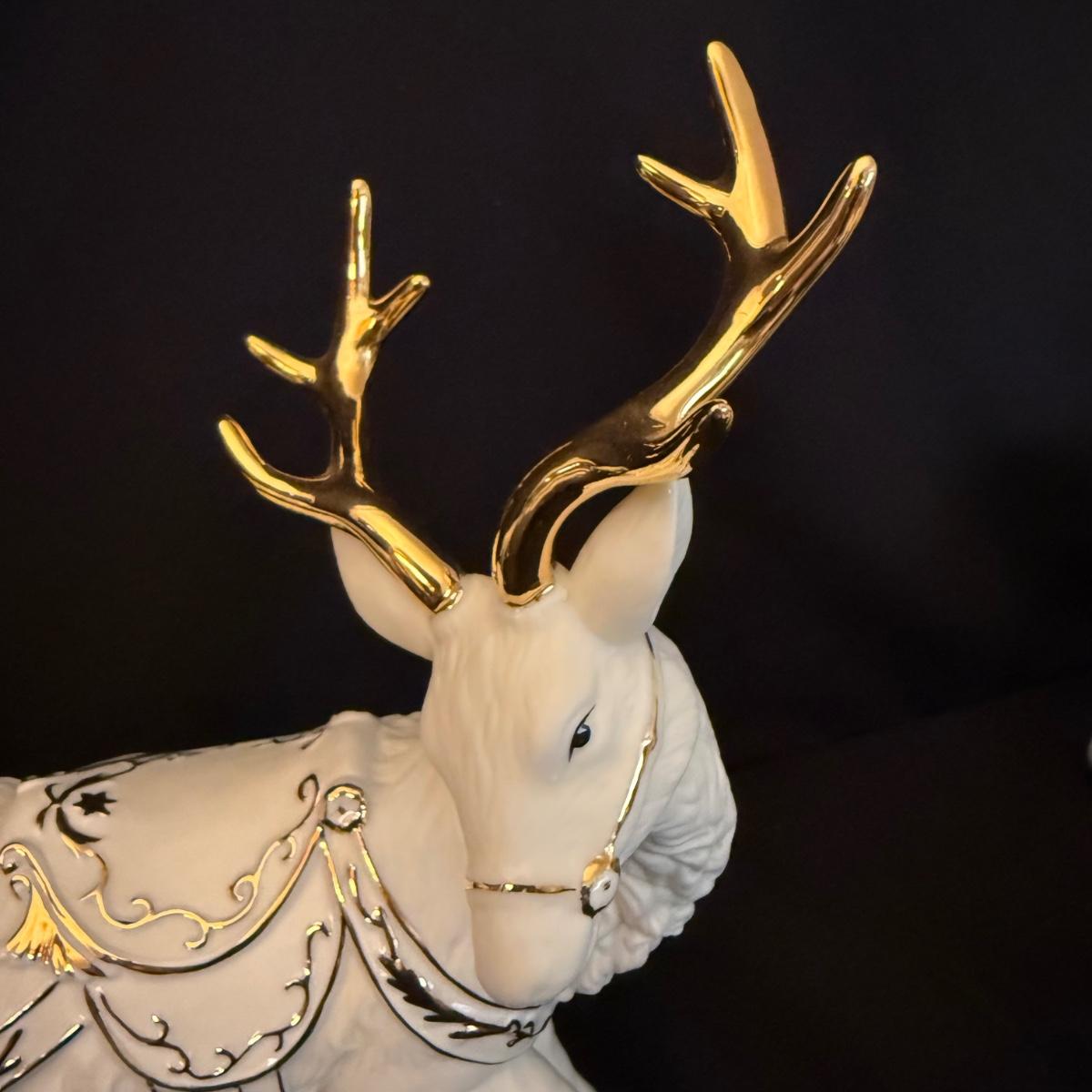 Grandeur Noel Porcelain Santa and Sleigh set comes in its original box encased in styrofoam. Set includes Santa, a sleigh full of toys, and two reindeer. The porcelain figurines are accented in metallic gold. The sleigh measures approximately 14” x 7.5” x 11”H. Two of the toys have broken off; their pieces are included and can be glued back on.