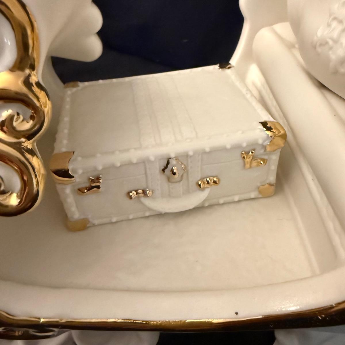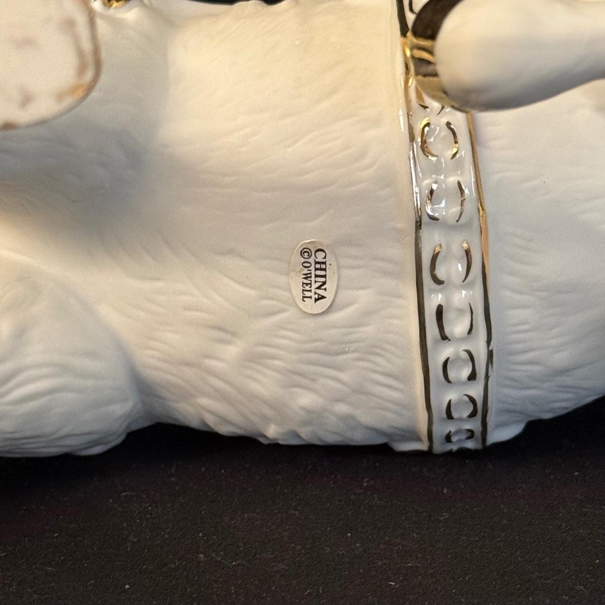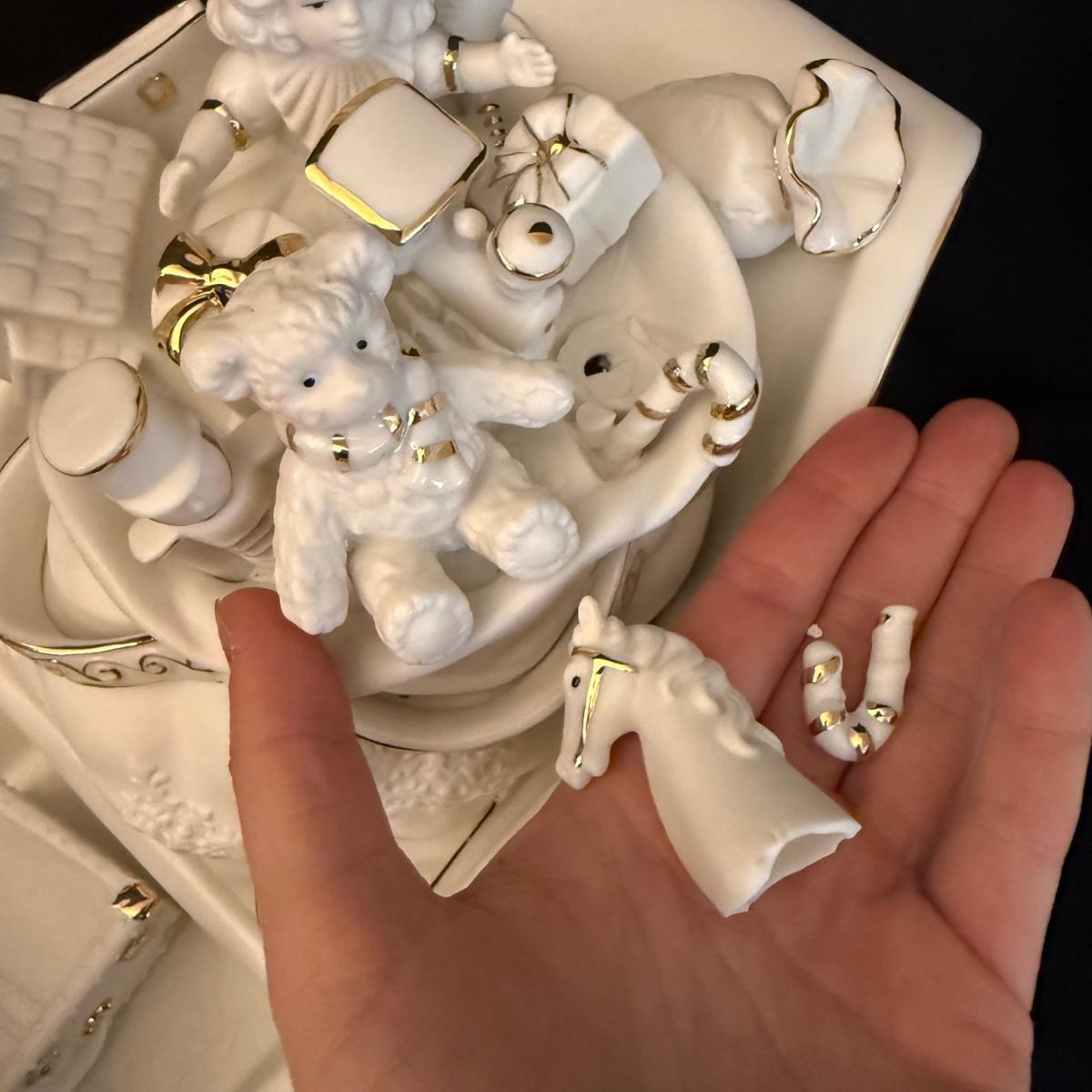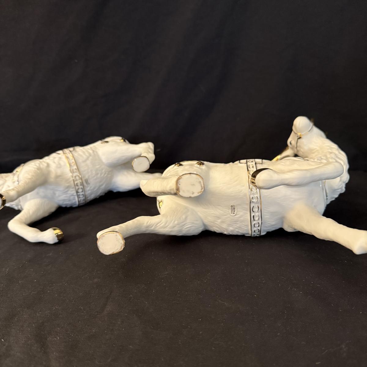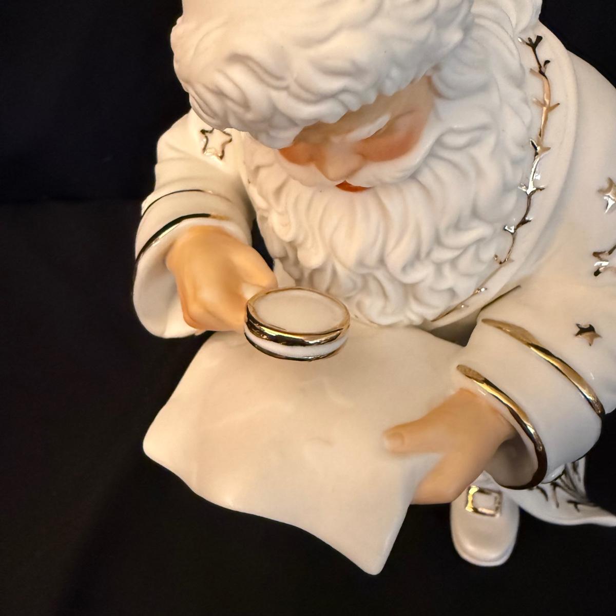 Grandeur Noel Porcelain Santa and Sleigh set comes in its original box encased in styrofoam. Set includes Santa, a sleigh full of toys, and two reindeer. The porcelain figurines are accented in metallic gold. The sleigh measures approximately 14” x 7.5” x 11”H. Two of the toys have broken off; their pieces are included and can be glued back on.