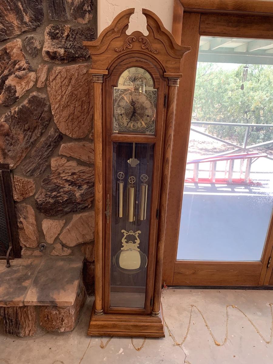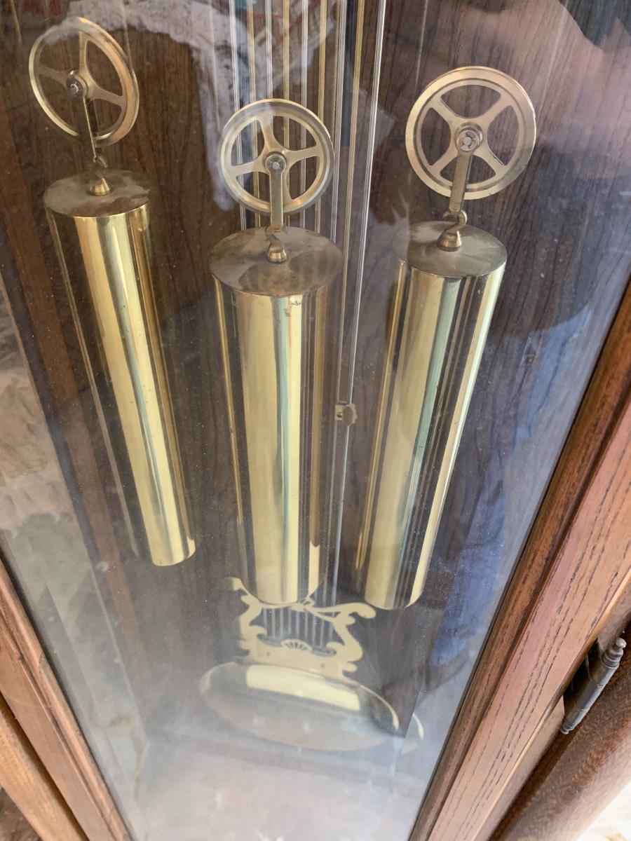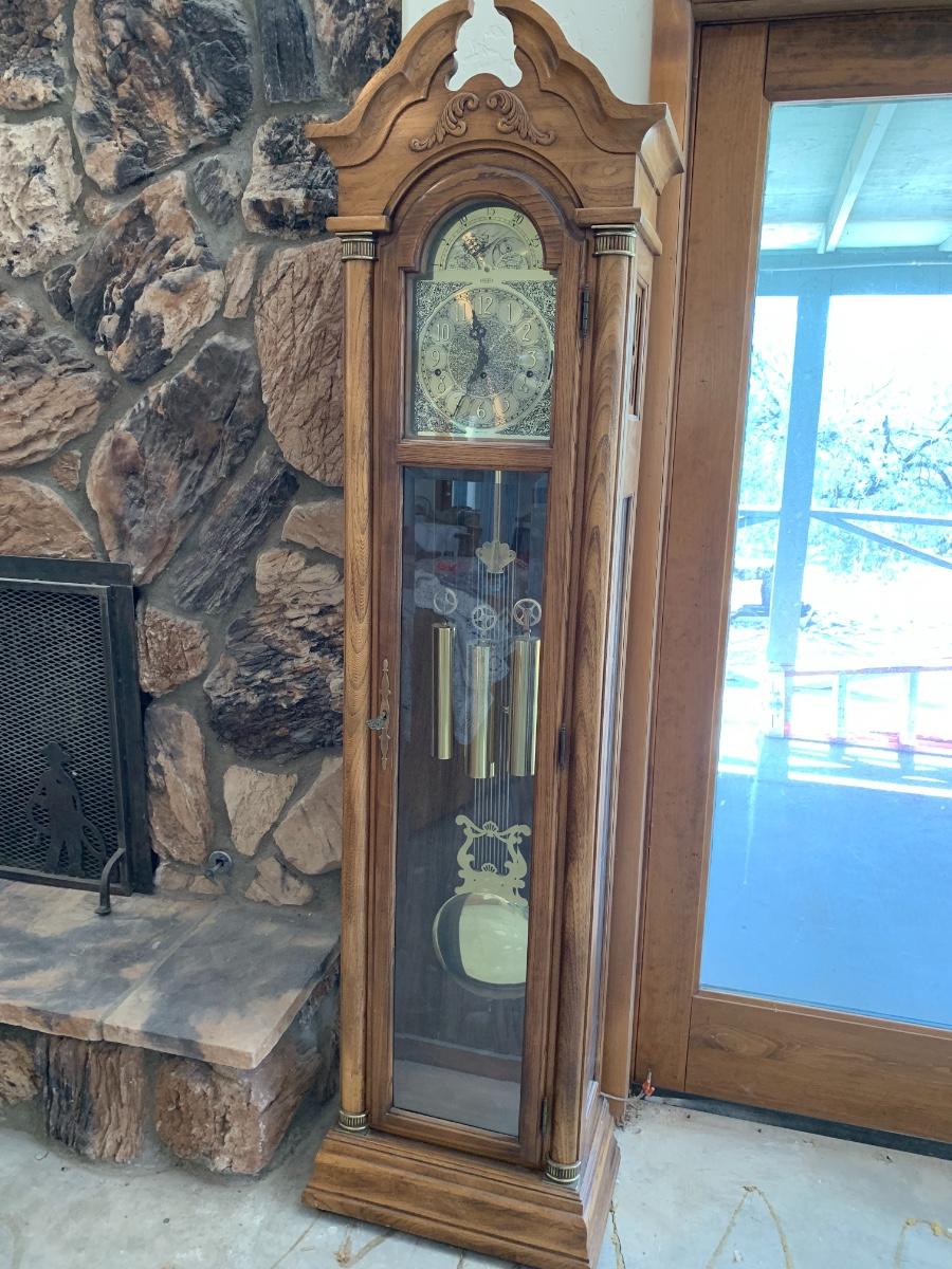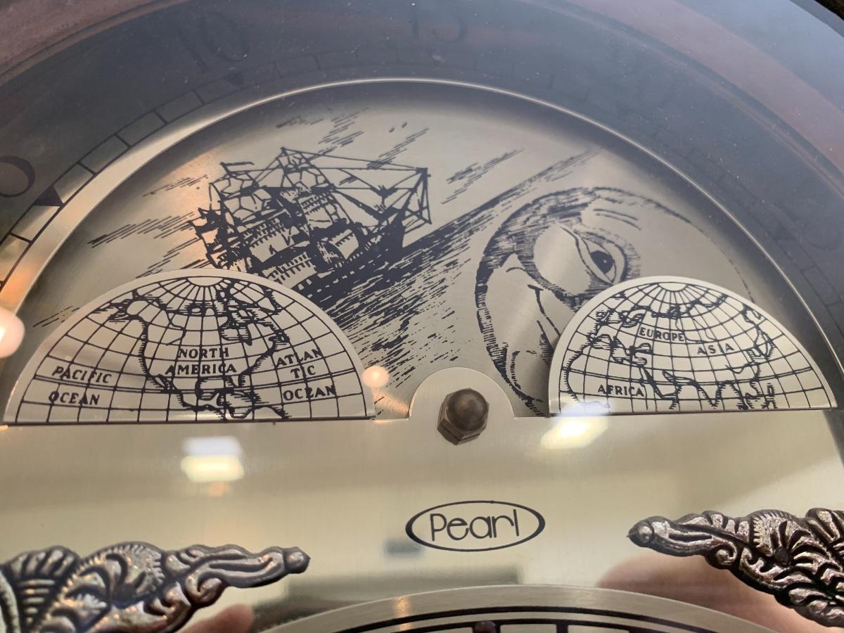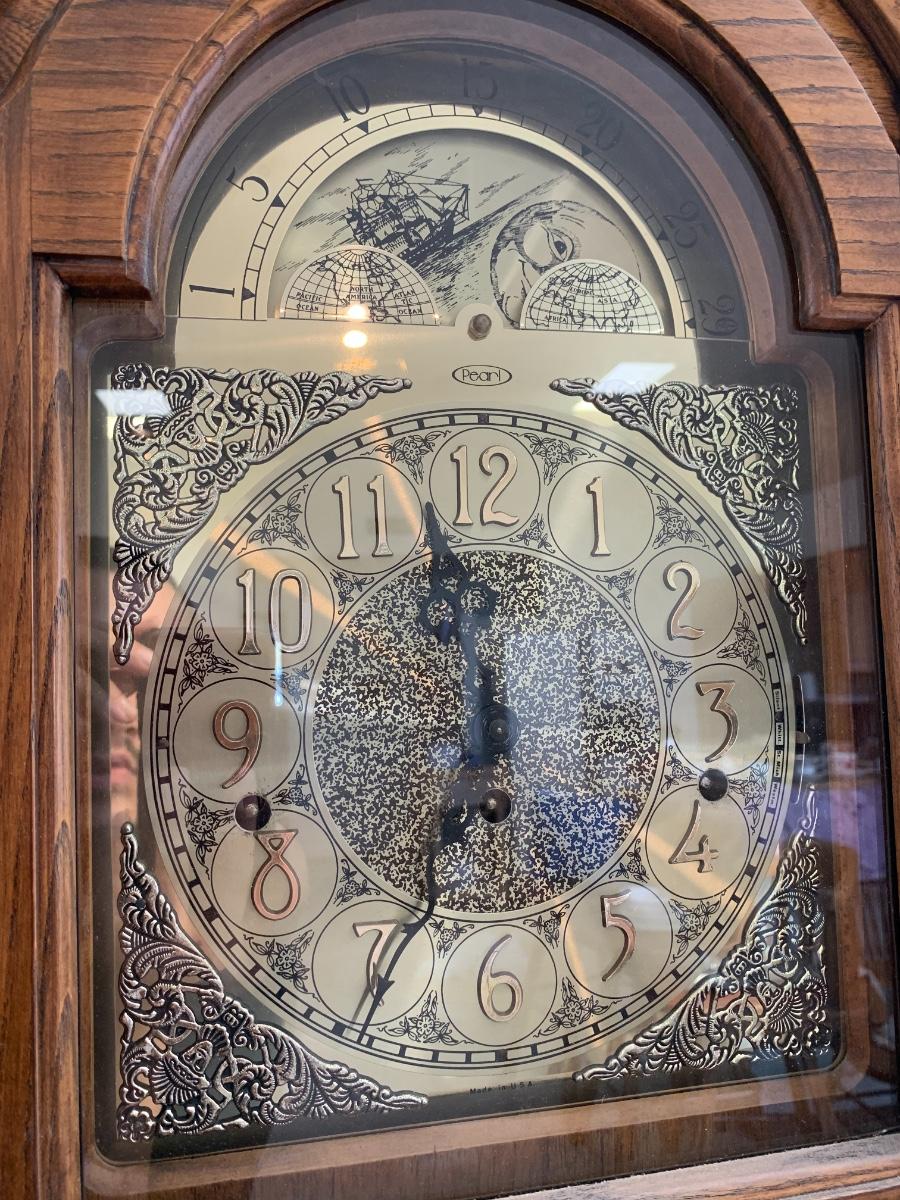 One Pearl grandfather clock made in the USA with a nautical theme, includes the door key. Has brass weights and pendulum. Appears to be great condition *untested*