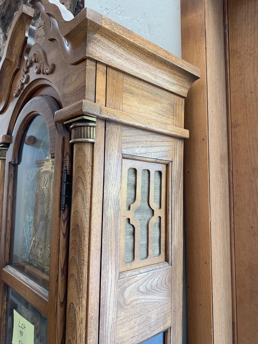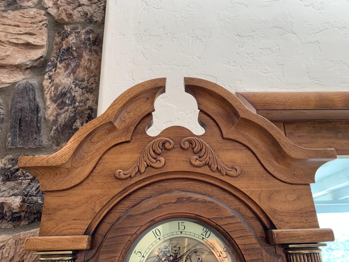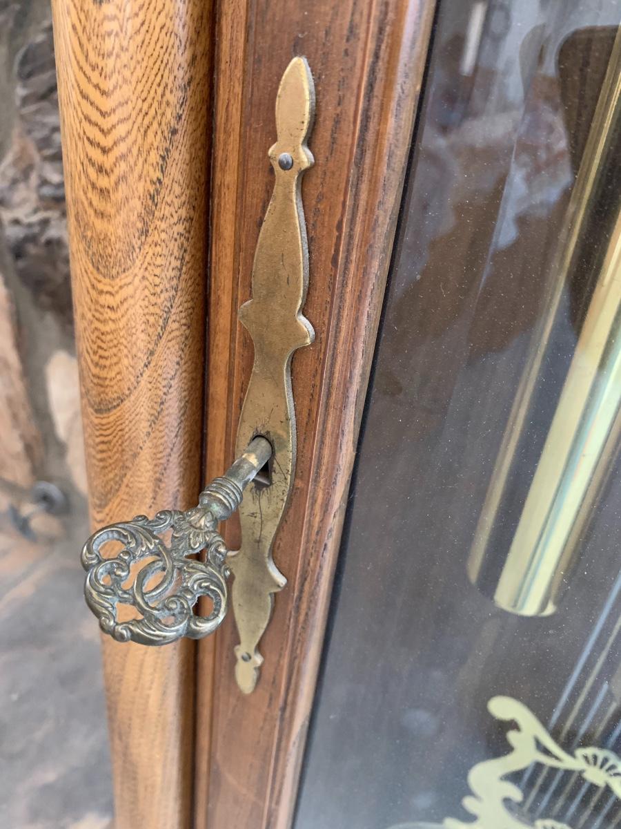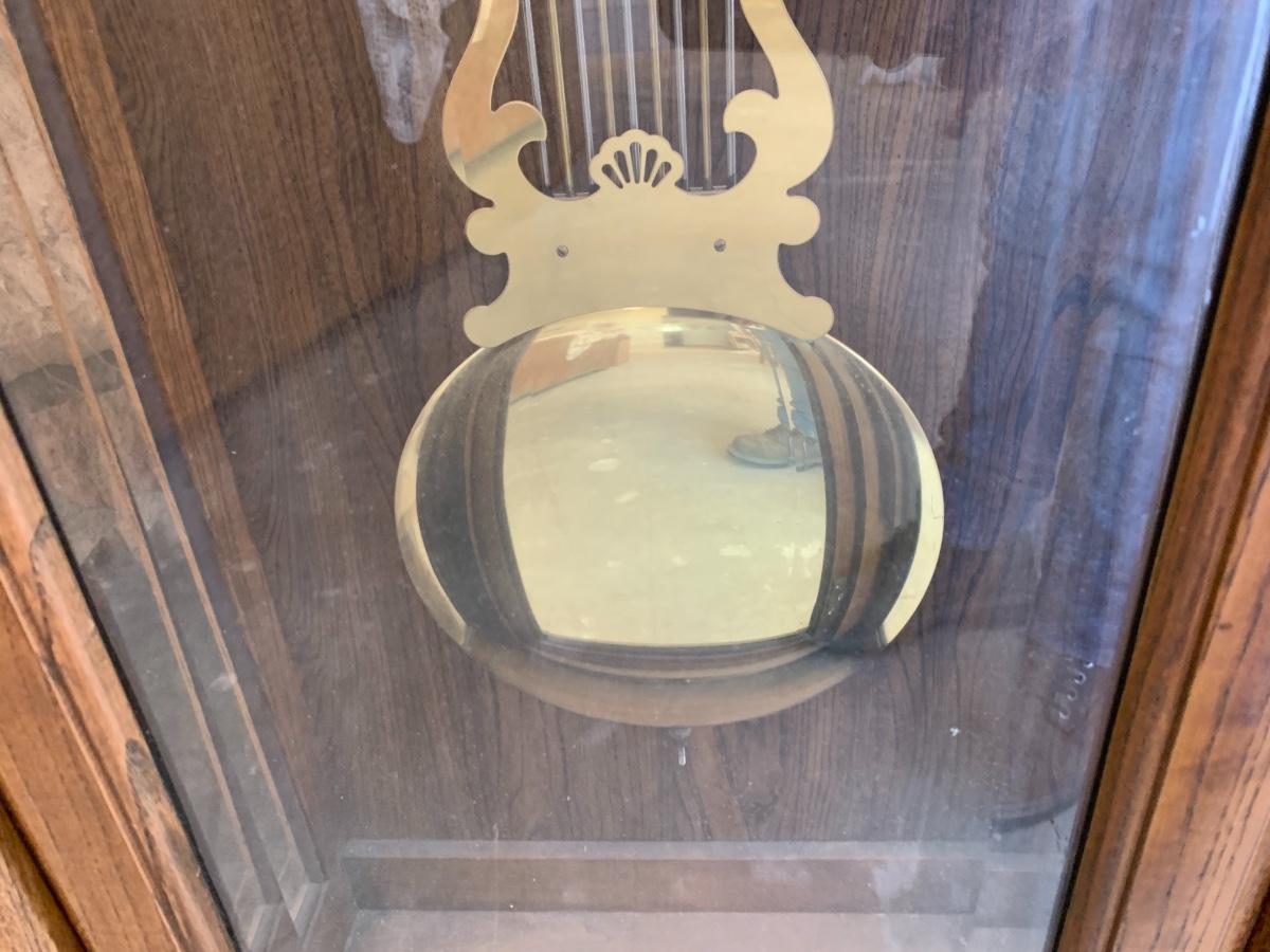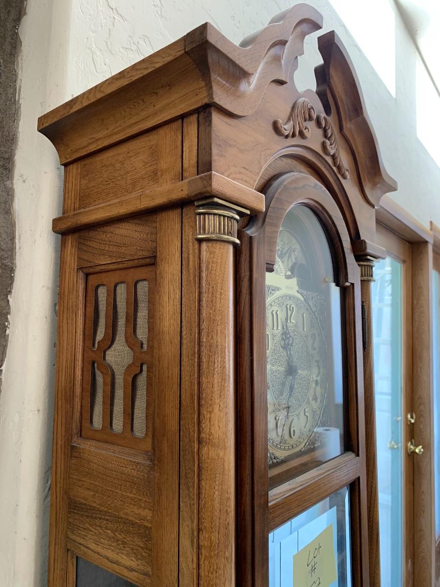 One Pearl grandfather clock made in the USA with a nautical theme, includes the door key. Has brass weights and pendulum. Appears to be great condition *untested*