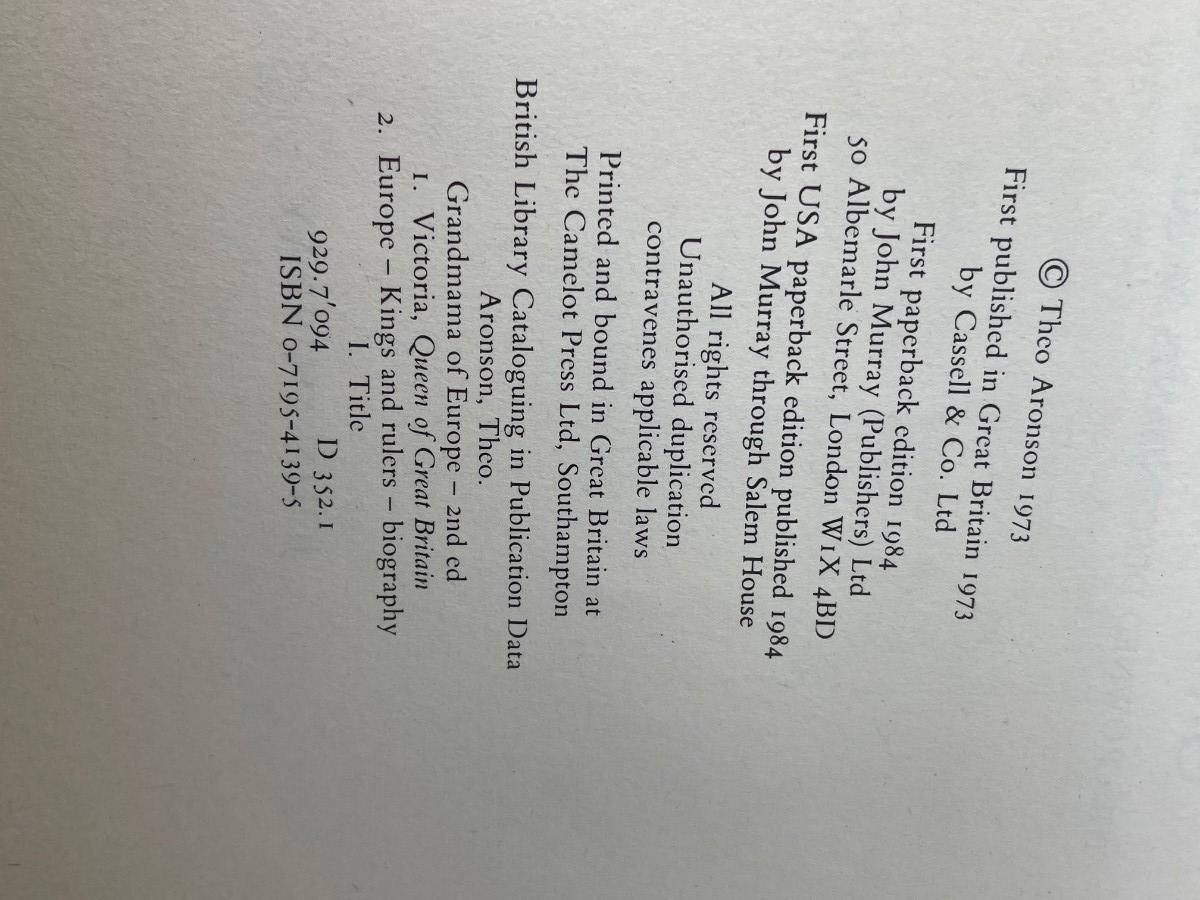Description: Grandma of Europe The Crowned Descendants of Queen Victoria by Theo Aronson Copyright 1973; Material: Paper