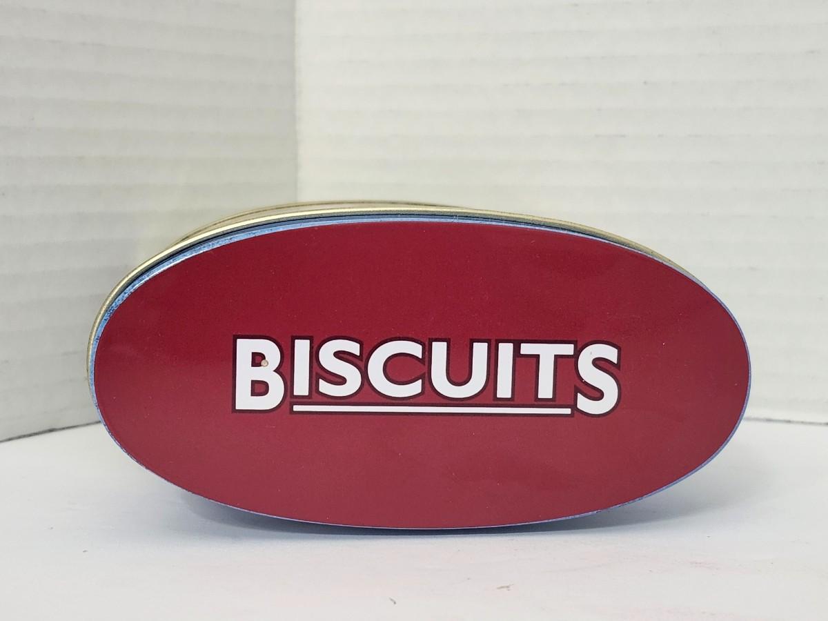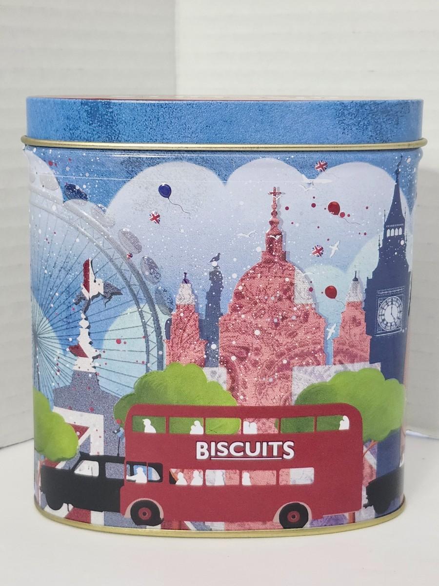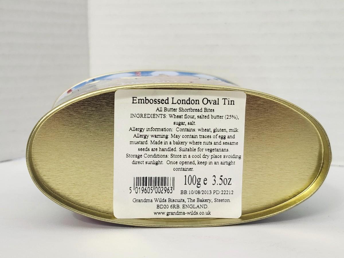 Embossed oval metal biscuit tin by Grandma Wild’s Biscuits featuring a London cityscape design with Big Ben, London Eye, double decker bus, and British flags. Originally contained all butter shortbread bites. Base label shows best before date 10 August 2013, confirming production period. Made in England. Empty collectible tin suitable for storage or display. All details described are taken directly from visible text and imagery on the tin.