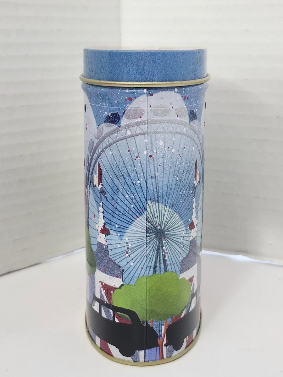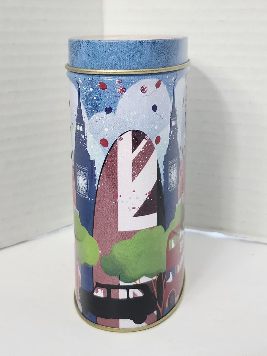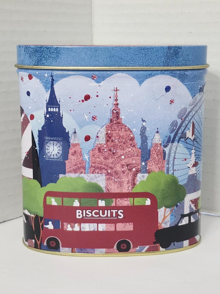 Embossed oval metal biscuit tin by Grandma Wild’s Biscuits featuring a London cityscape design with Big Ben, London Eye, double decker bus, and British flags. Originally contained all butter shortbread bites. Base label shows best before date 10 August 2013, confirming production period. Made in England. Empty collectible tin suitable for storage or display. All details described are taken directly from visible text and imagery on the tin.