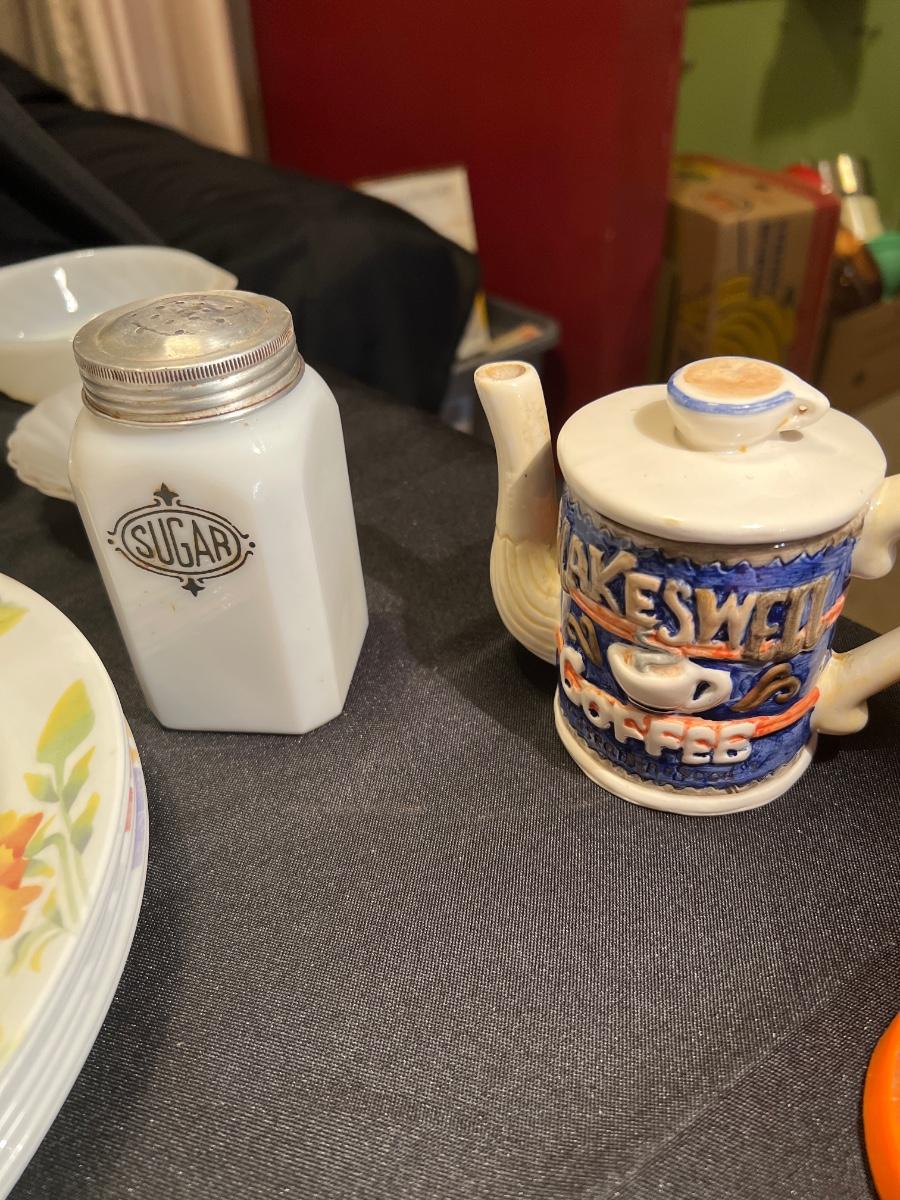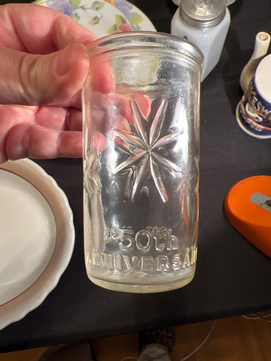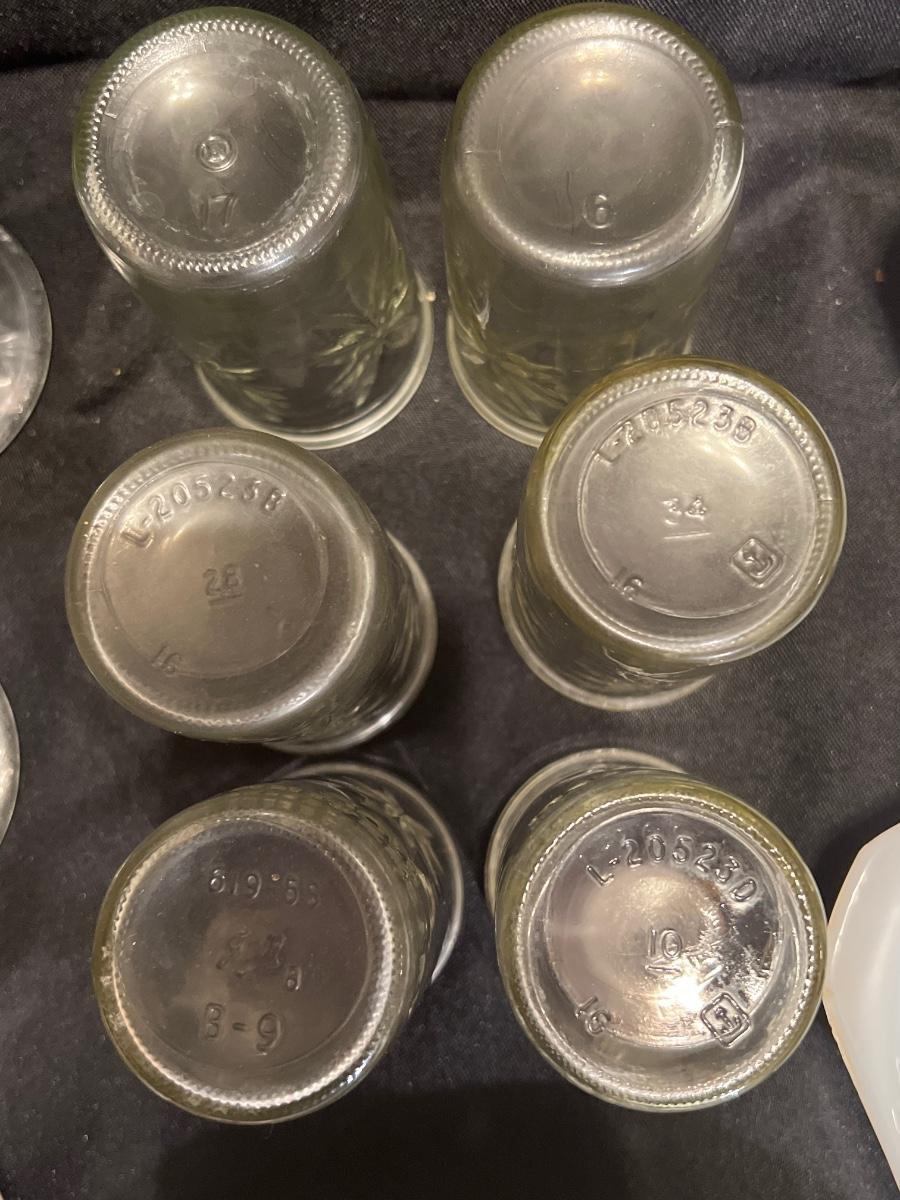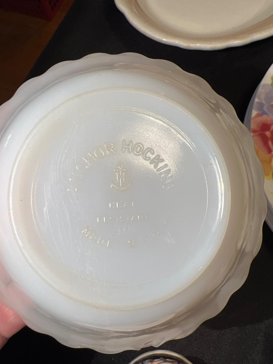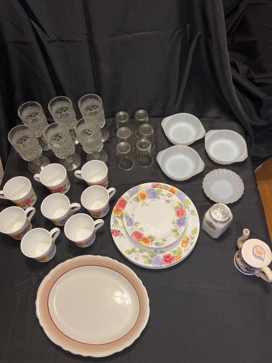 3 Fire King bowls, 1 Anchor Hocking, Corelle dishes/coffee cups, 2 50th anniversary cheese spread/jelly jar juice glasses. One is a Ball other Anchor Hocking others various. Look at pictures.
