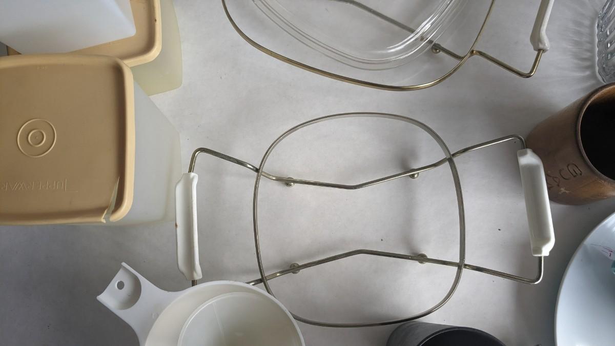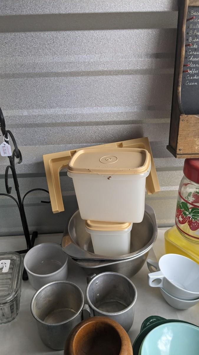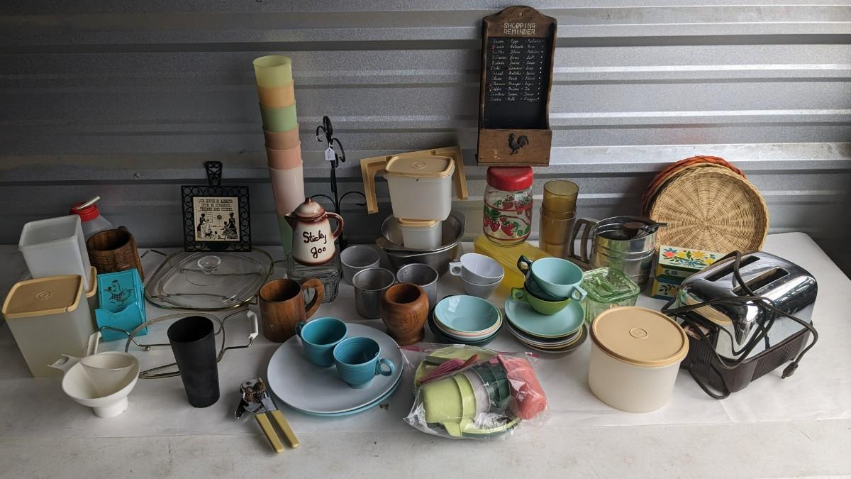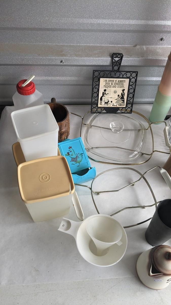 another nice little assortment of older kitchen items. Includes fridge dishes (yellow piece is plastic not pyrex!) tupperware, melmac, a cute older GE toaster (untested) and more! No shipping 2616