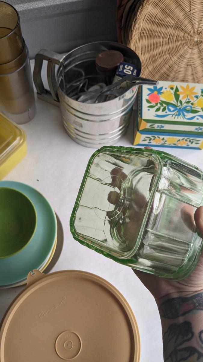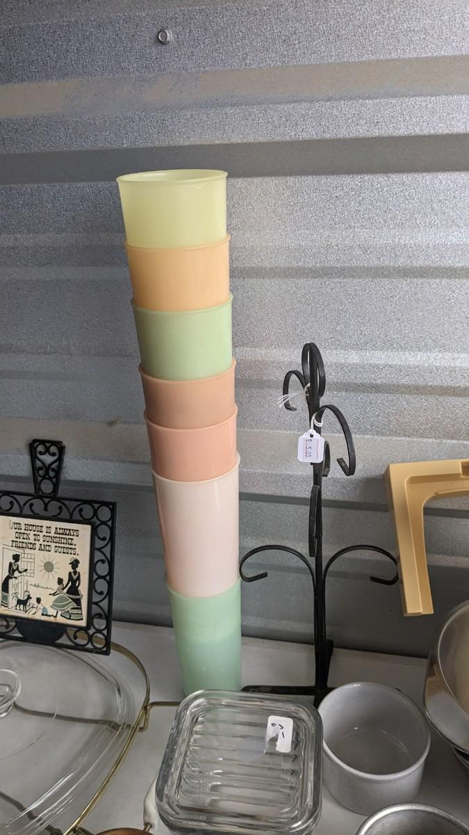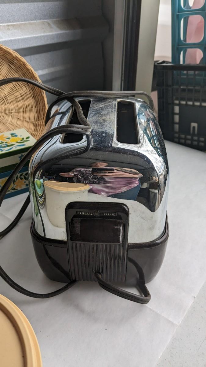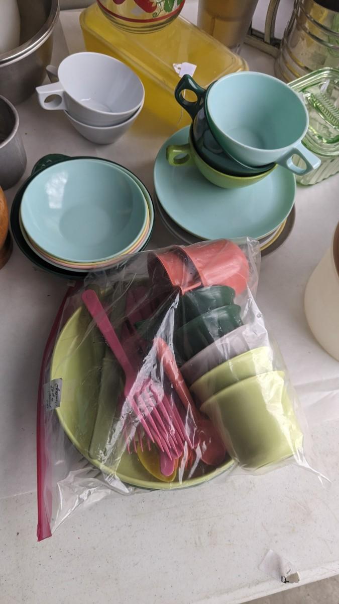 another nice little assortment of older kitchen items. Includes fridge dishes (yellow piece is plastic not pyrex!) tupperware, melmac, a cute older GE toaster (untested) and more! No shipping 2616