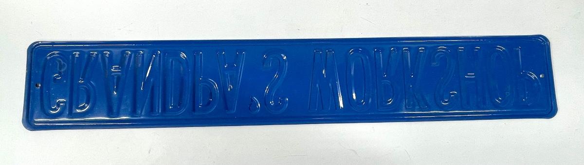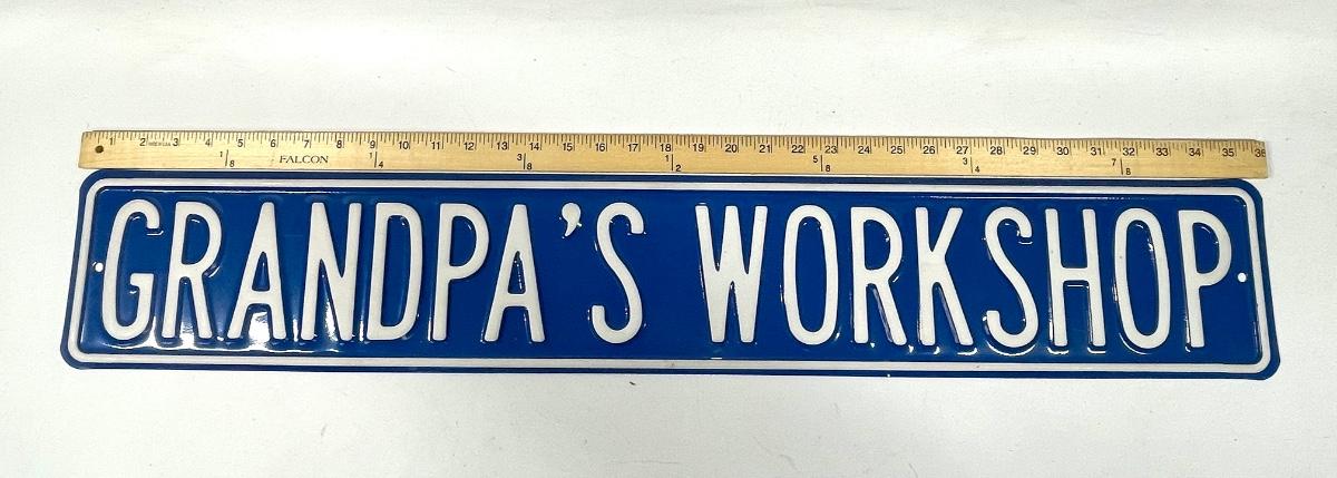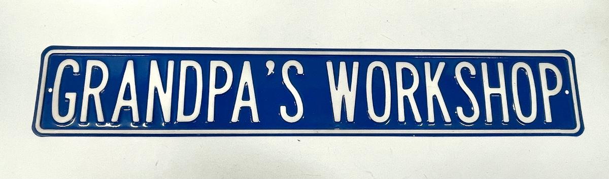 Grandpa’s Work Shop blue and white lettering metal road sign