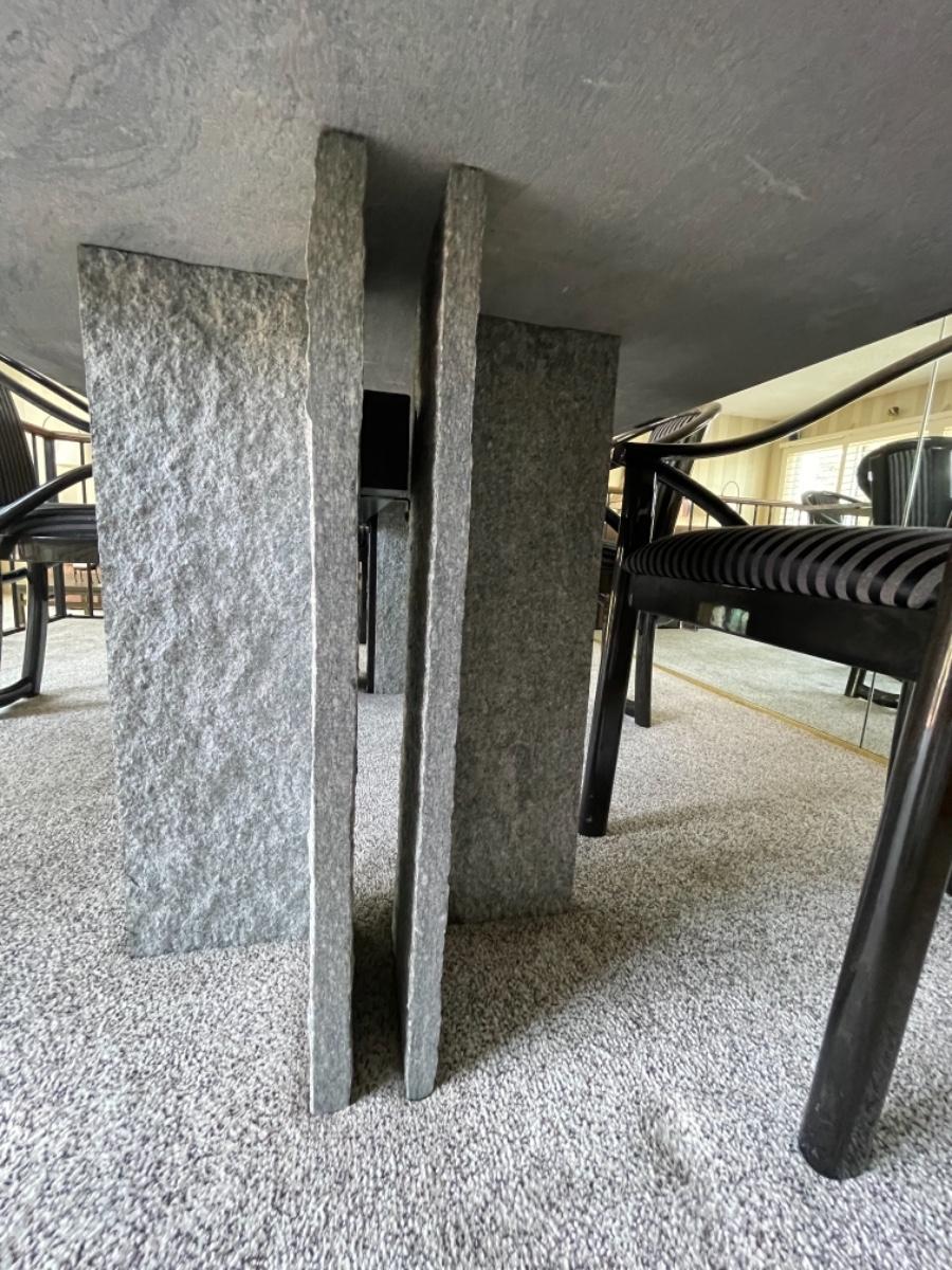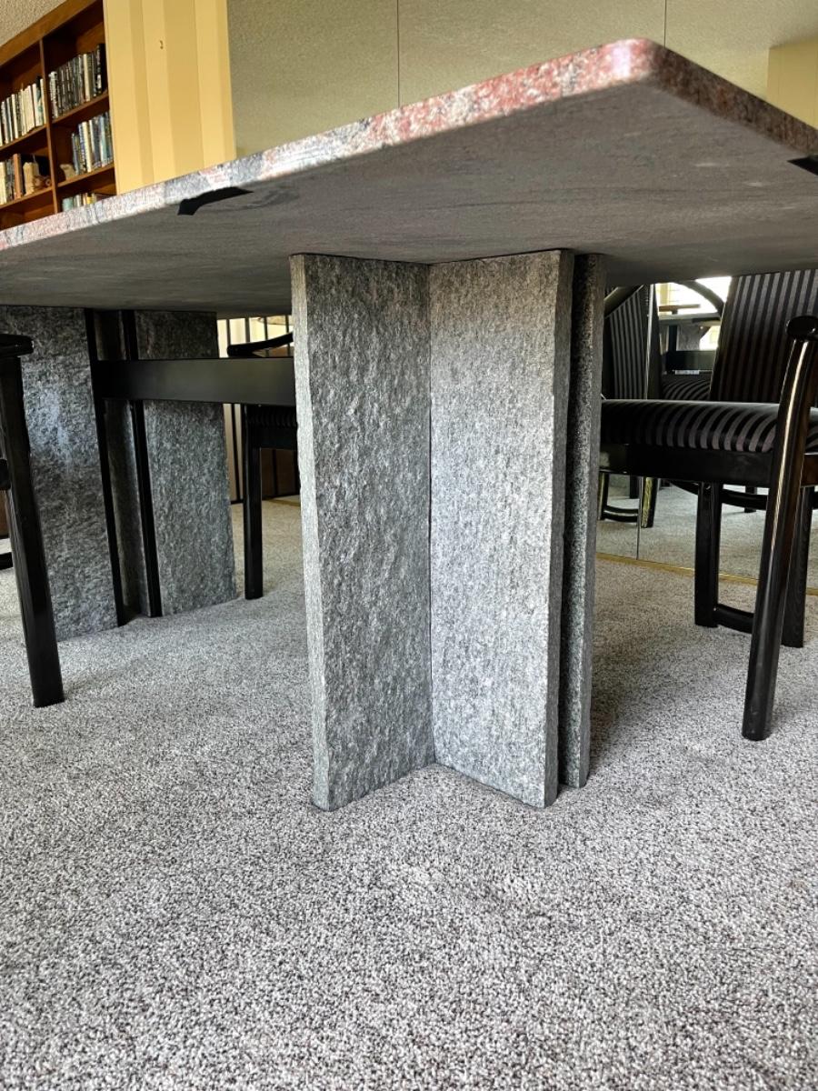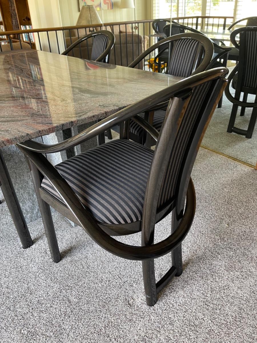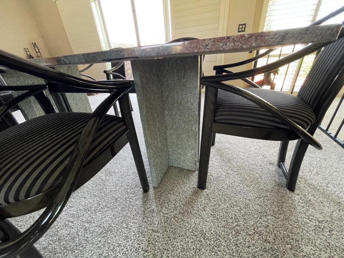 This Pristine Granite Slab dining table was custom made in the 1980’s and is absolutely flawless. It comes from an immaculate home. The table is a red, gray and black striated pattern with grey speckled granite legs. The table comes with 6 chairs made of lacquered ash and upholstered in grey and black stripes. They are like new, no stains, rips or tears. Chairs look like they have never been sat in. Table measures 78” L x 40” W. Buyer must arrange for pick up and delivery of this item. Serious buyers only must make appointment for viewing.