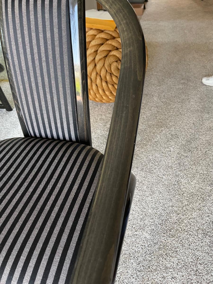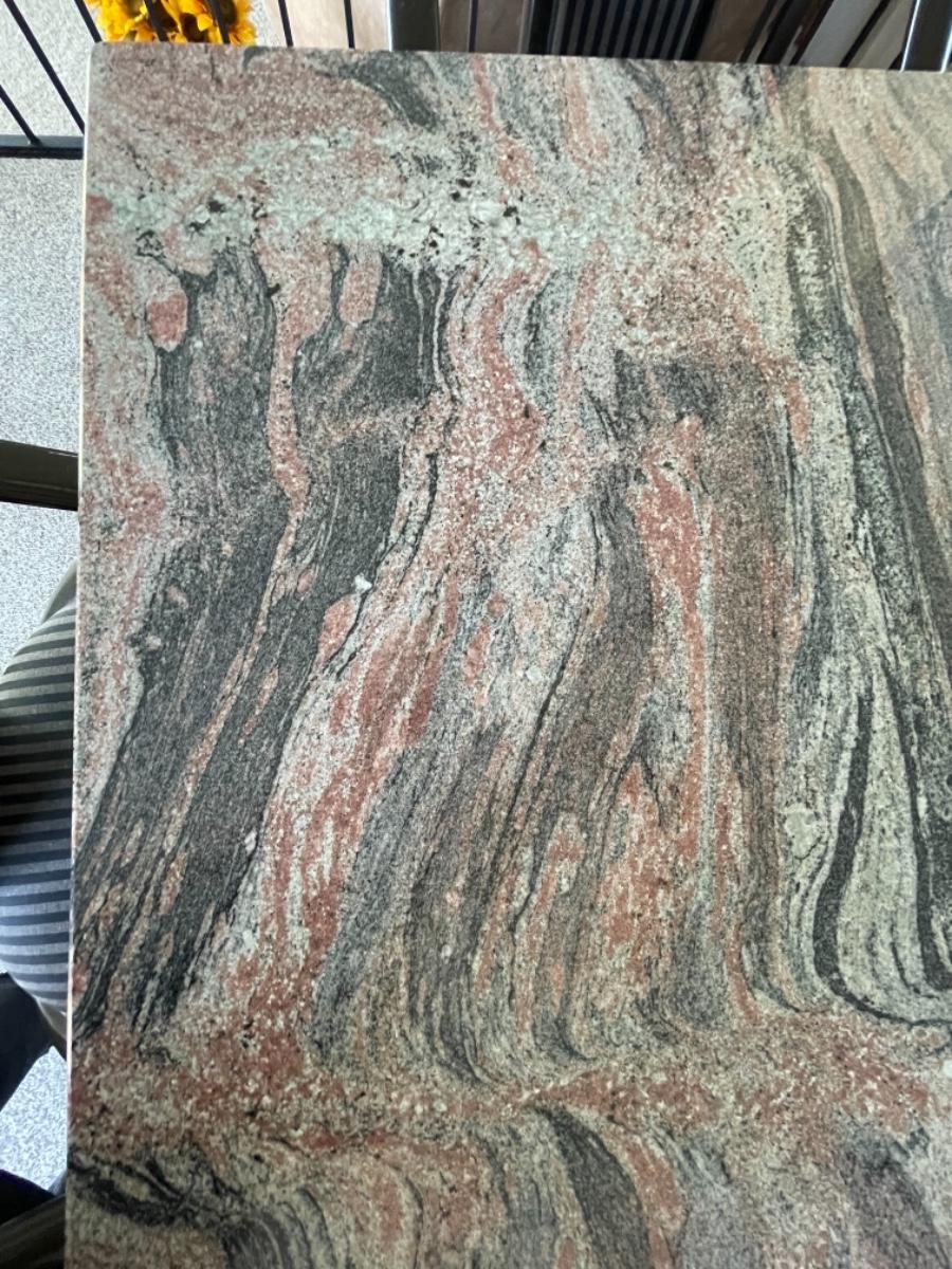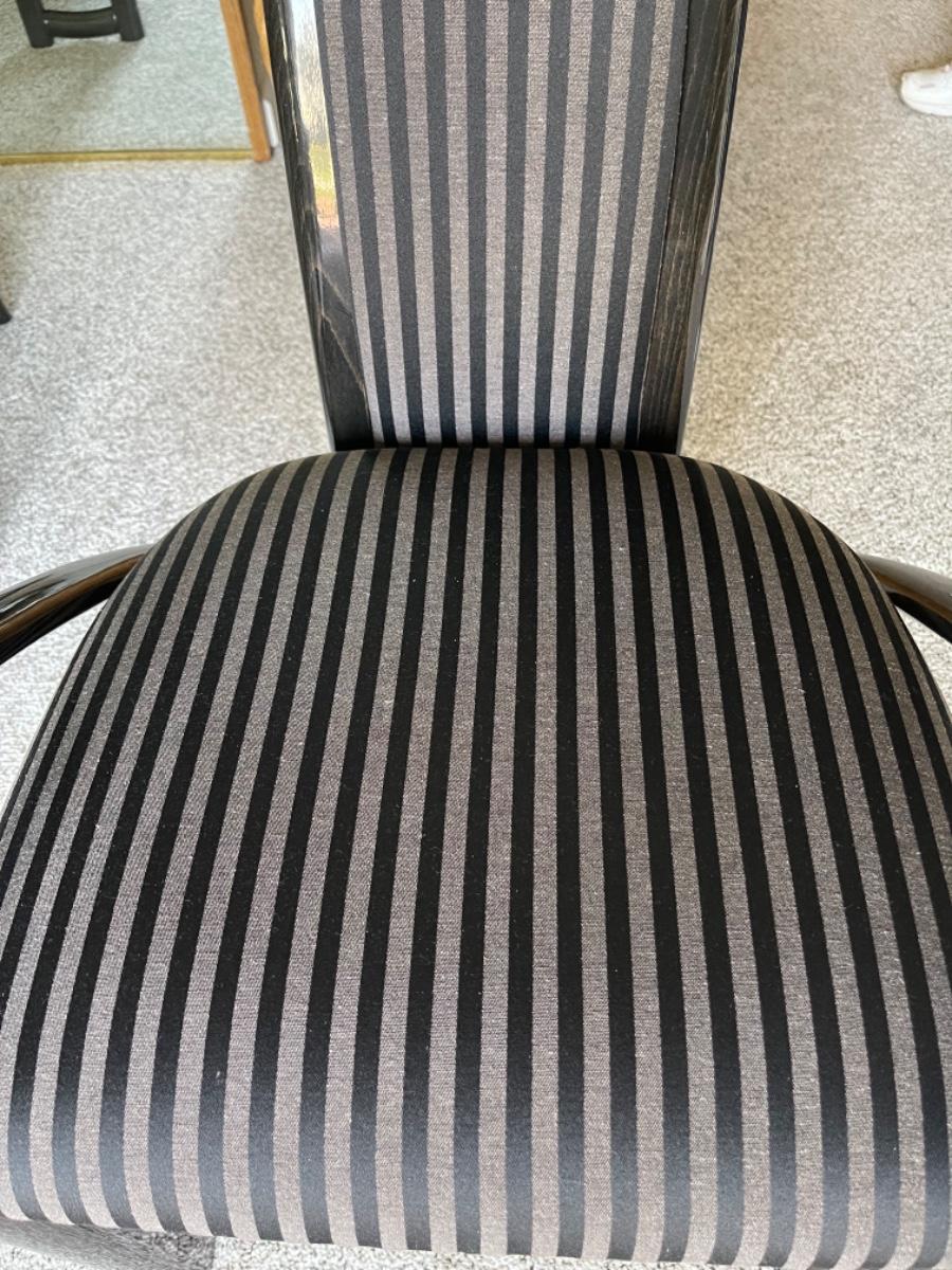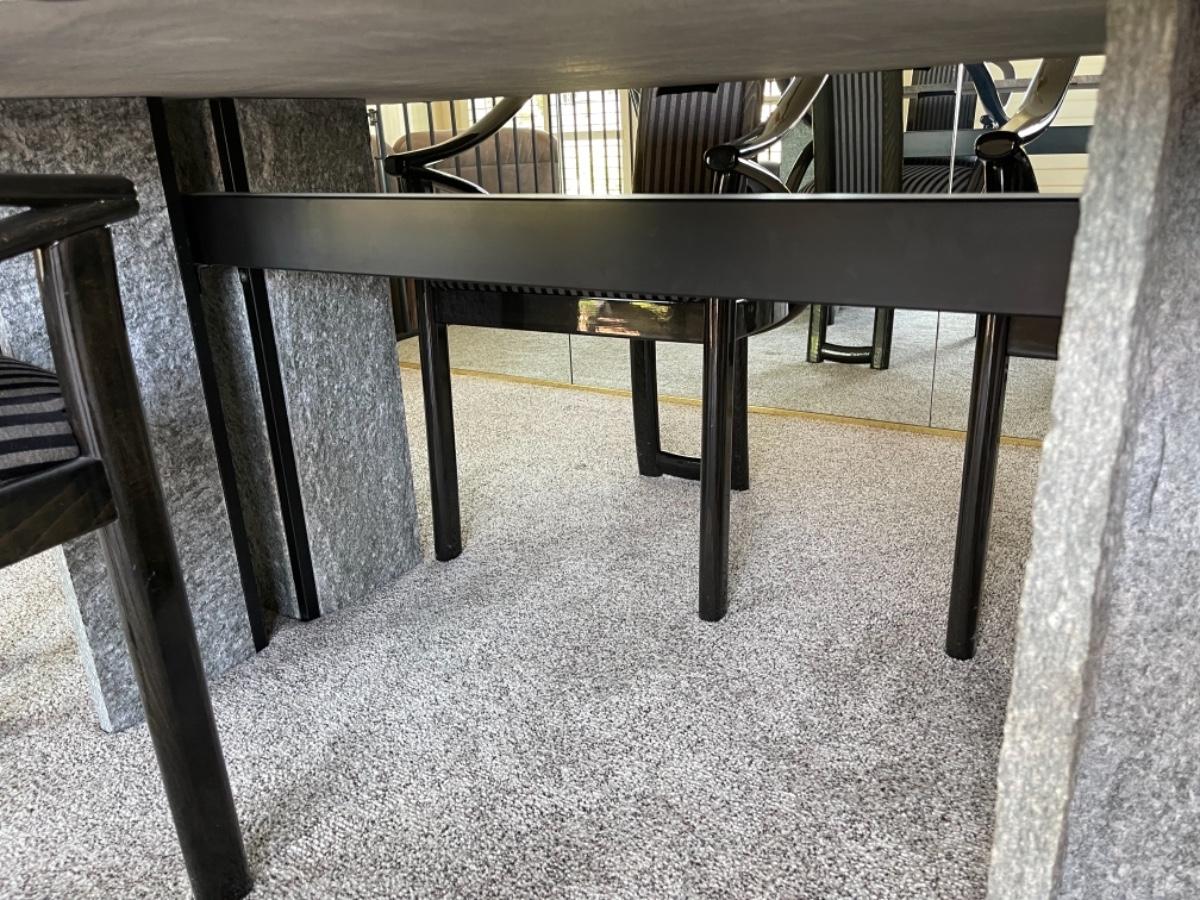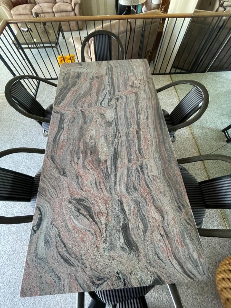 This Pristine Granite Slab dining table was custom made in the 1980’s and is absolutely flawless. It comes from an immaculate home. The table is a red, gray and black striated pattern with grey speckled granite legs. The table comes with 6 chairs made of lacquered ash and upholstered in grey and black stripes. They are like new, no stains, rips or tears. Chairs look like they have never been sat in. Table measures 78” L x 40” W. Buyer must arrange for pick up and delivery of this item. Serious buyers only must make appointment for viewing.