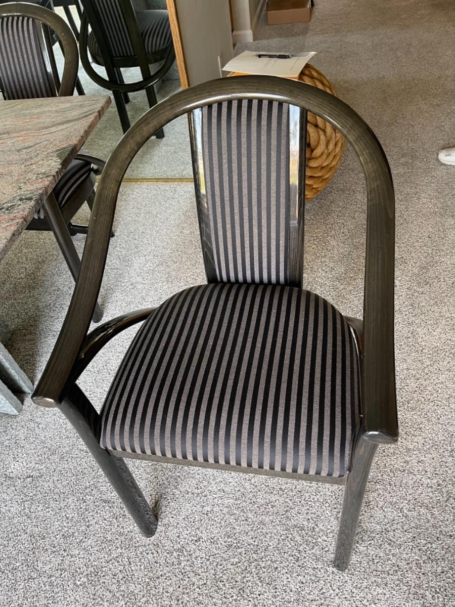 Granite Slab dining table with 6 ;acquired ash chairs upholstered in black and grey stripes.