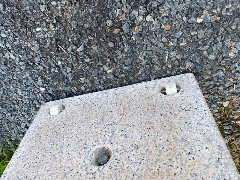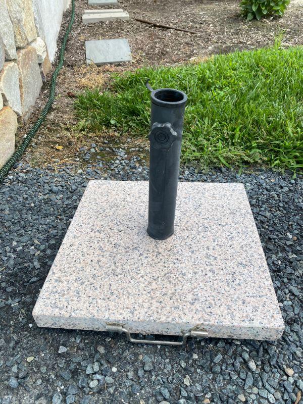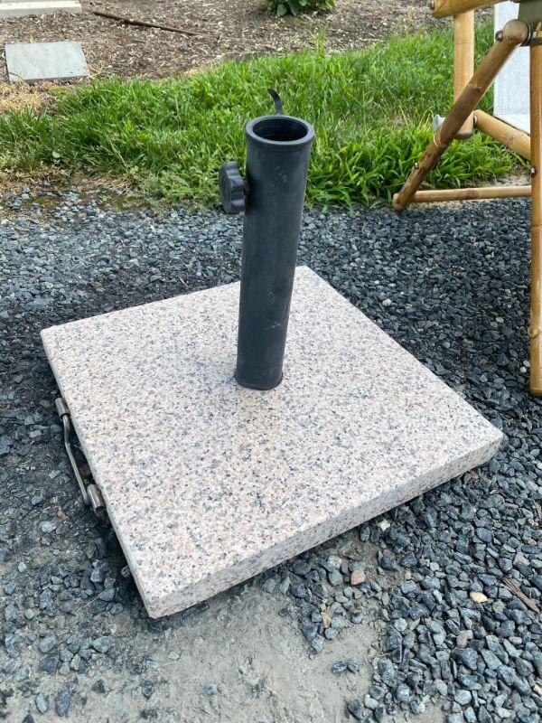 Granite Umbrella stand with handle on side and two wheels measures 17" square