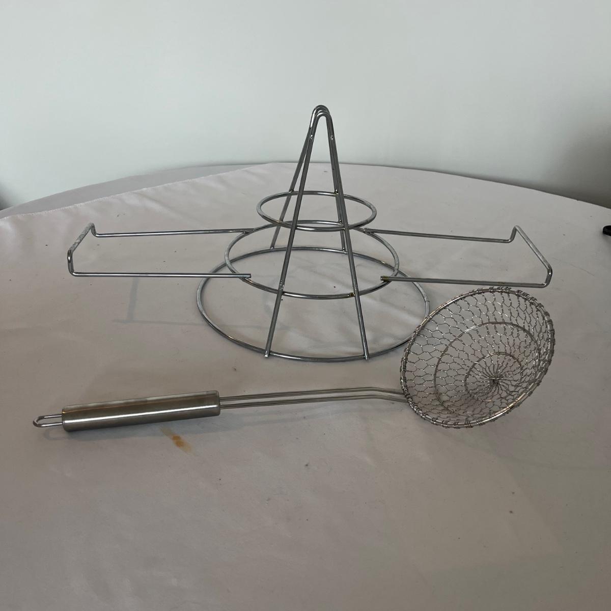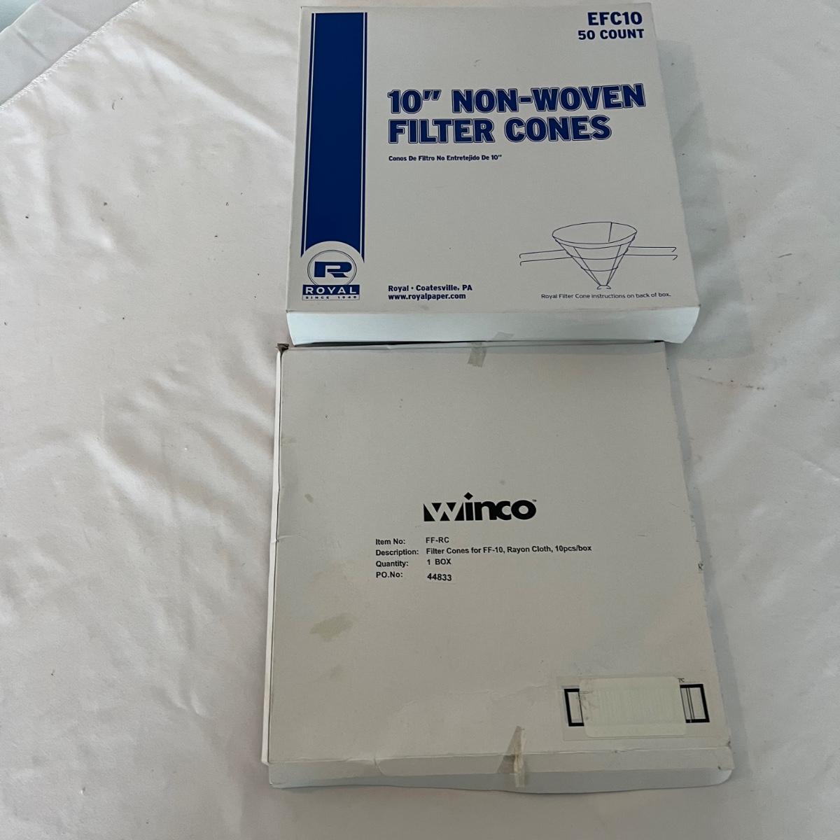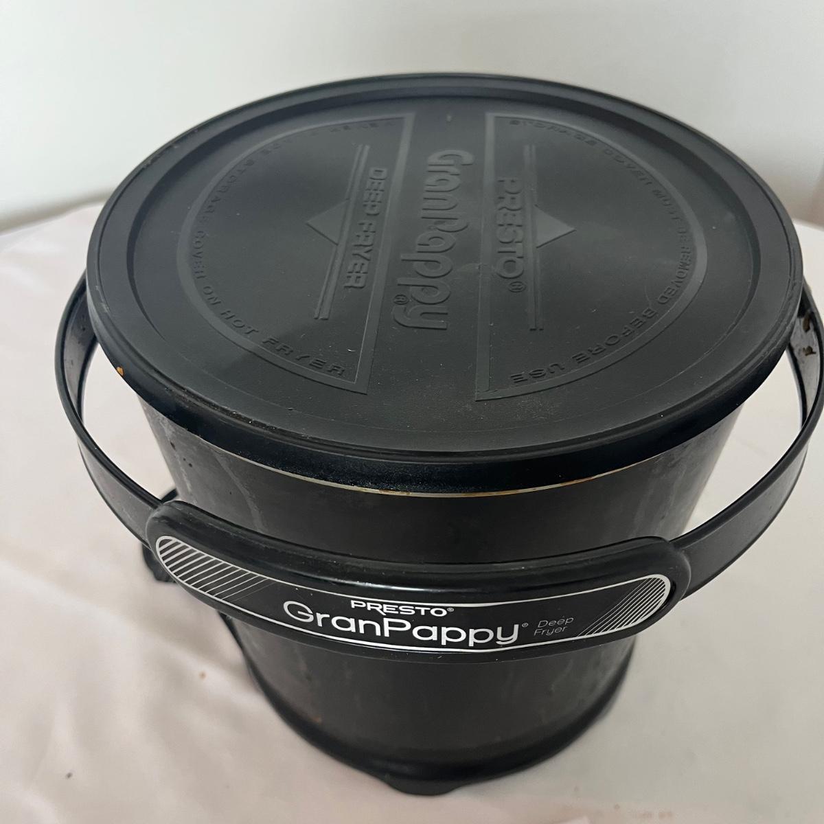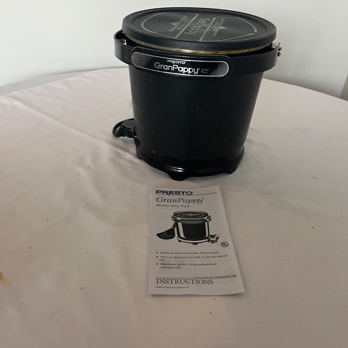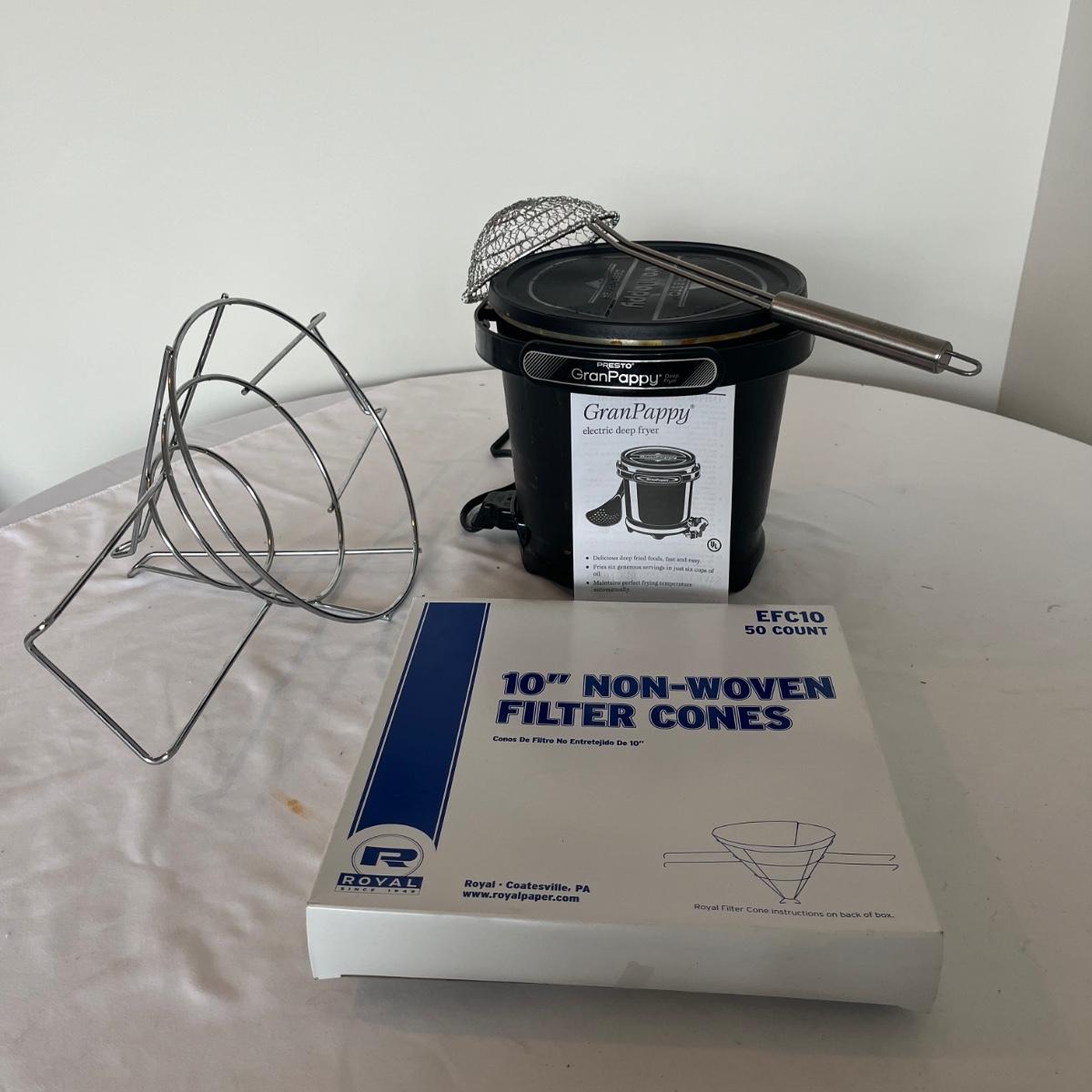 Lot includes a Granpappy electric deep fryer with fryer filter stand and filter cones. Fryer powered on when tested. Fryer measures 9”D x 8.5” tall.