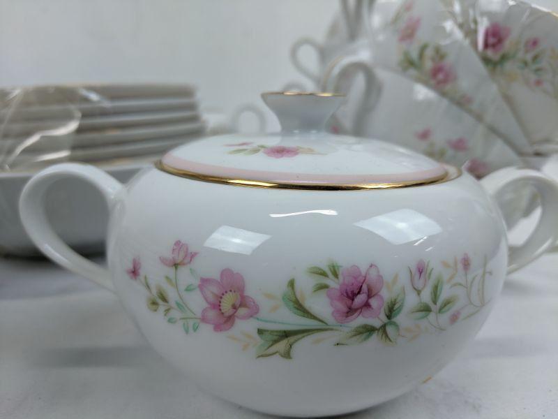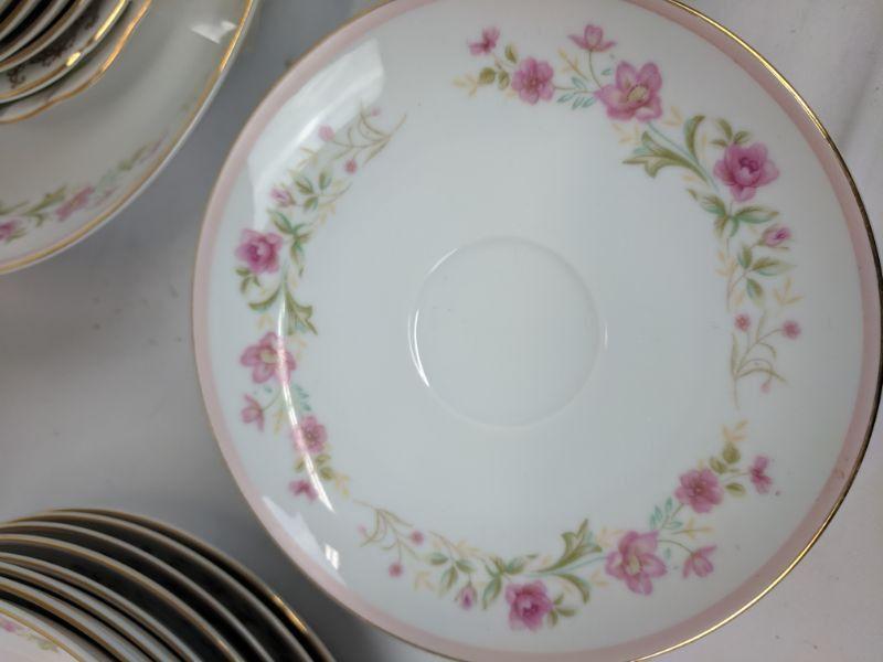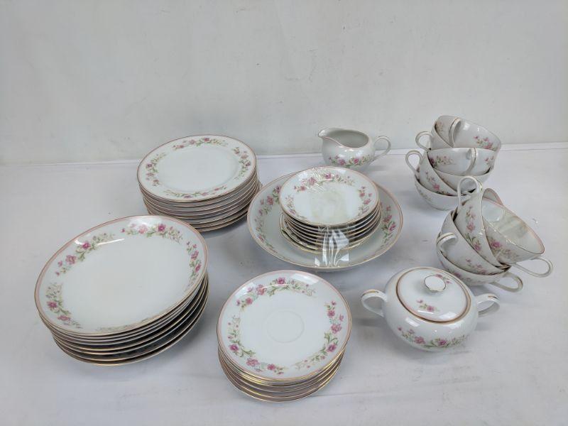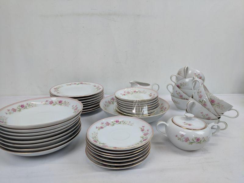 Grant Crest Fine China, Pink Flowers: 8 Bowls. 15 Plates, 1 Serving Bowl, 1 Gravy Dish, 1 Sauce Dish, 10 Cups