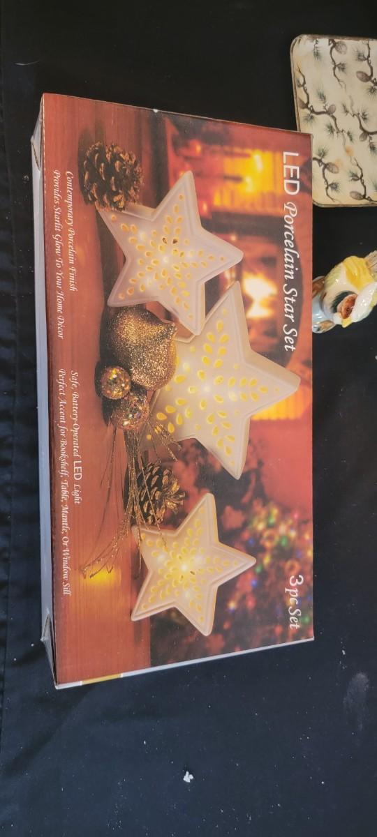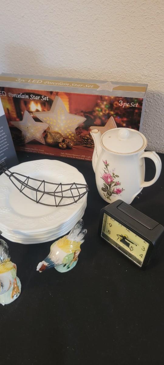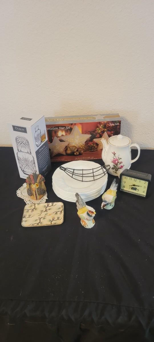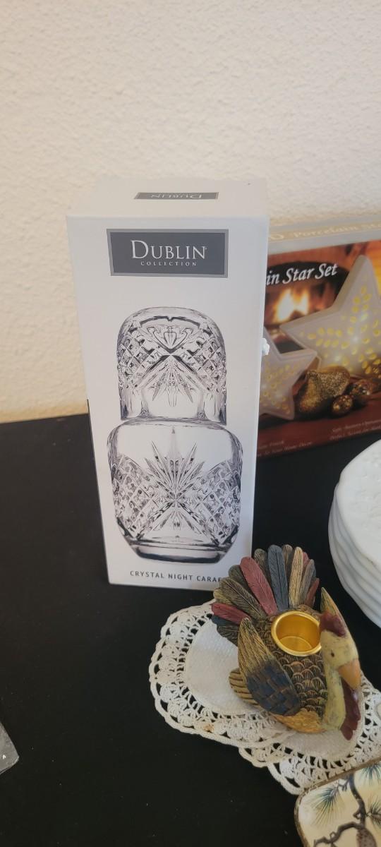 NIB Dublin Crystal Night Carafe, NIB porcelain star set, six milk glass plates grape pattern