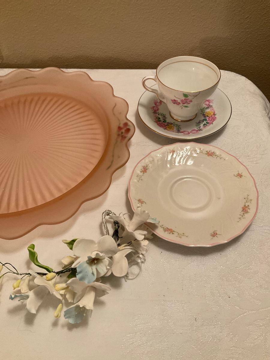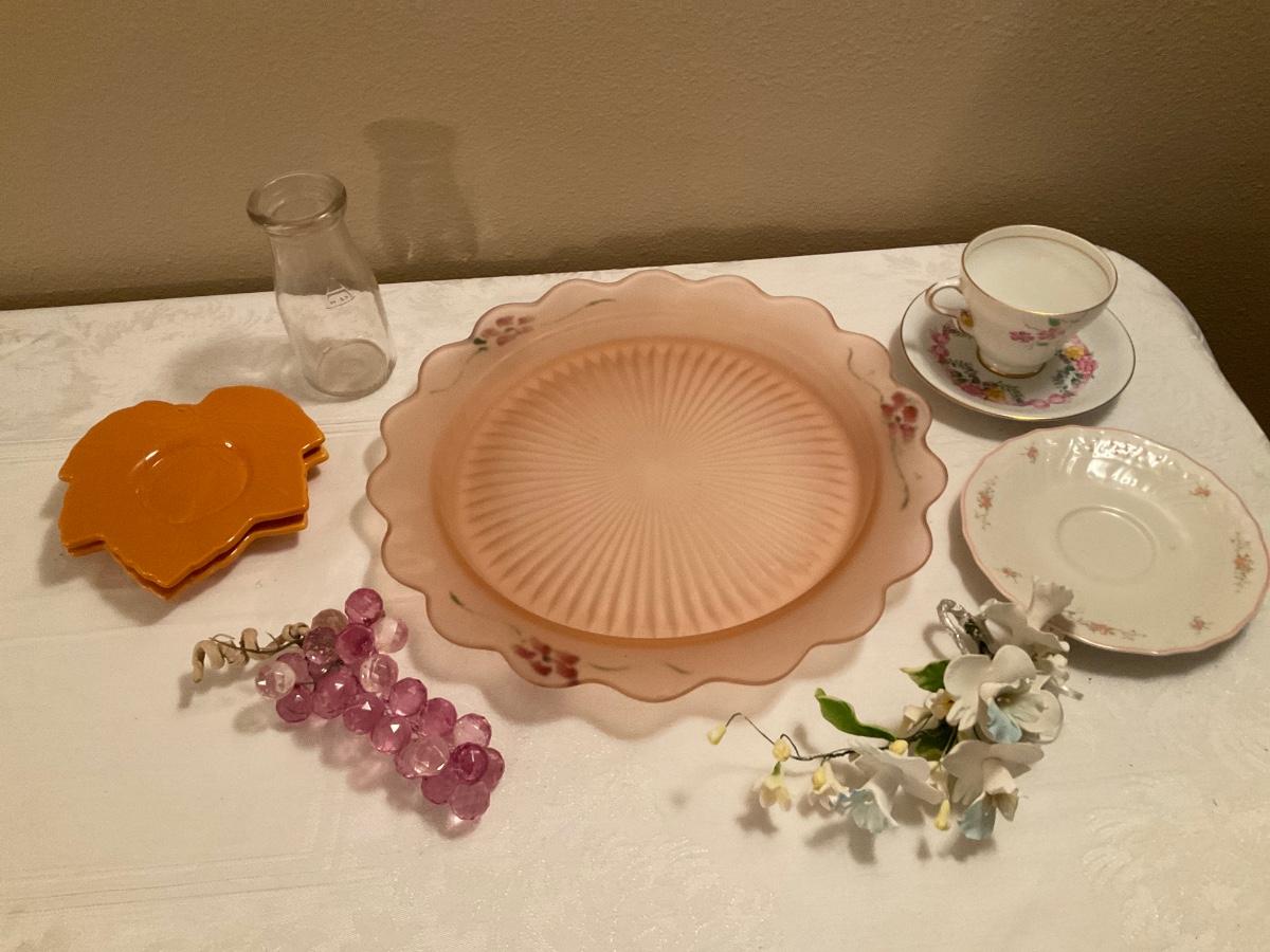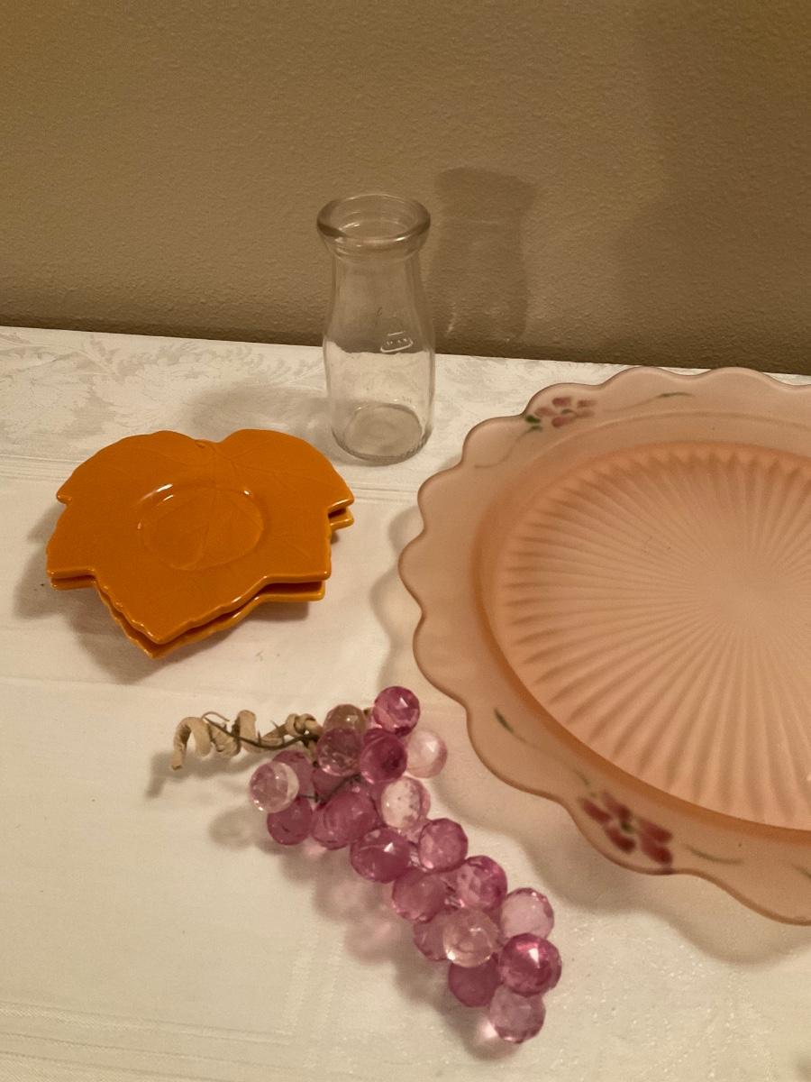 Grapes, pink tray, teacup, bottle