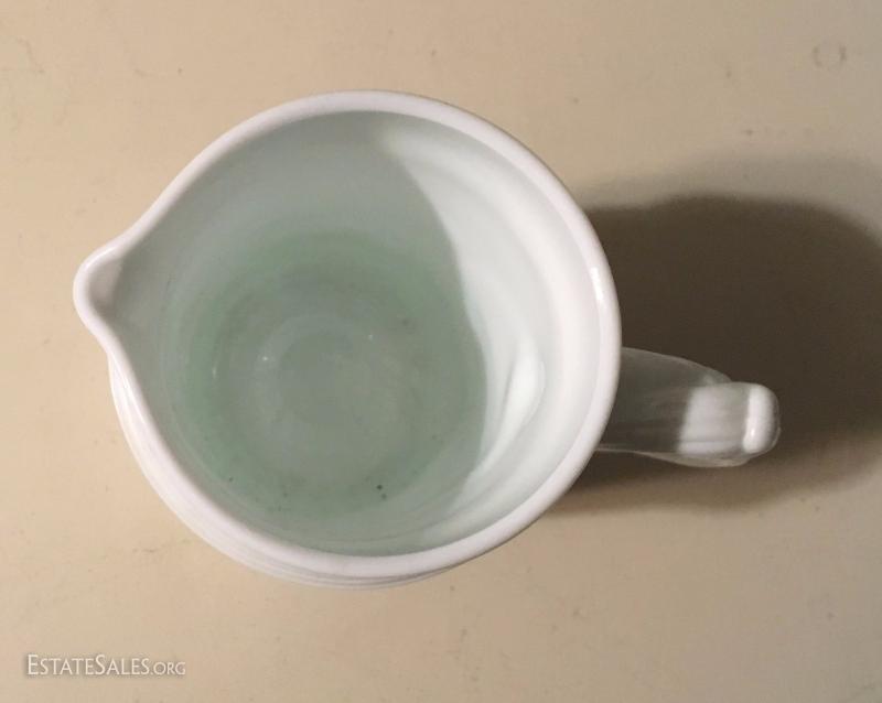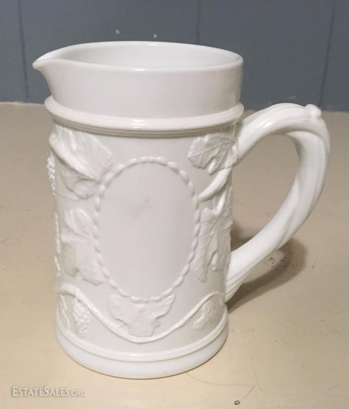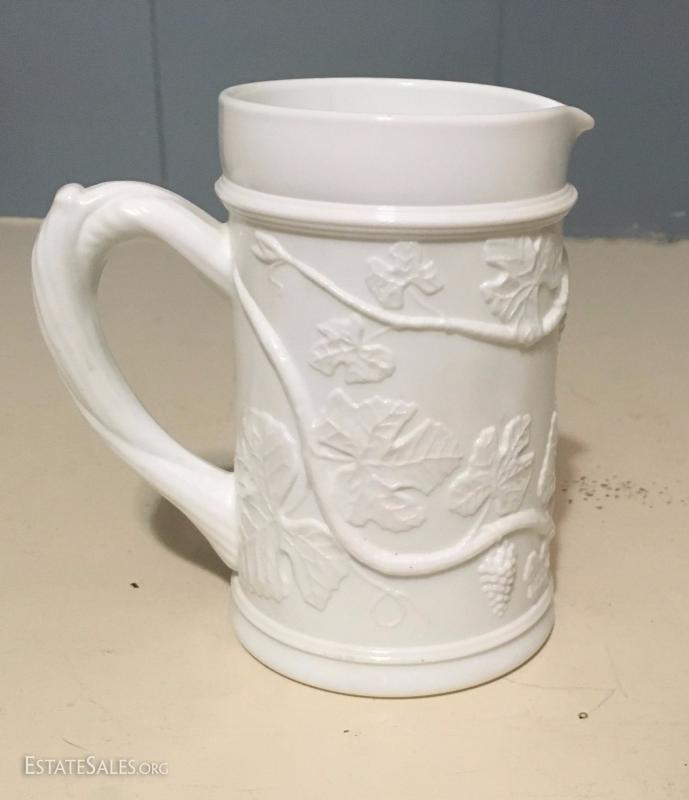 This milk glass pitcher is adorned with a grapevine pattern and measures 5 inches tall.