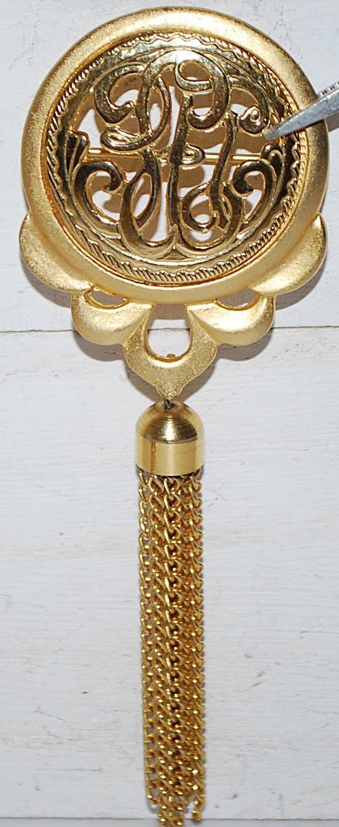 Graphic Designed Brushed Gold Colored Circle BROOCH (3¾" x 1½") with Dangle Chains on a Gold Tone Setting