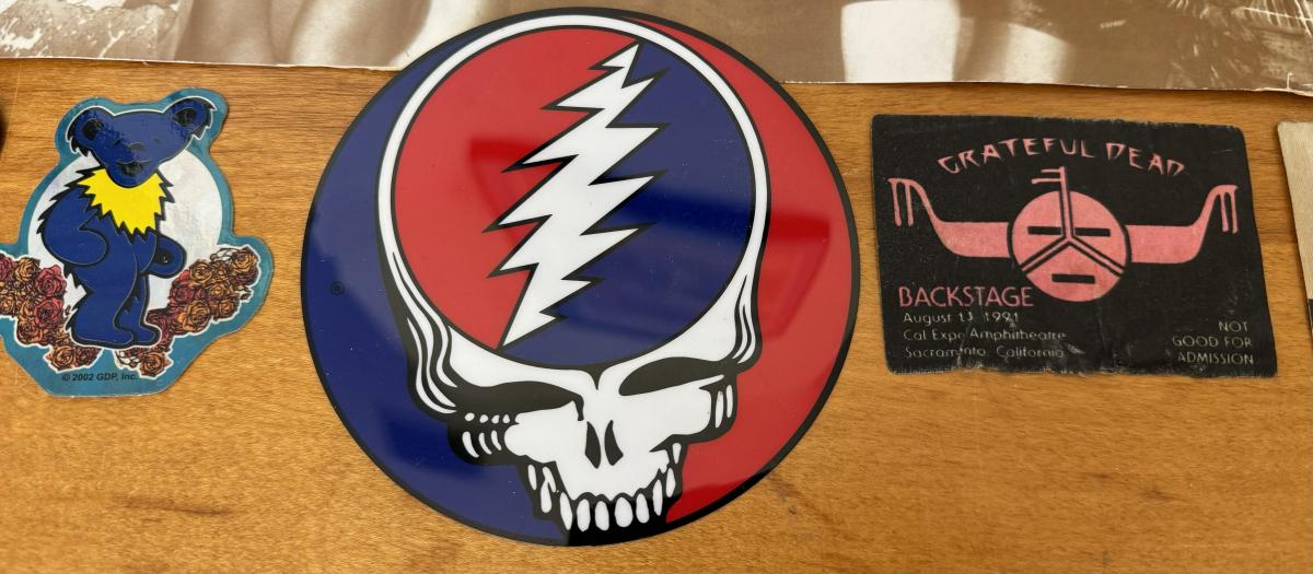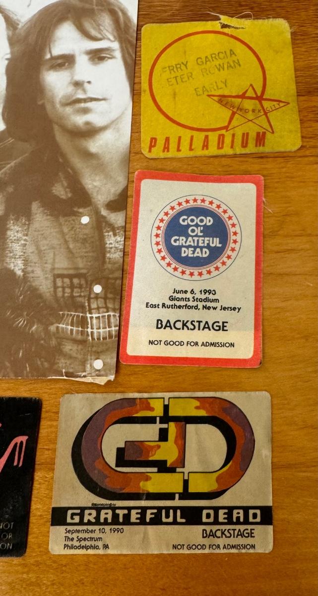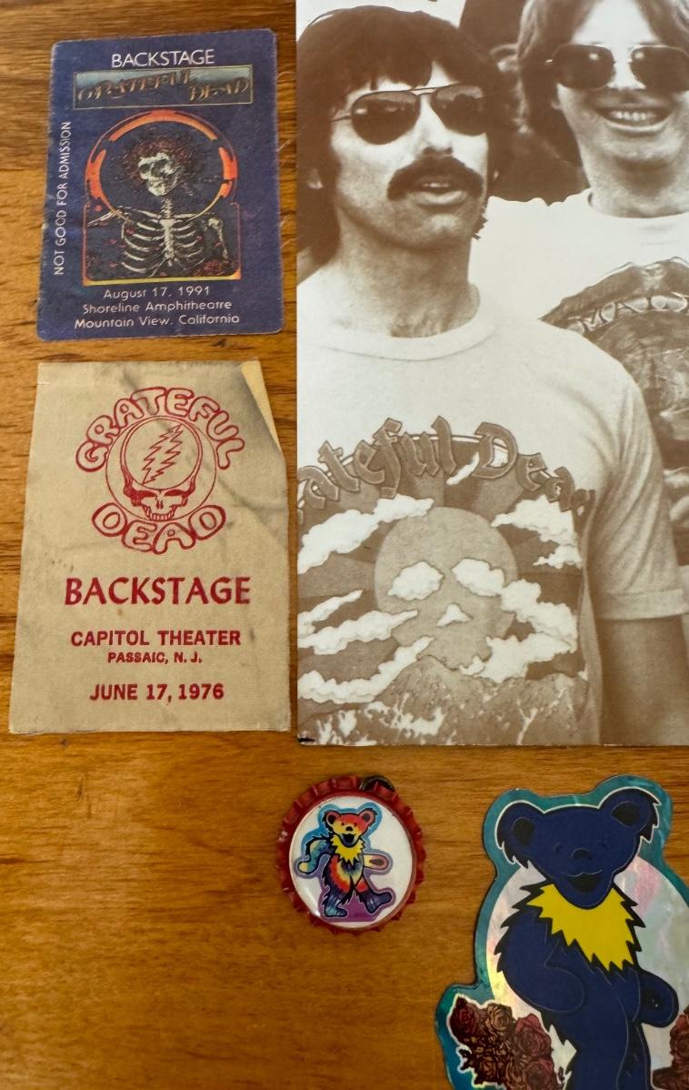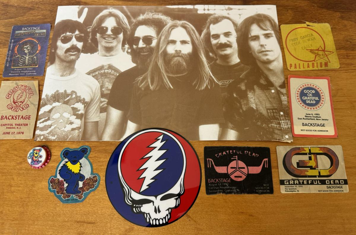 Grateful Dead assortment includes 10 pieces: backstage passes, stickers, bottle cap, and group photo.