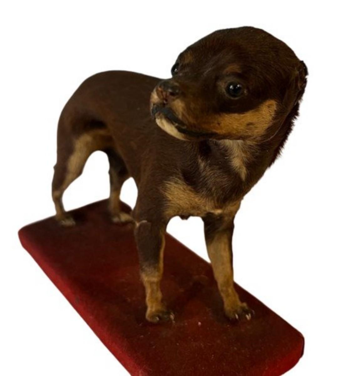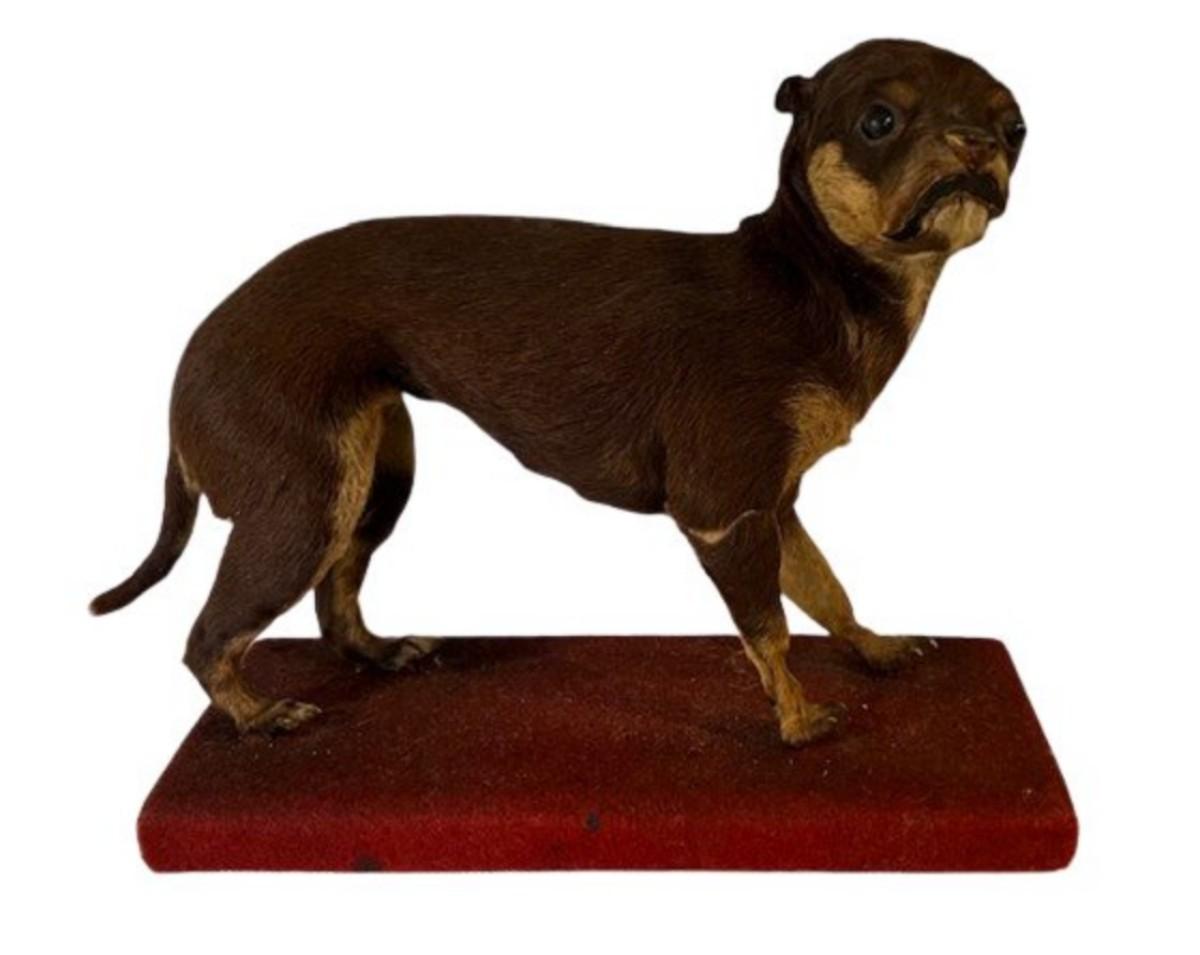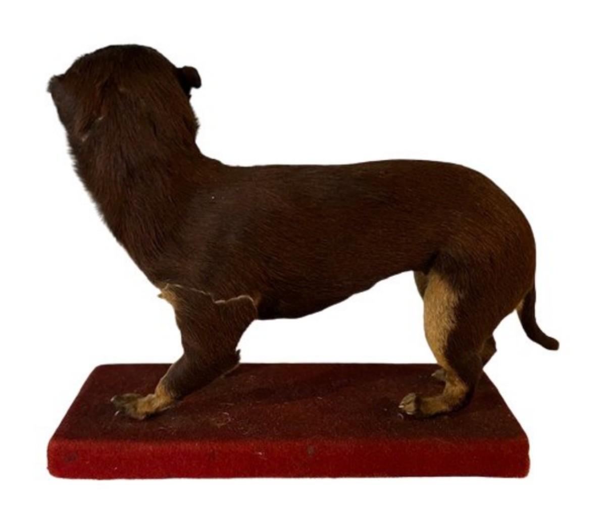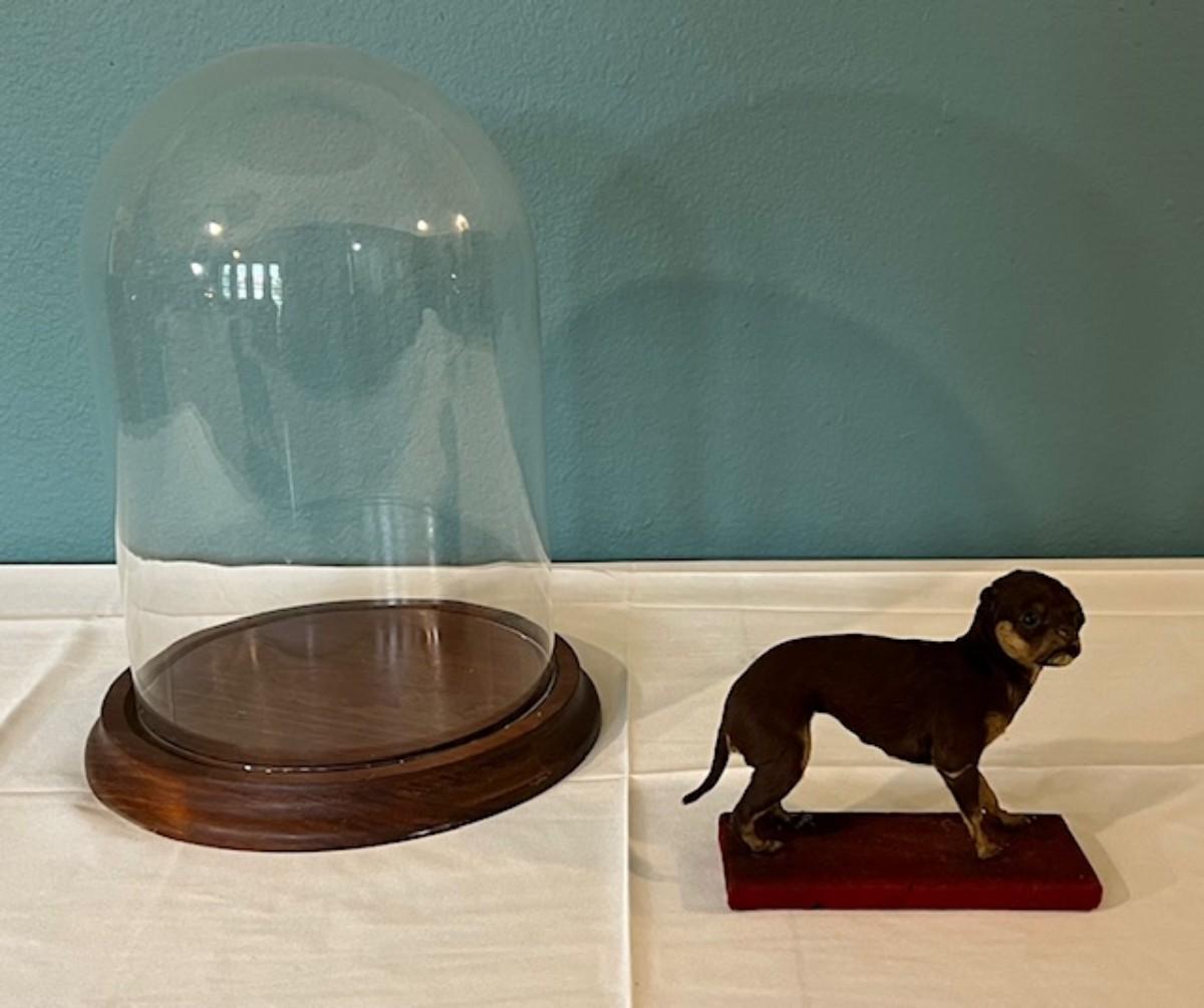 From the first person collection of Corky Laing of the band "Mountain." Allegedly, Corky Laing had his stillborn puppy preserved with taxidermy. Includes glass dome. Measurement of puppy: 5"H x 6"L.