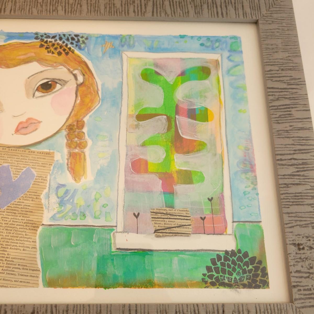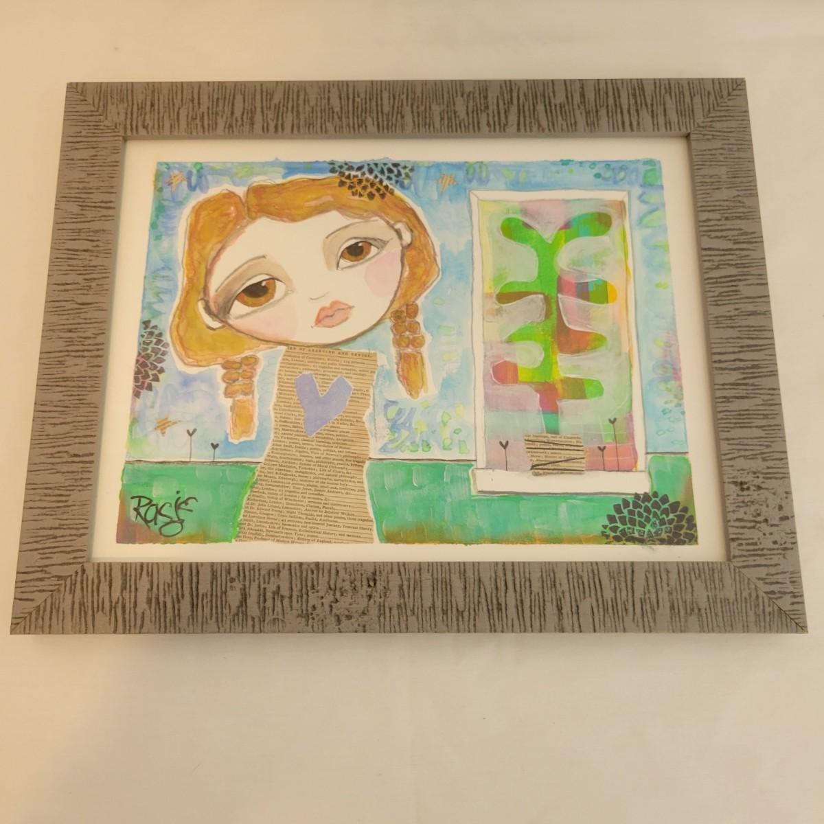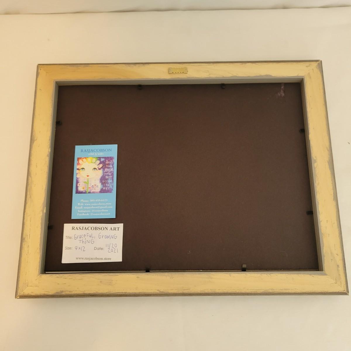 A framed, original piece of mixed media art by Ras Jacobson. It is framed in a contemporary wooden frame that is gray with dark gray accents. It measures approximately 11" x 14". Shipping available. Shipping can be costly. We suggest contacting our preferred local shipping provider, Postage Express, with dimensions and getting an estimate before bidding: (828) 670-5501 or postageexpress@yahoo.com.
