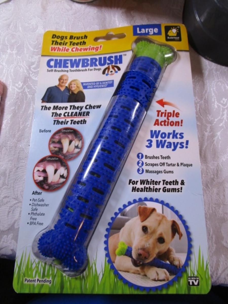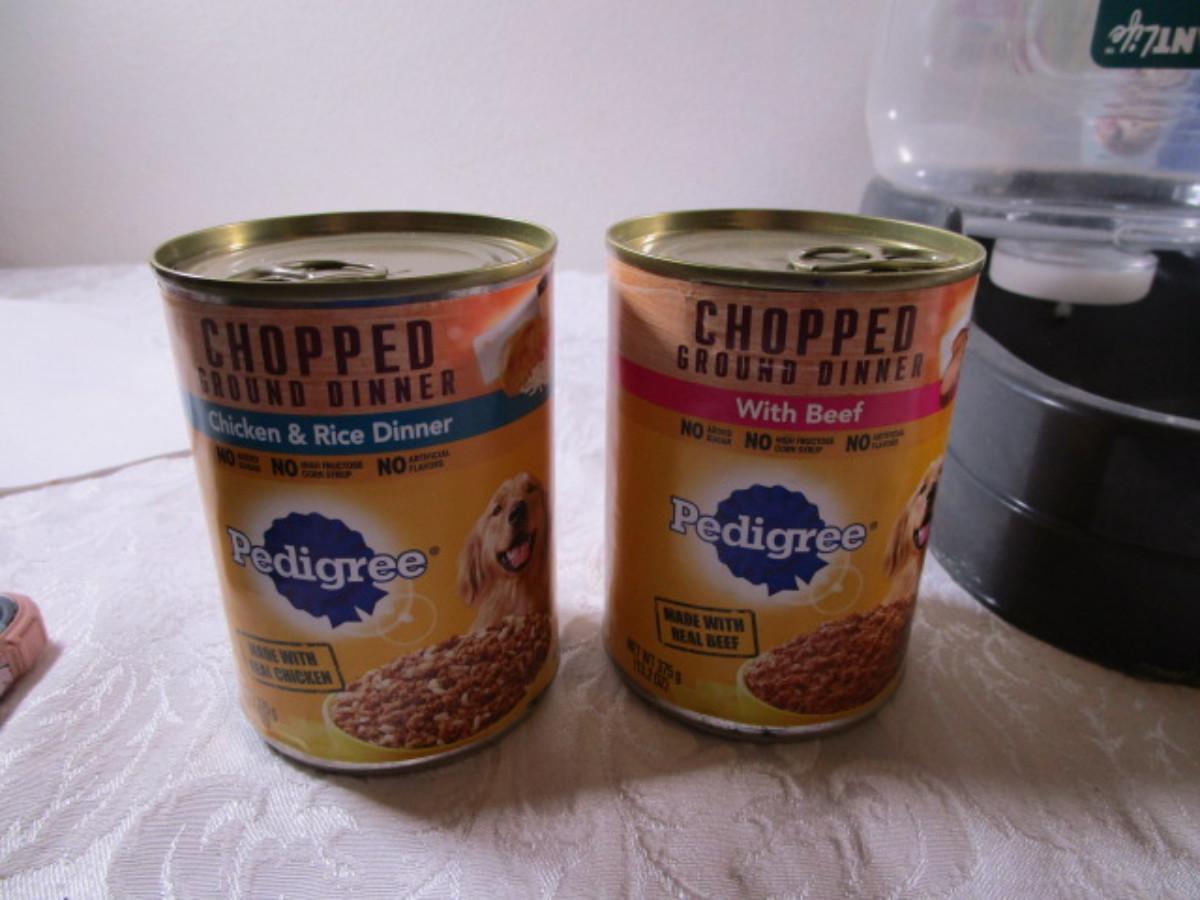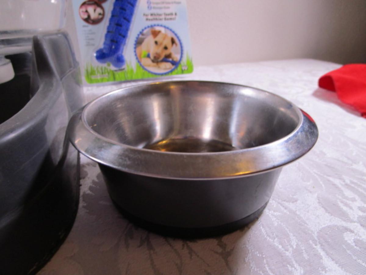 Gravity pet waterer, pet food dish, chewbrush, 2 cans dog food