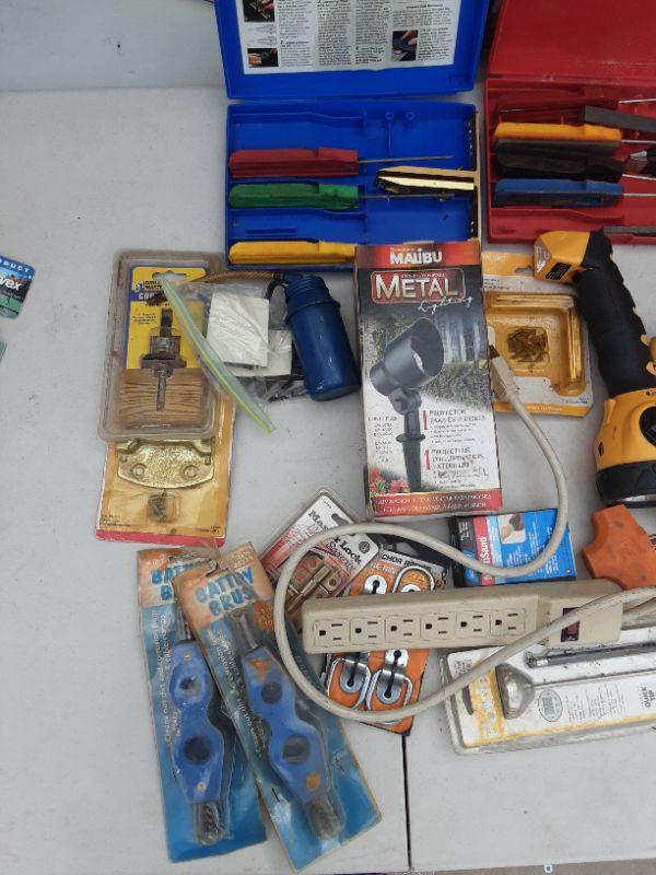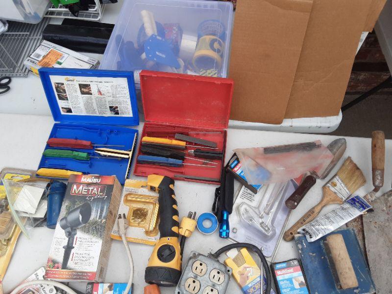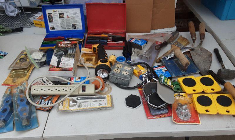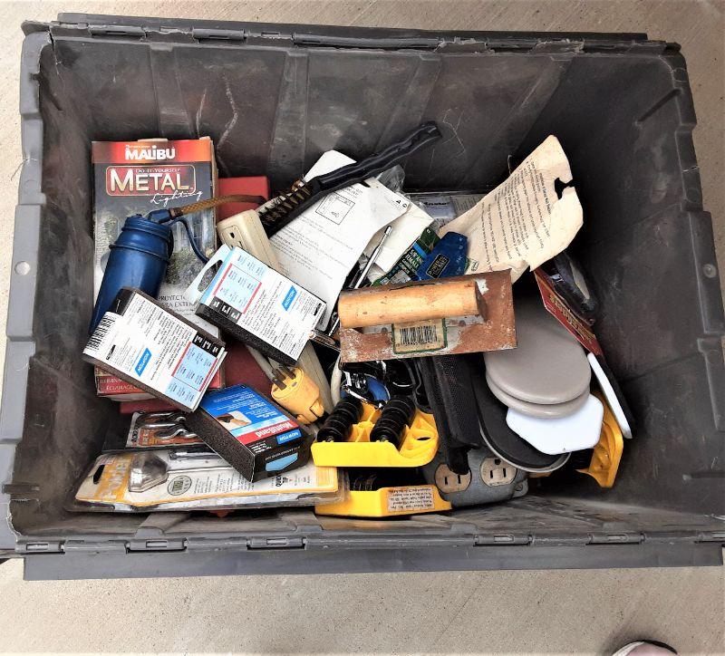 Gray Bin/contents as shown - flashlights, furniture movers, spade, knife sharpening kit, multisand, paintbrushes, etc.