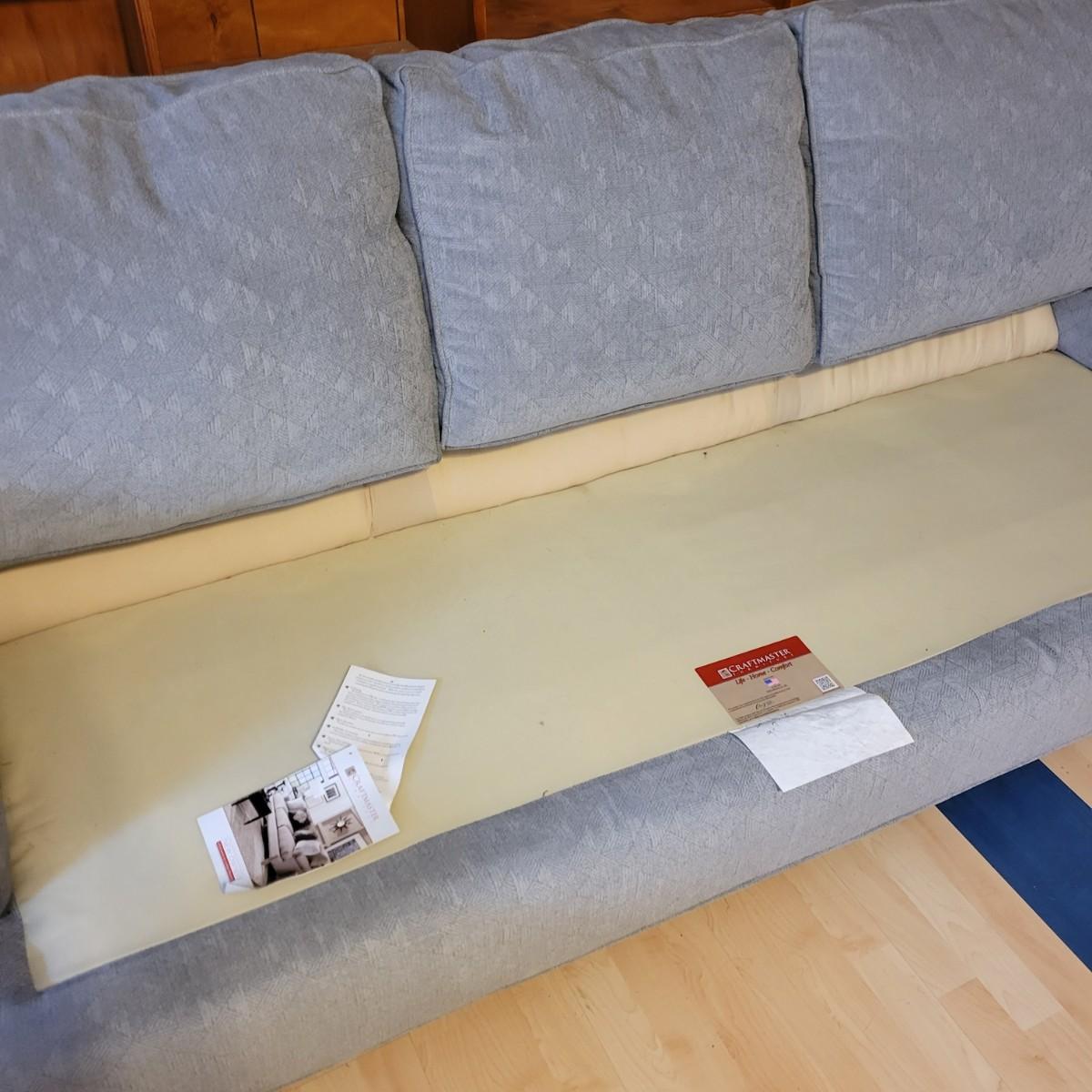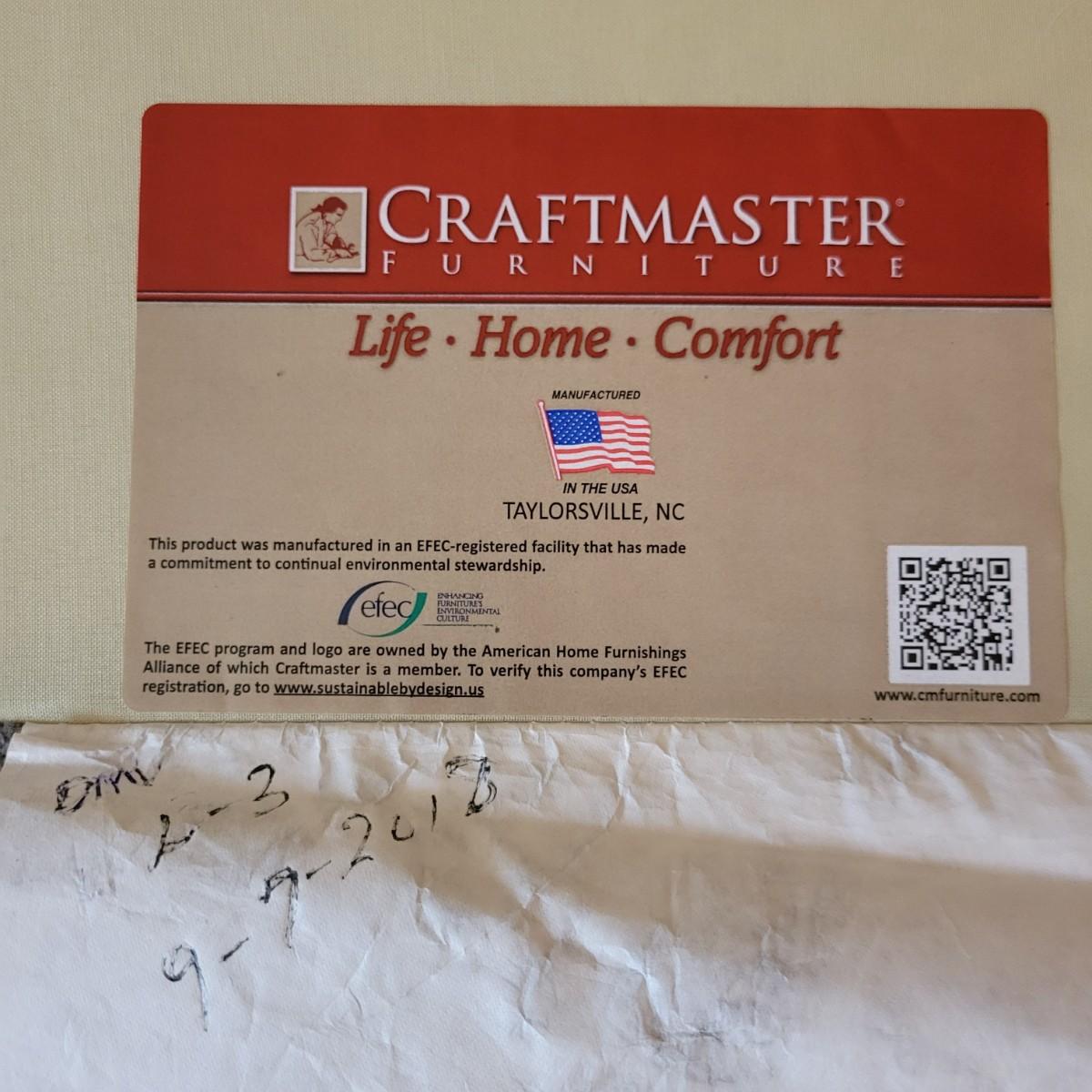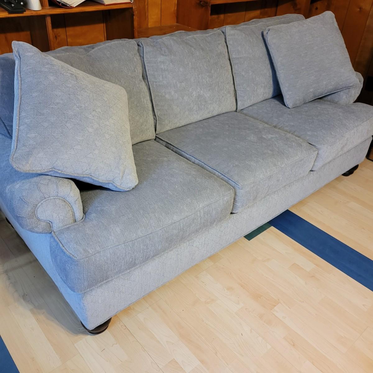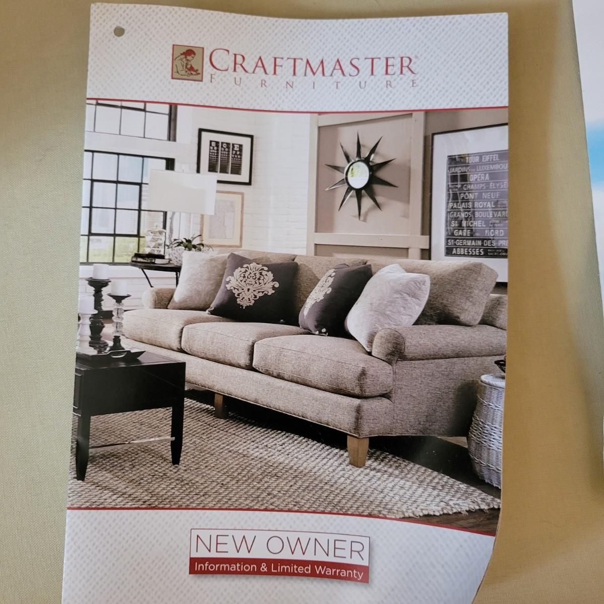 A Craftmaster couch in good condition. This couch was manufactured locally in Taylorsville, NC by Craftmaster and features "Earth Safe" filling. It has a grey textured fabric and two matching pillows. Measures approximately 84" x 36" x 36". No stains or odors were noted. Local pickup only. Winning bidder must bring assistance to help move and load this item due to its weight and/or size.