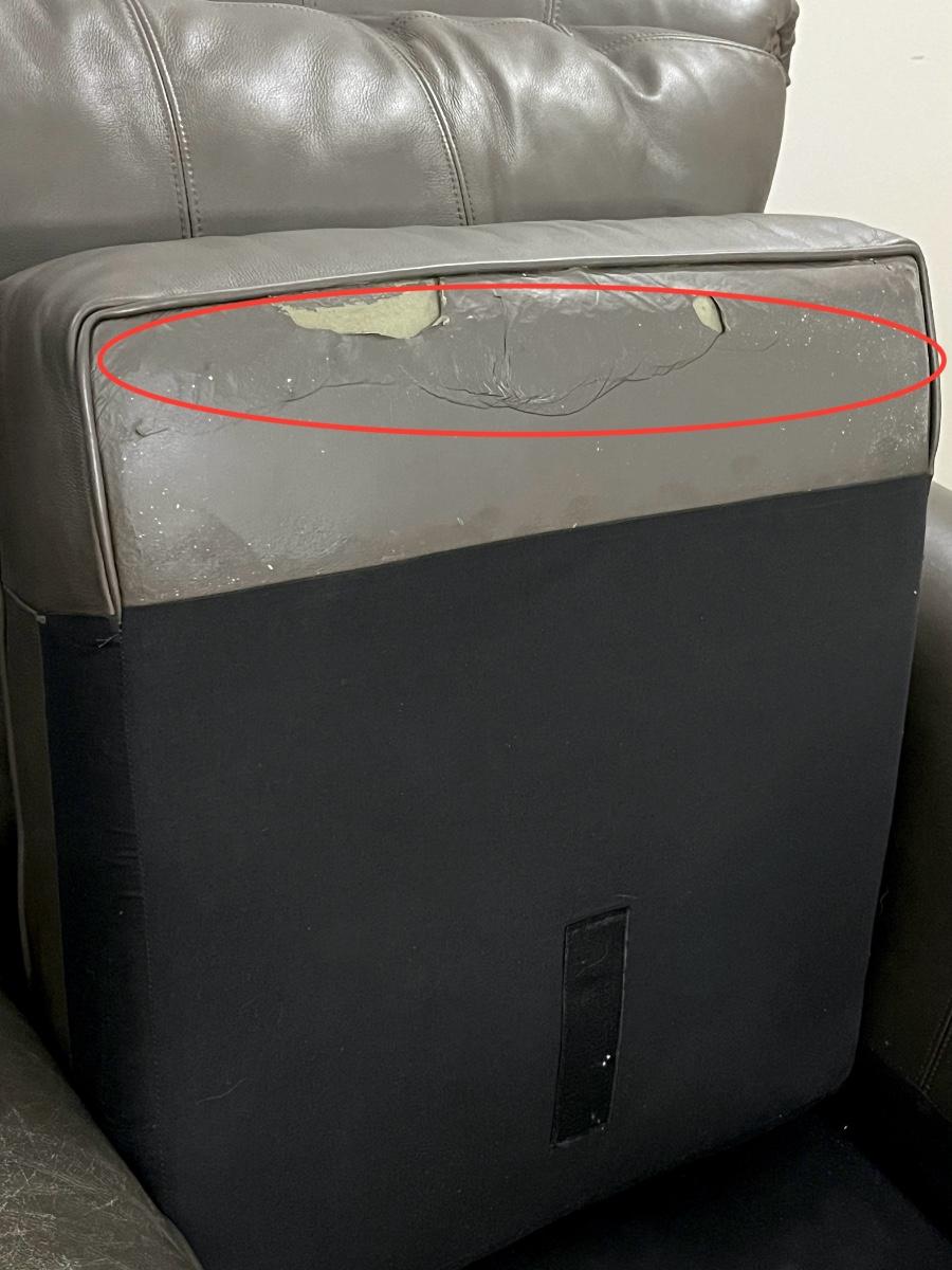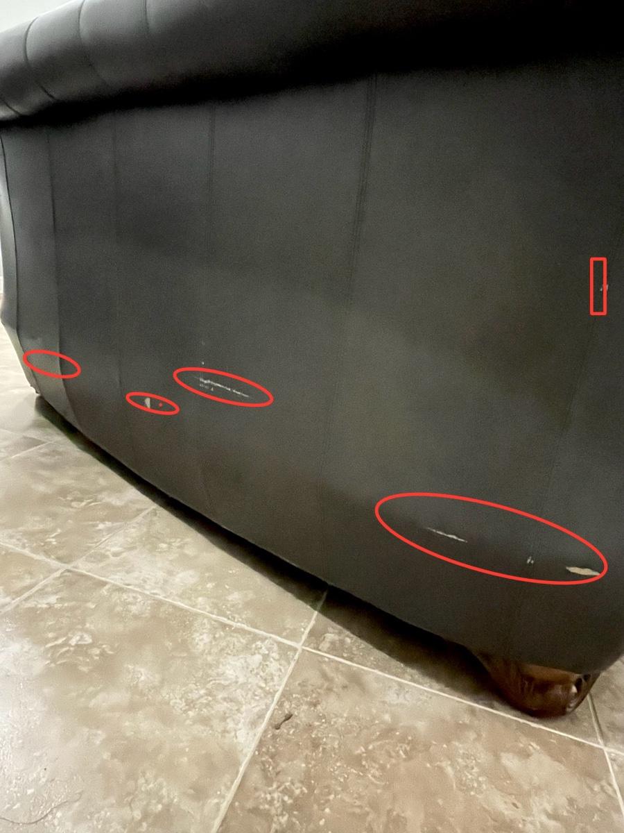 38” H x 86” W x 43” D ~ No brand name ~ Faux leather is peeling underneath the cushions in a few places and a little on the trim. There are signs of wear & scratches on the middle cushion all seen in the photos. Well Used, overall good condition. ~