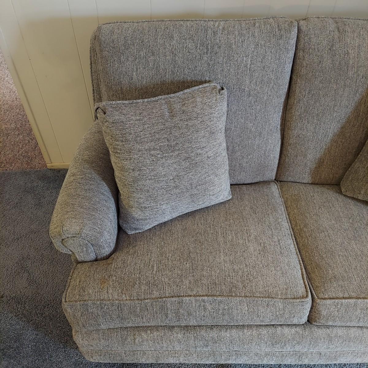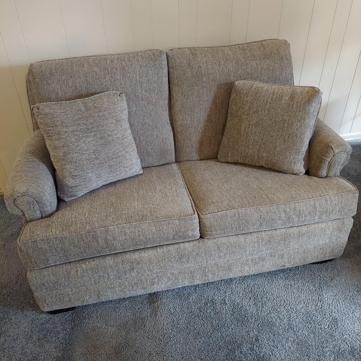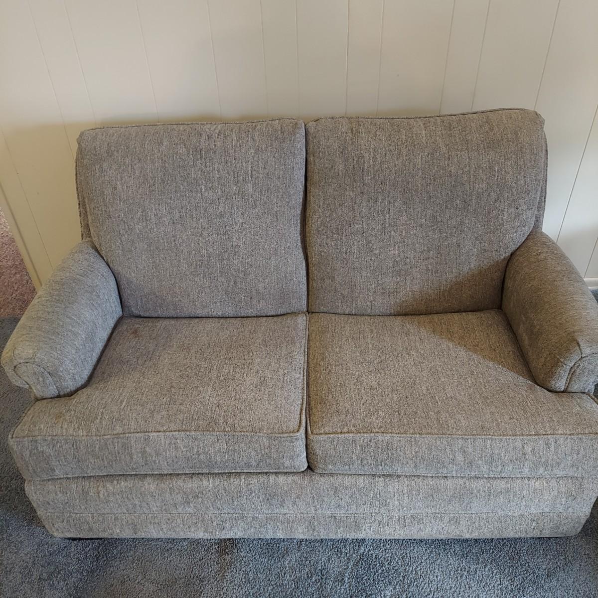 Gray loveseat that measures 54" x 35" x 31"H with a seat height of 16". There are some spots that appear to be on the surface. Couch will need to be cleaned up. Local Pickup Only. Winning bidder must bring assistance to help move and load this item due to its weight and/or size.