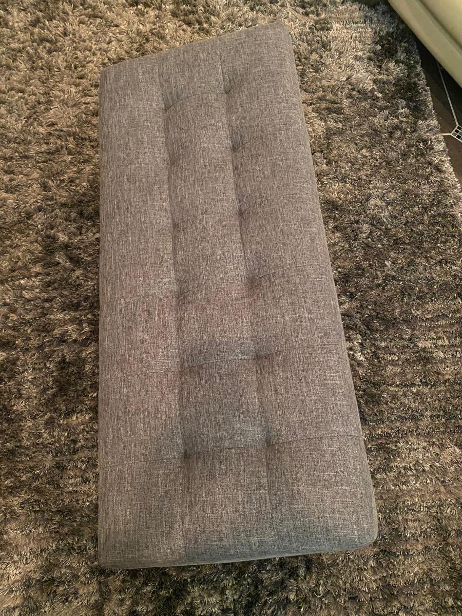 Gray upholstered storage bench. Nice and roomy inside.