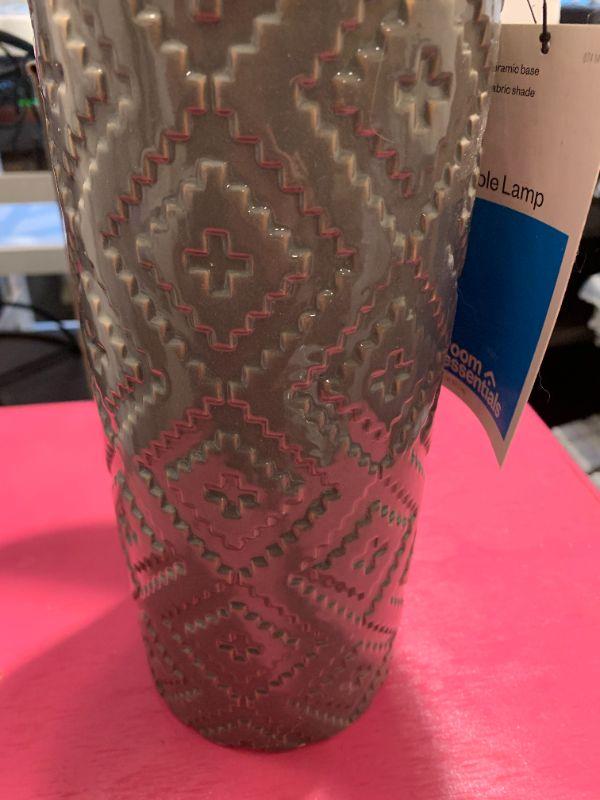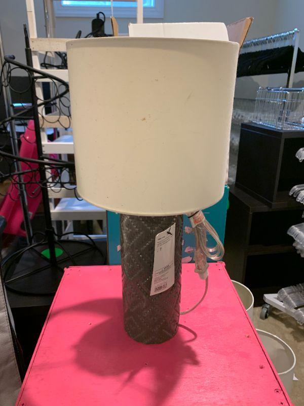 Gray table lamp new with tags. Shade has been damaged from storage and will need replacing.