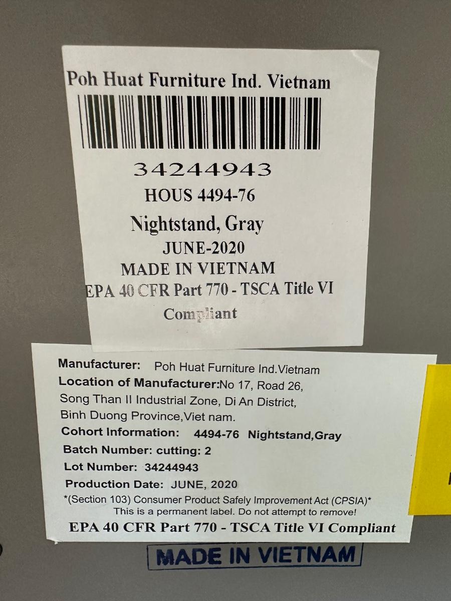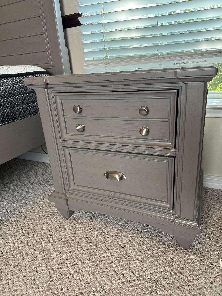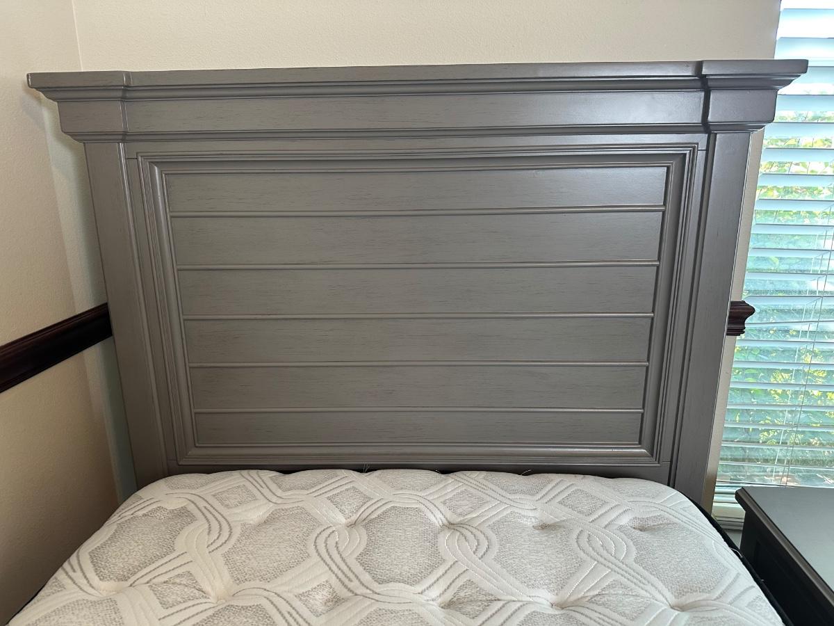 Sturdy gray wood twin bed frame with paneled headboard and matching nightstand by Poh Huat Furniture (June 2020). Includes Sealy Performance Posturepedic twin mattress.