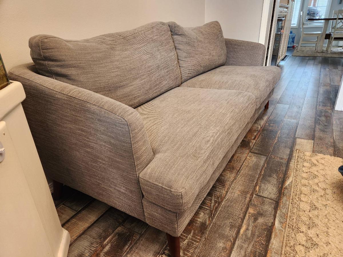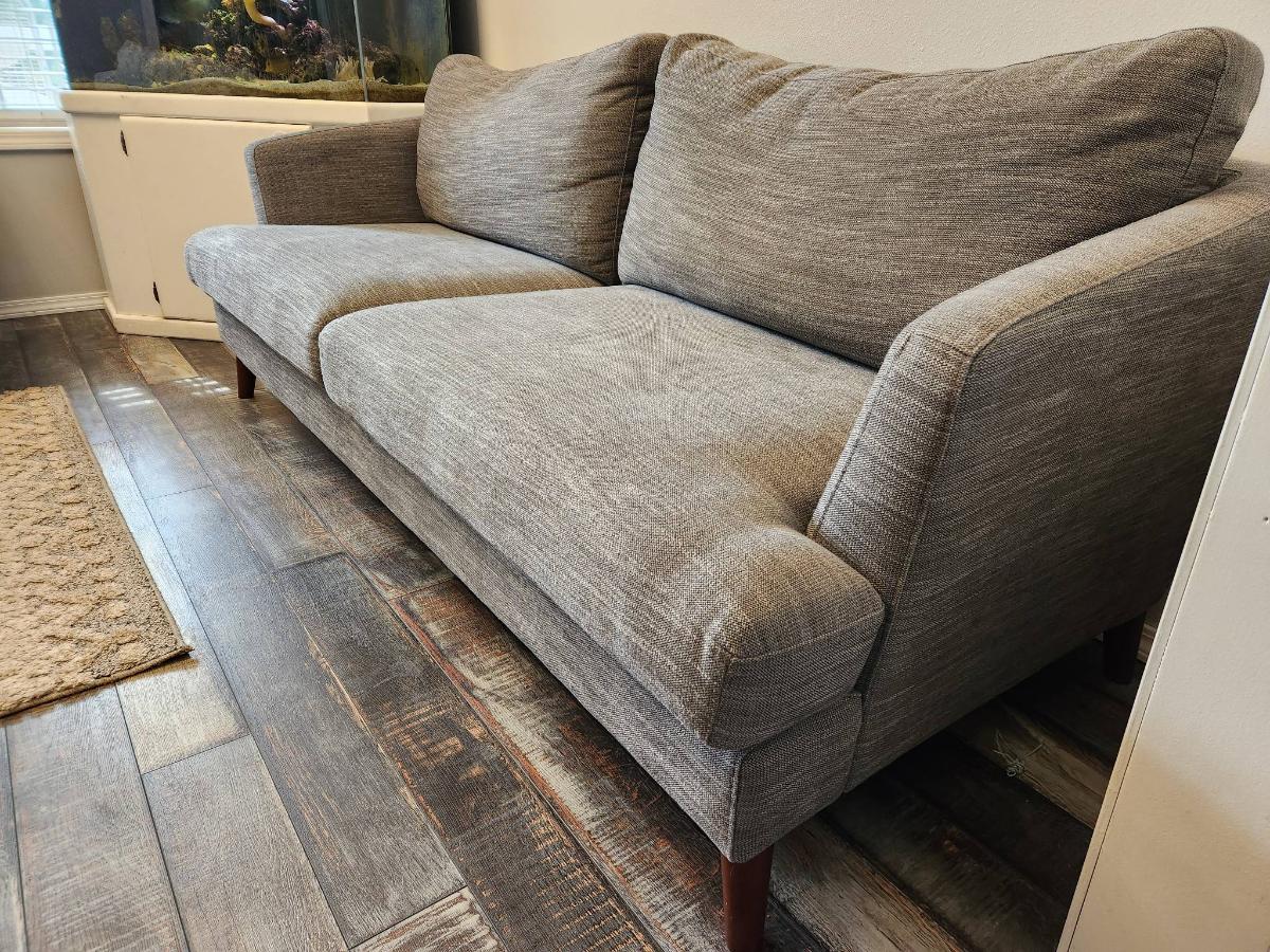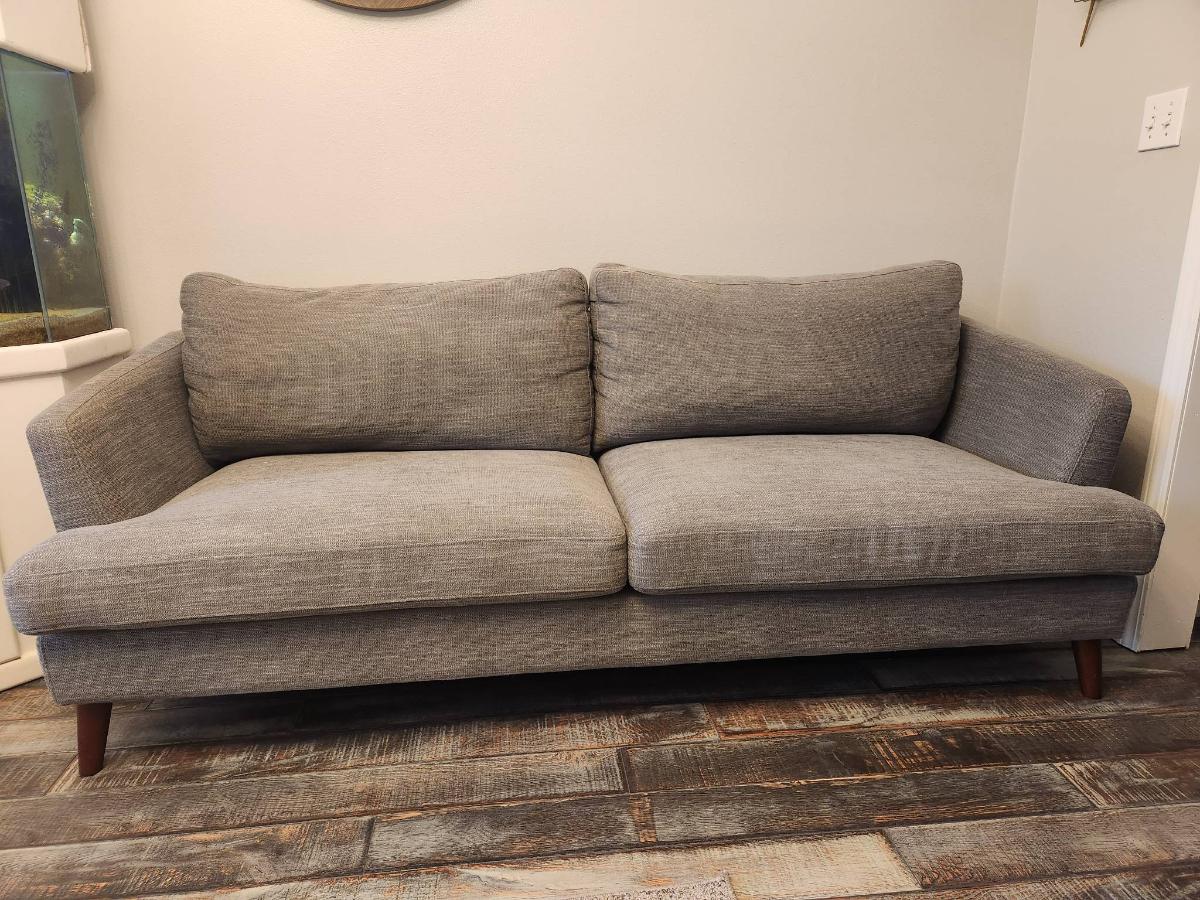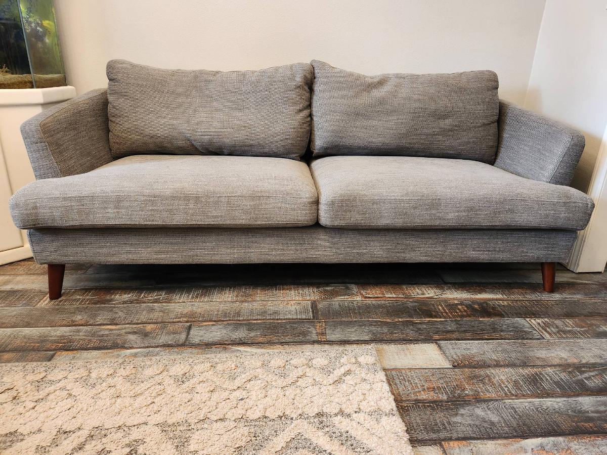 Gray upholstered sofa featuring a textured fabric design and two large seat cushions. Includes a pair of matching backrest cushions for added comfort. Supported by four angled, mid-century modern style wood legs. Dimensions not specified.