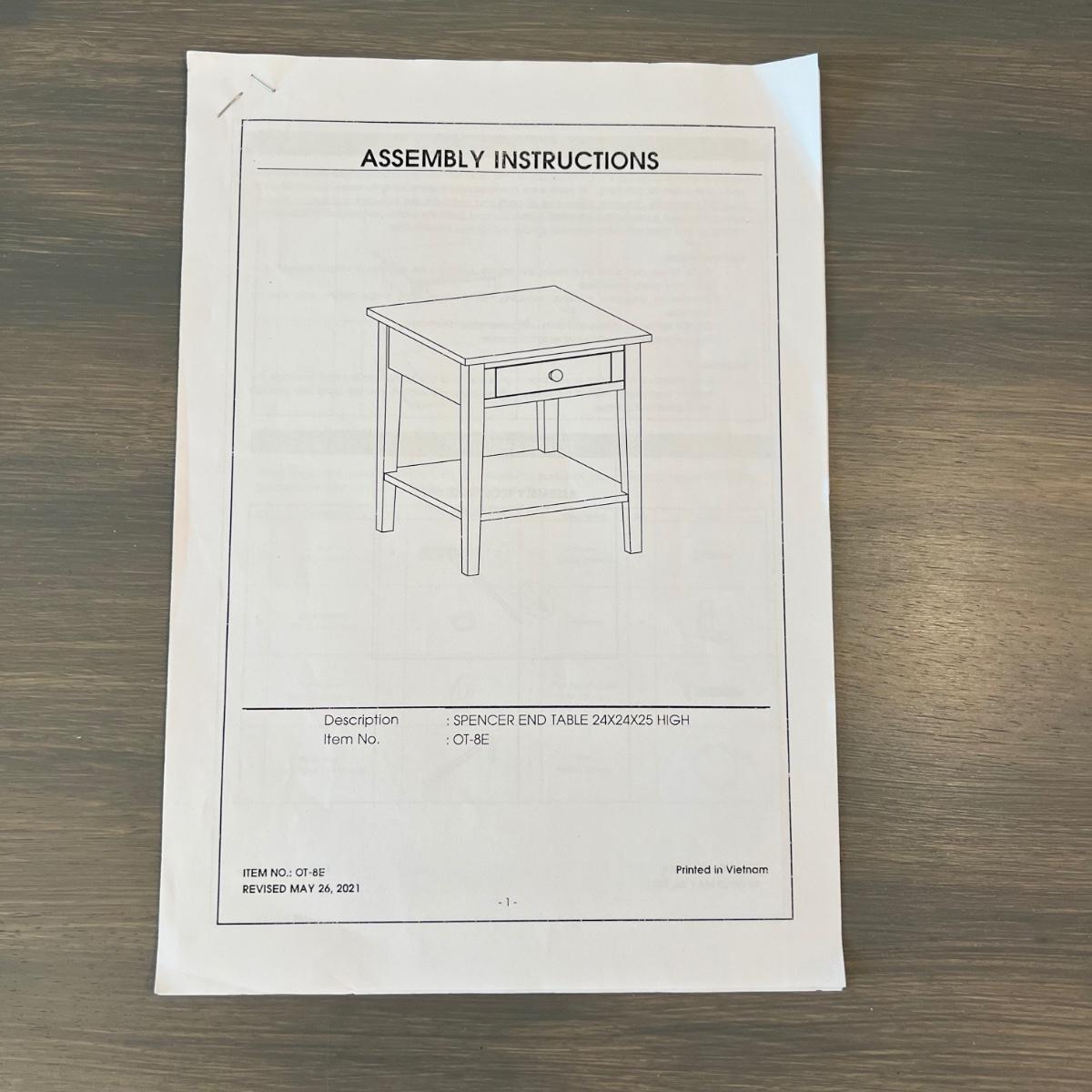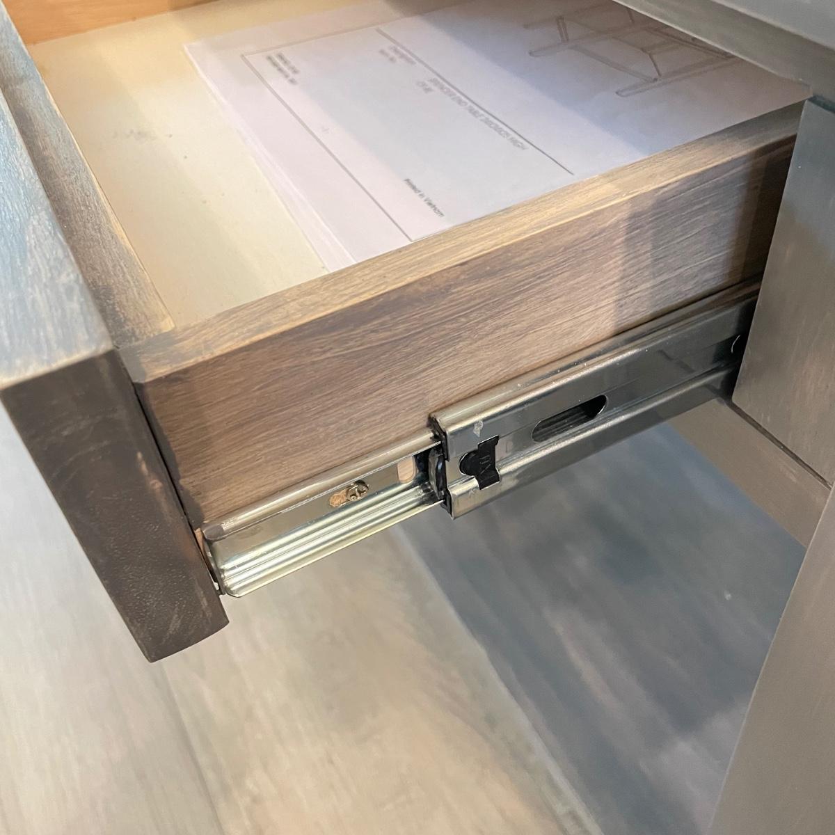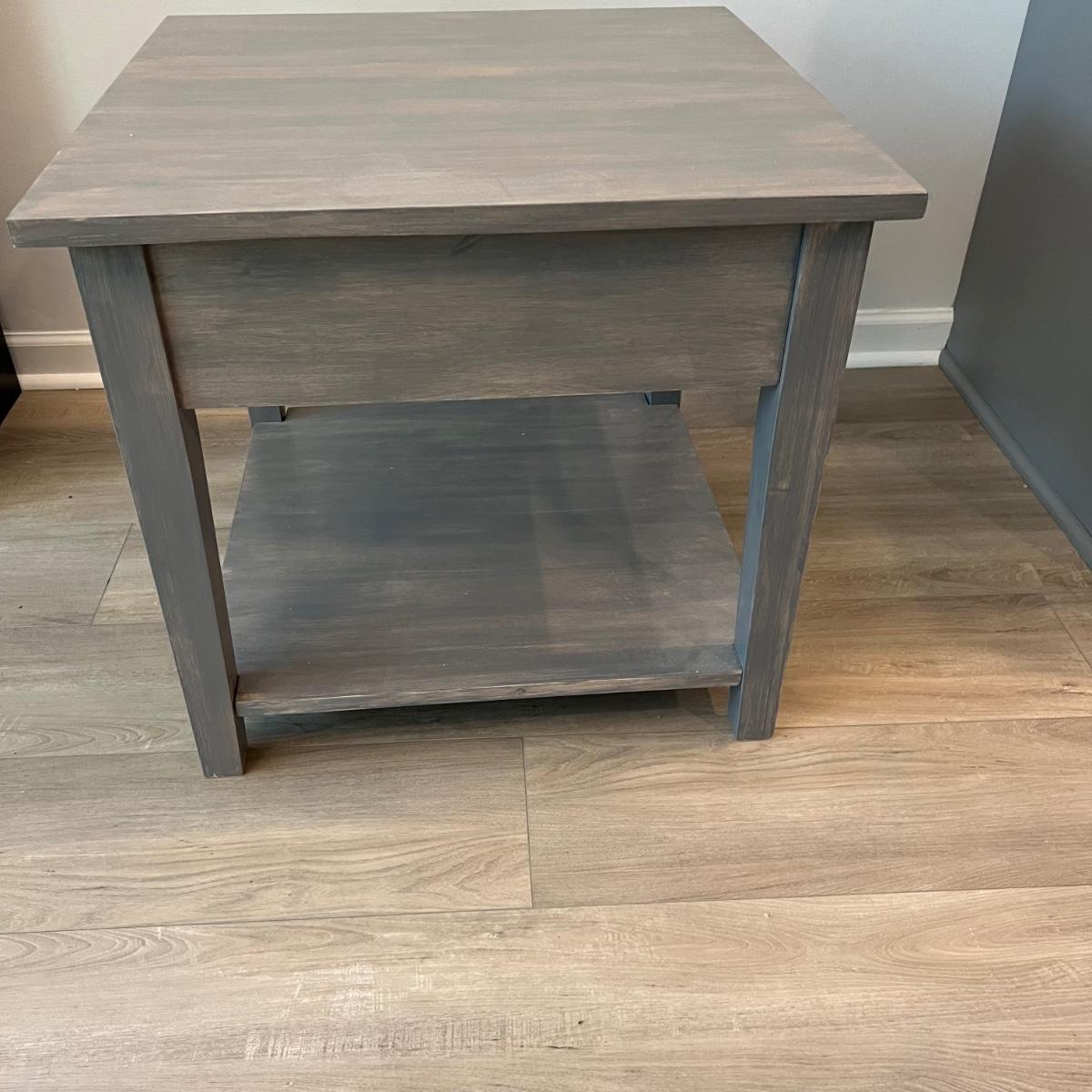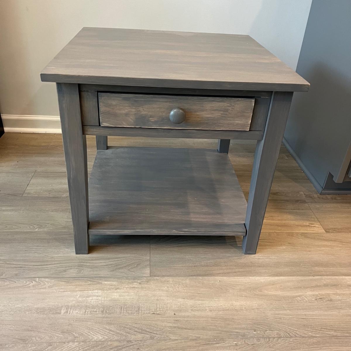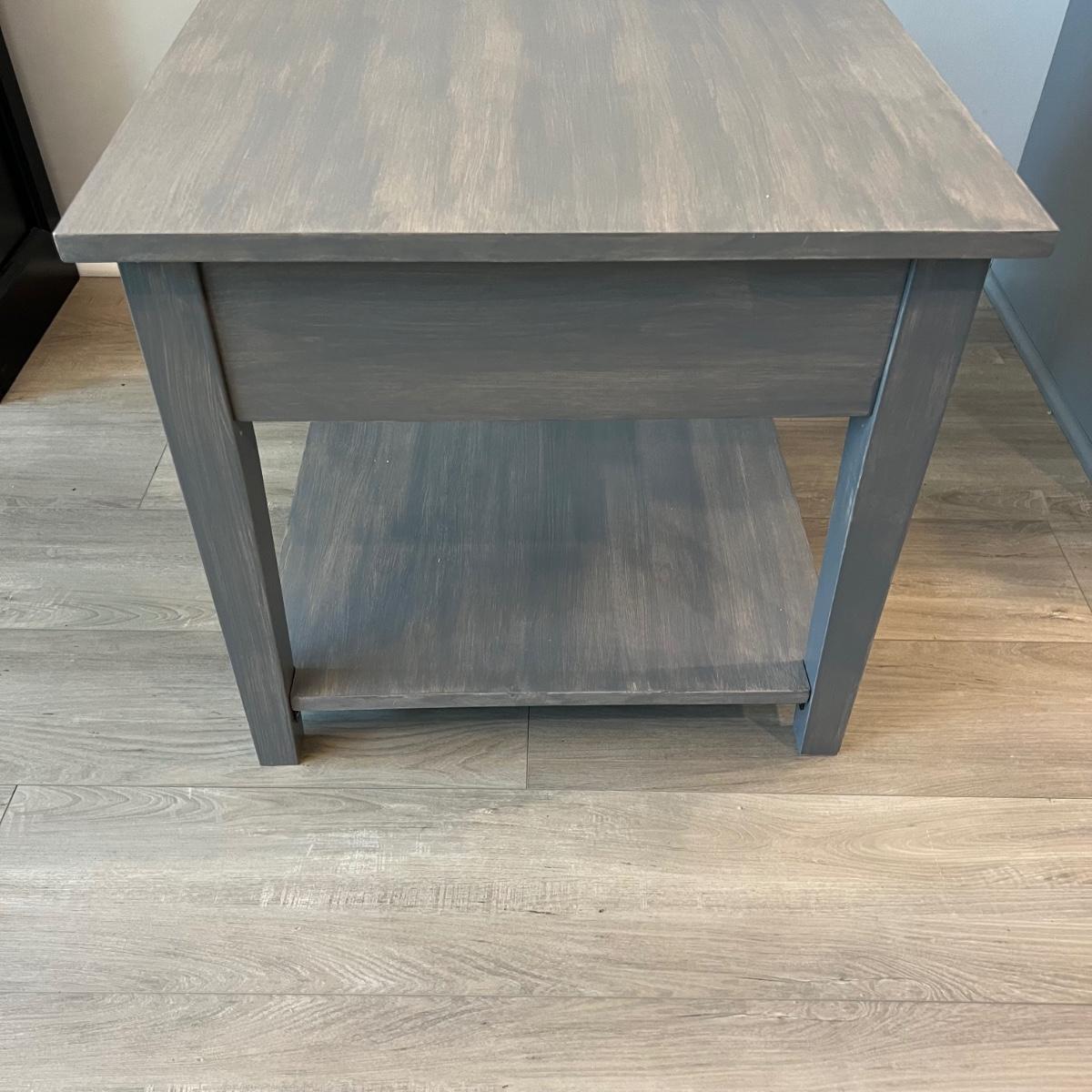 The table measures 24” x 24” x 22”H. The gray finish is in an antiqued style and has a drawer and a shelf.