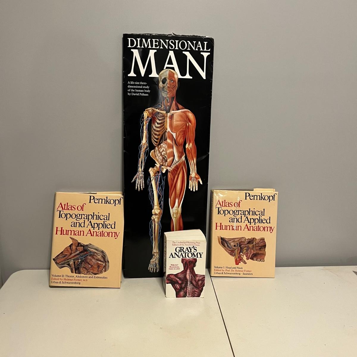 Lot includes a Grays Anatomy book, Atlas of Topographical and Applied Human Anatomy book volume one and two. Also includes Dimensional Man life sized 3D study of the human body.