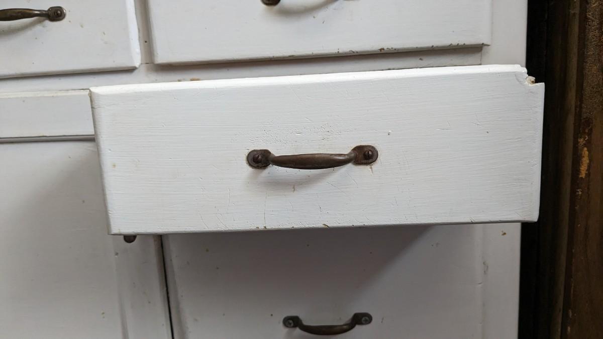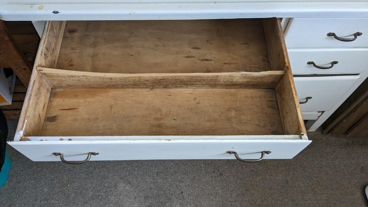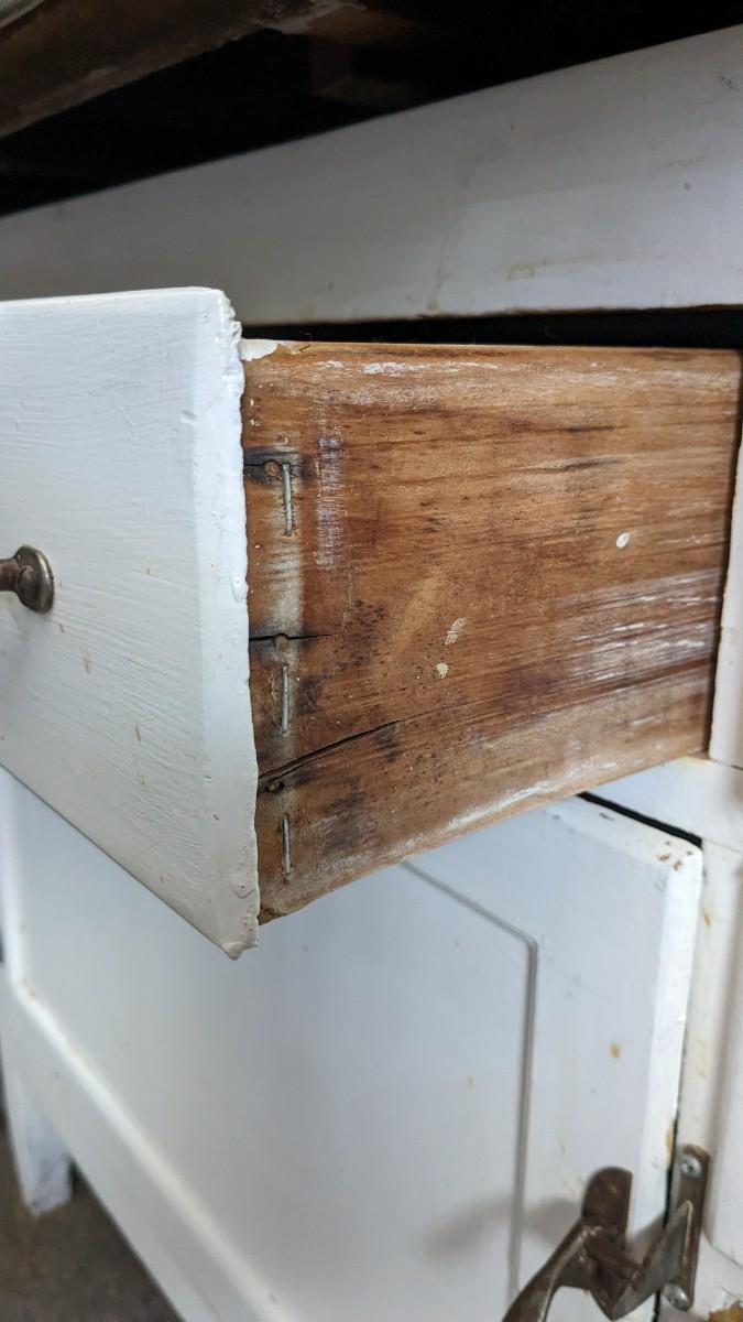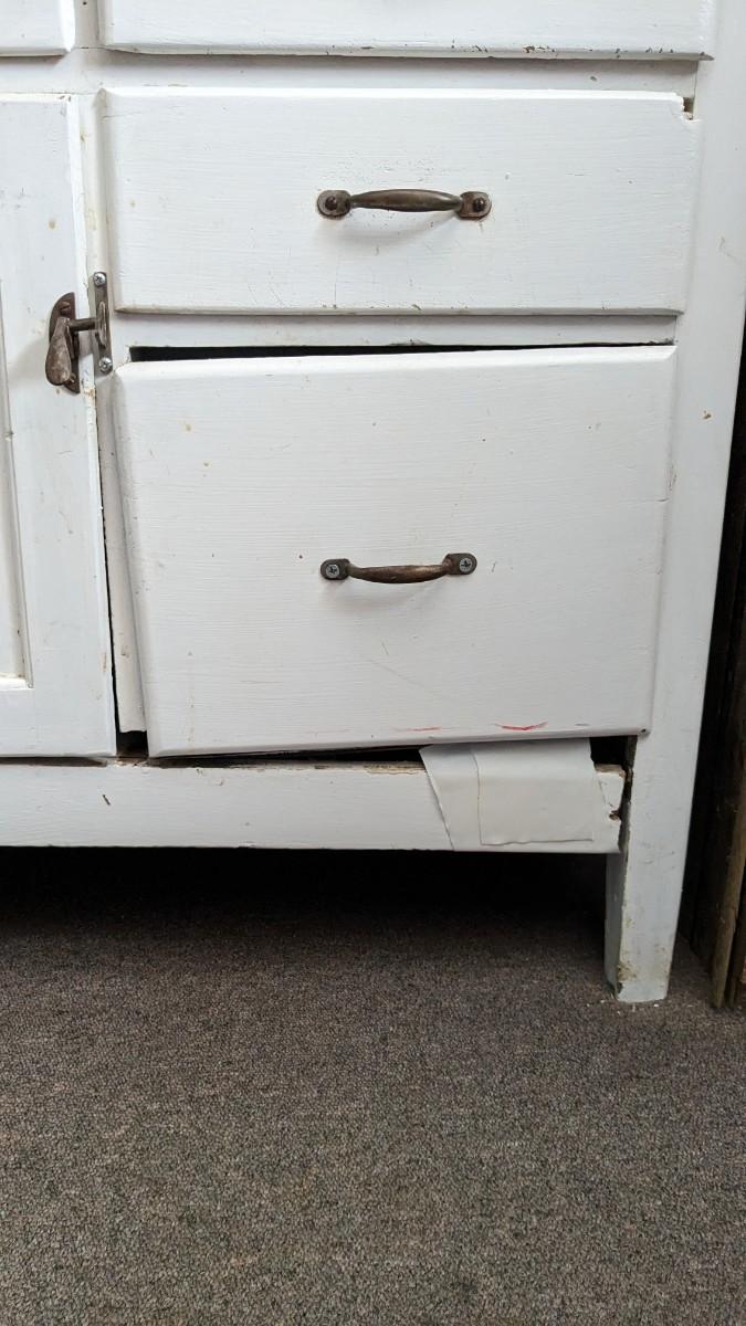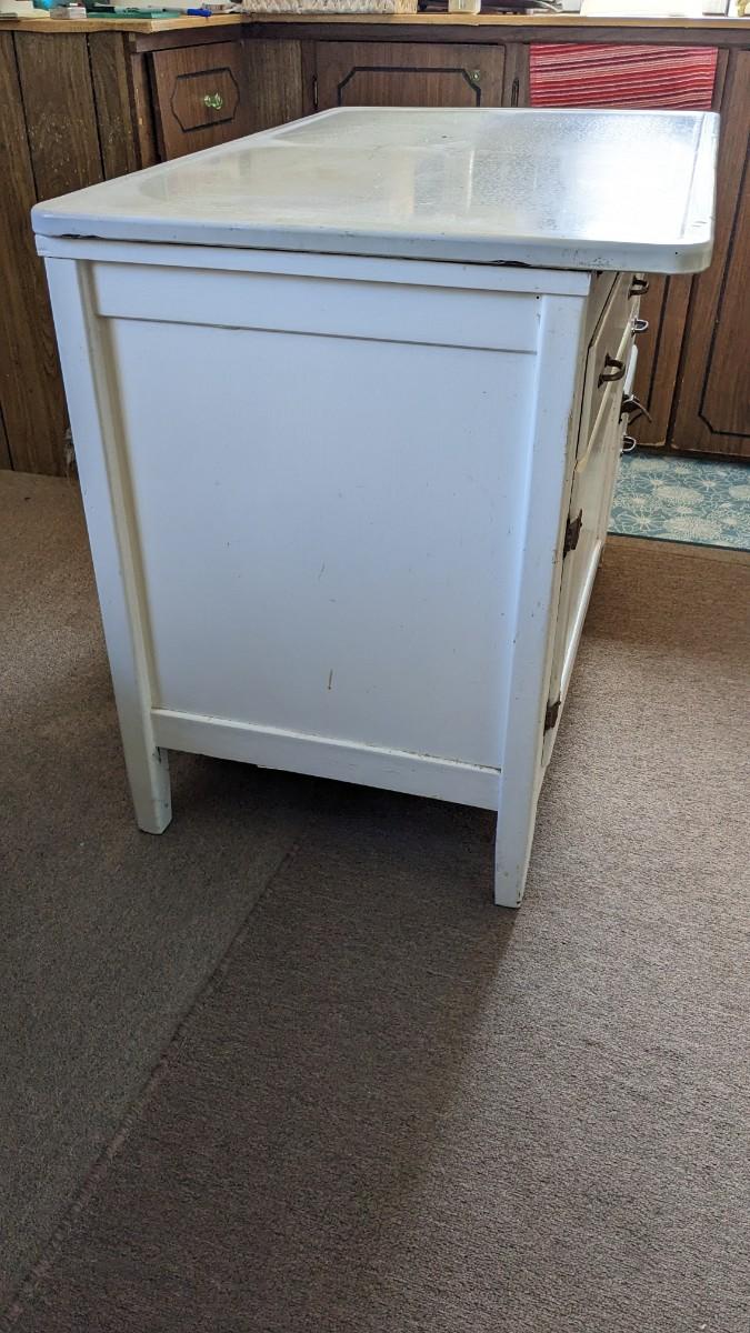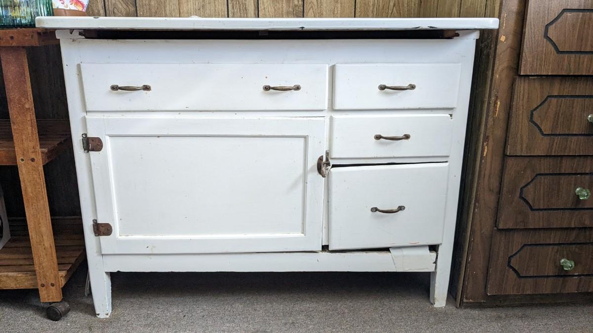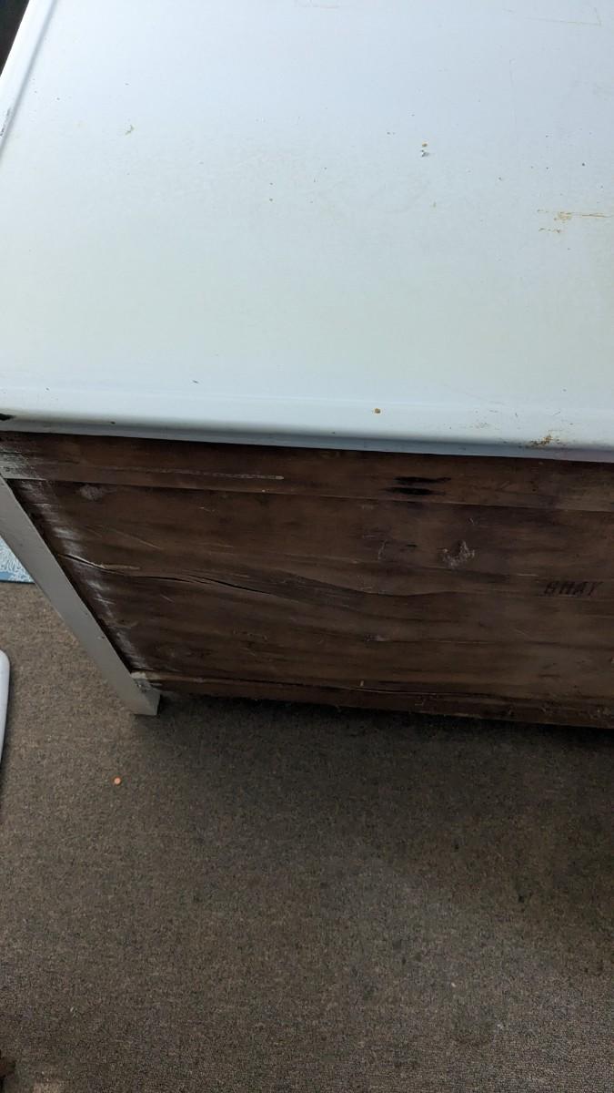 40"x 25"x31". Wear can be found to this piece on the bottom front with wood warping found on back. Still in use and with a ton of character and life left in it! Marked "Gray" on the back.