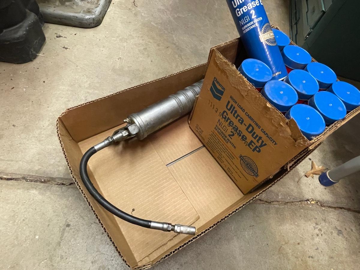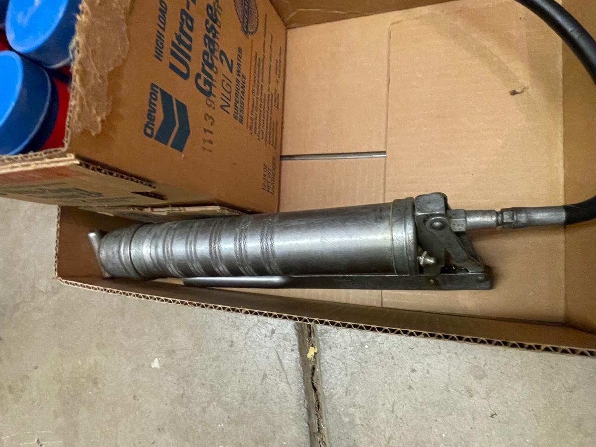 Large grease gun and most of case of Chevron Ulta-Duty Grease EP I think 10 cans as shown.
