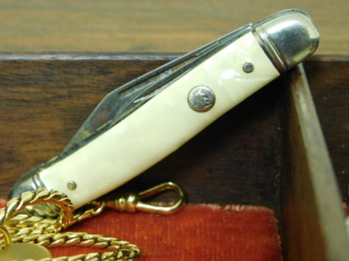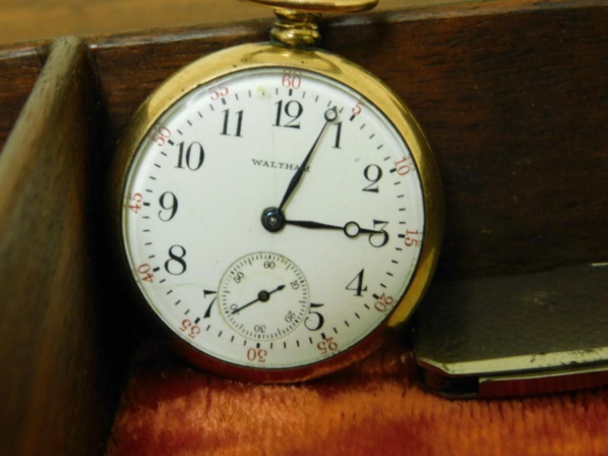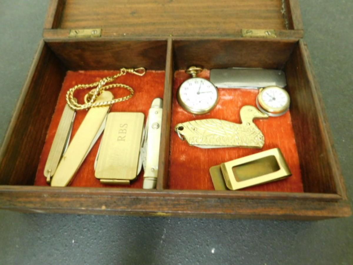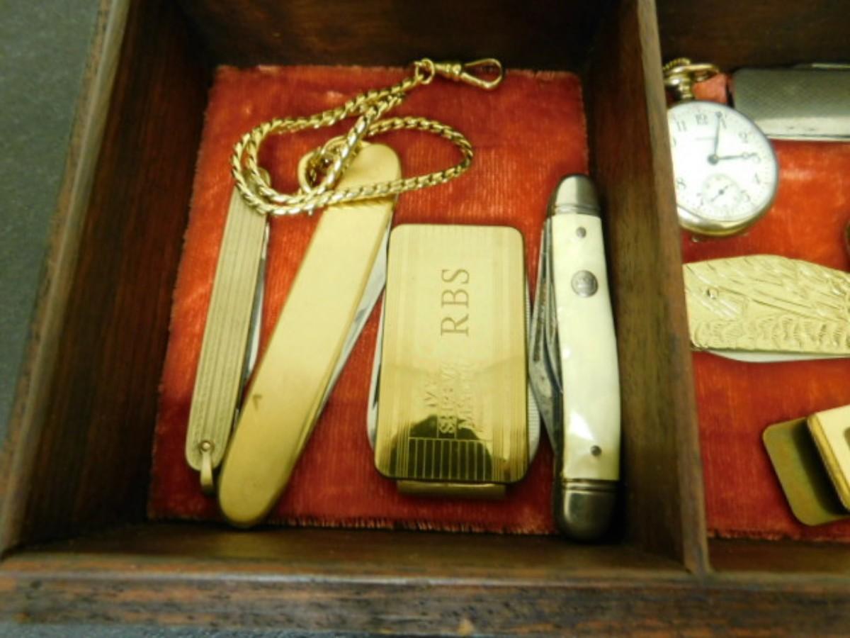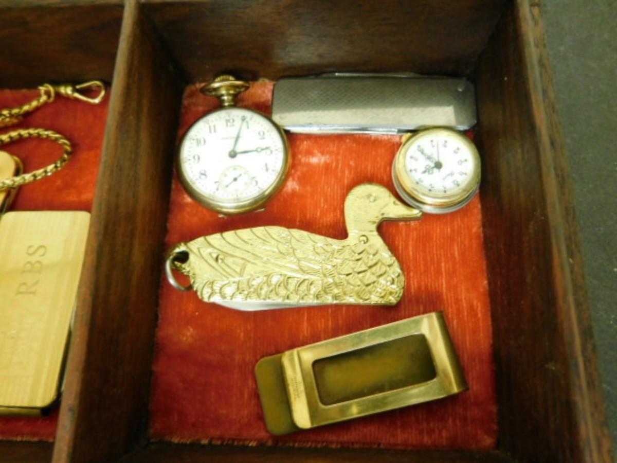 Great Collection of Gentleman's Personalized Pocket Ware includes Waltham Pocket Watch and Stylized Wood Box