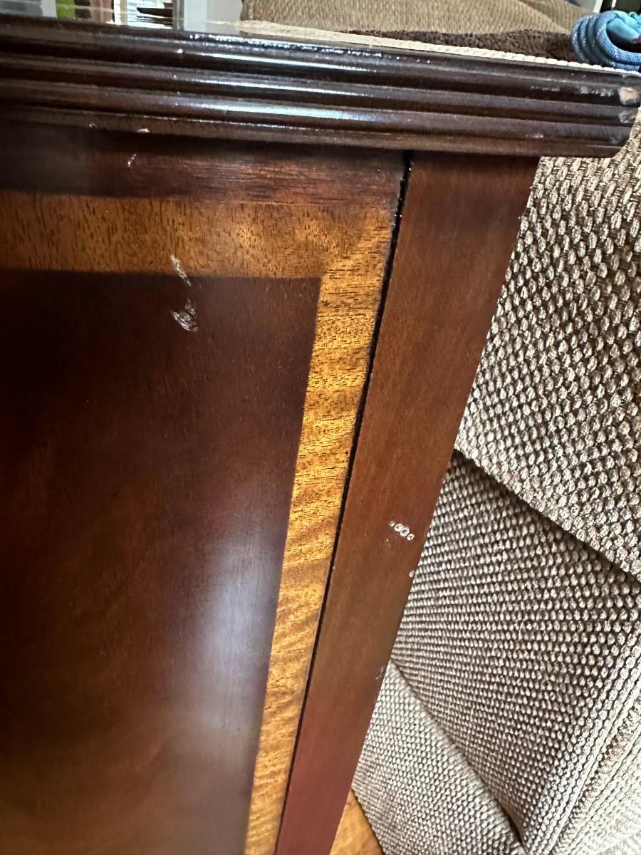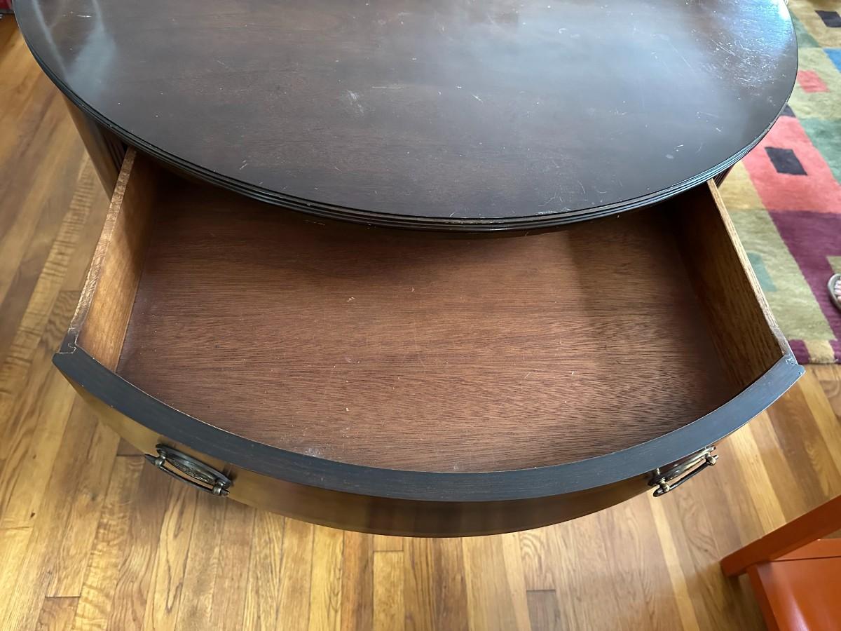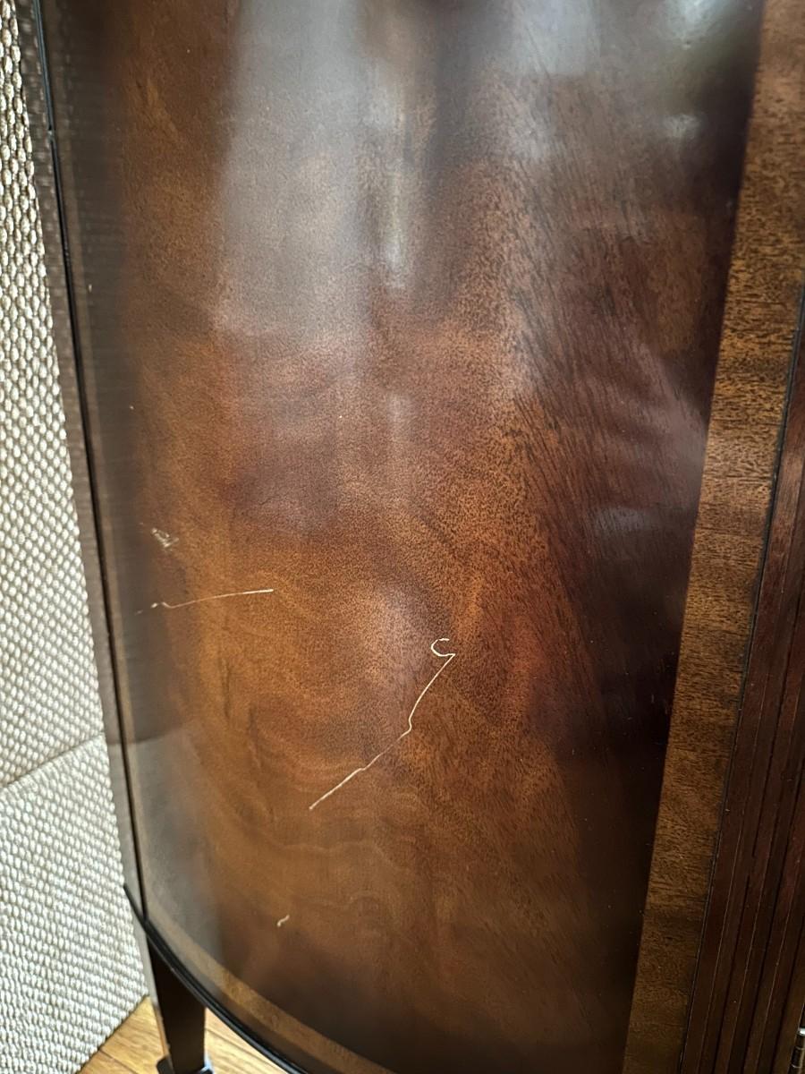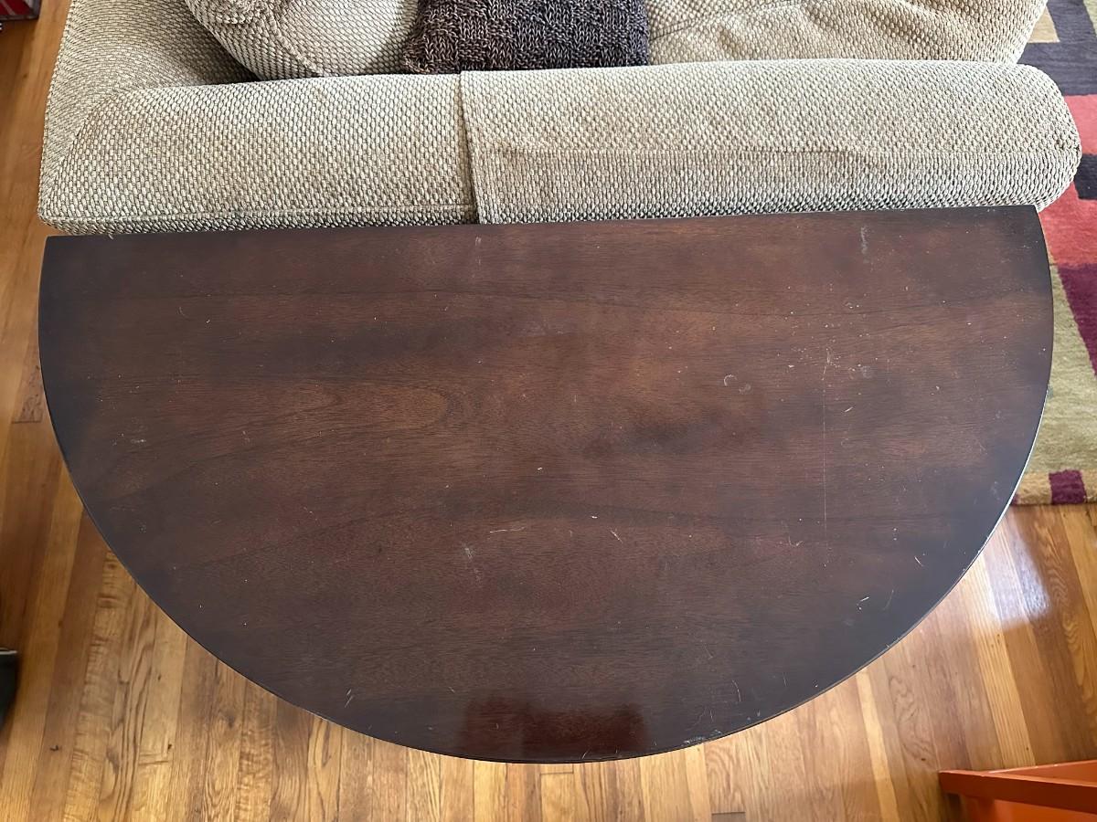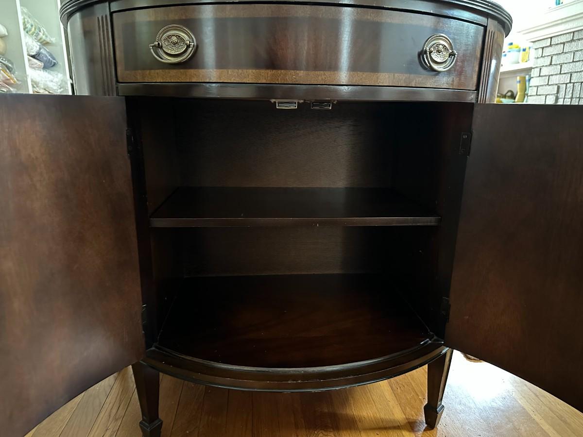 Half-Round Wood Entry/Bar Cabinet with Brass Handles, drawer, doors and interior shelf. In good stable condition with some wear. Measures 38"w x 19"d x 33.25"h
