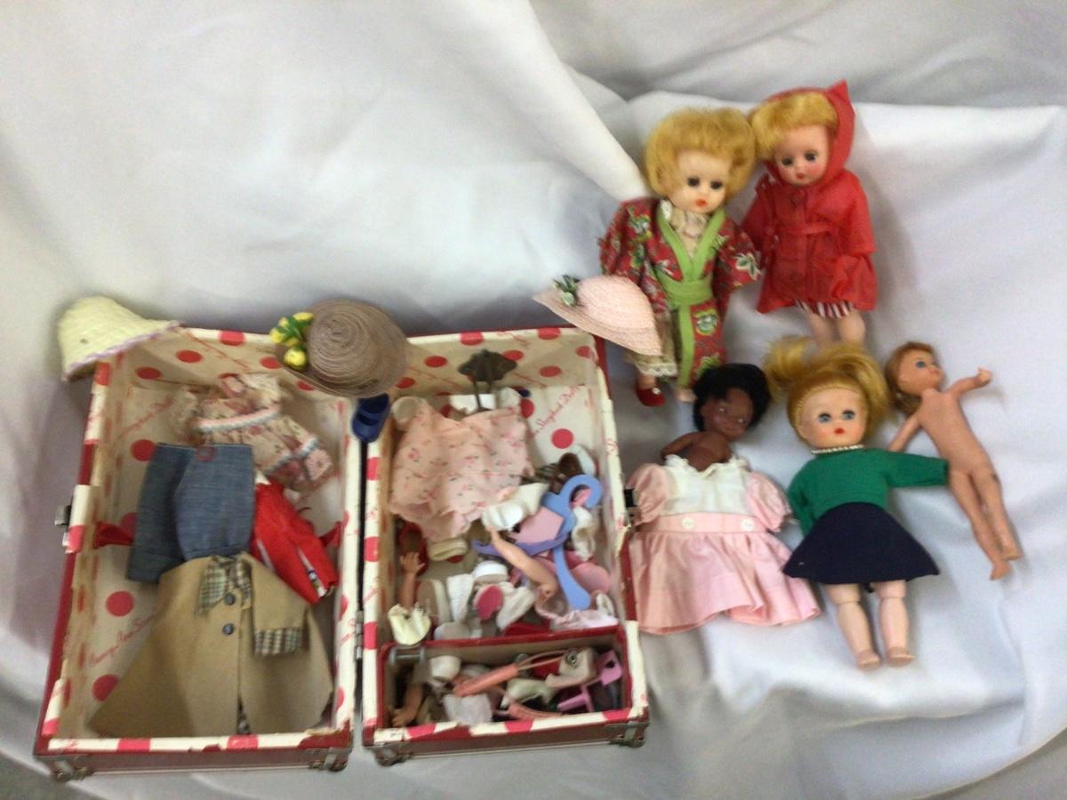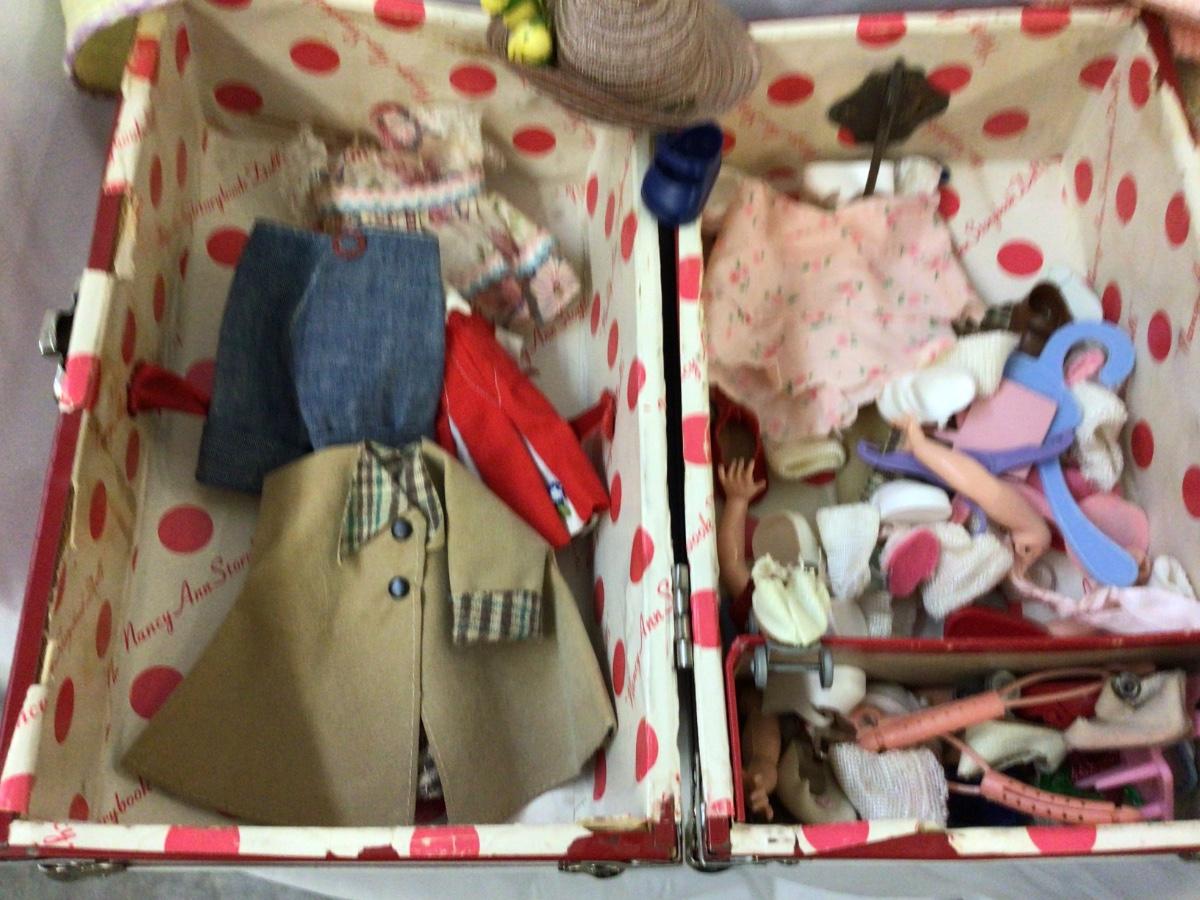 This is a great kids small trunk. It opens up to 5 different dolls, with doll clothes, accessories. Dolls and clothes in various ages and conditions.