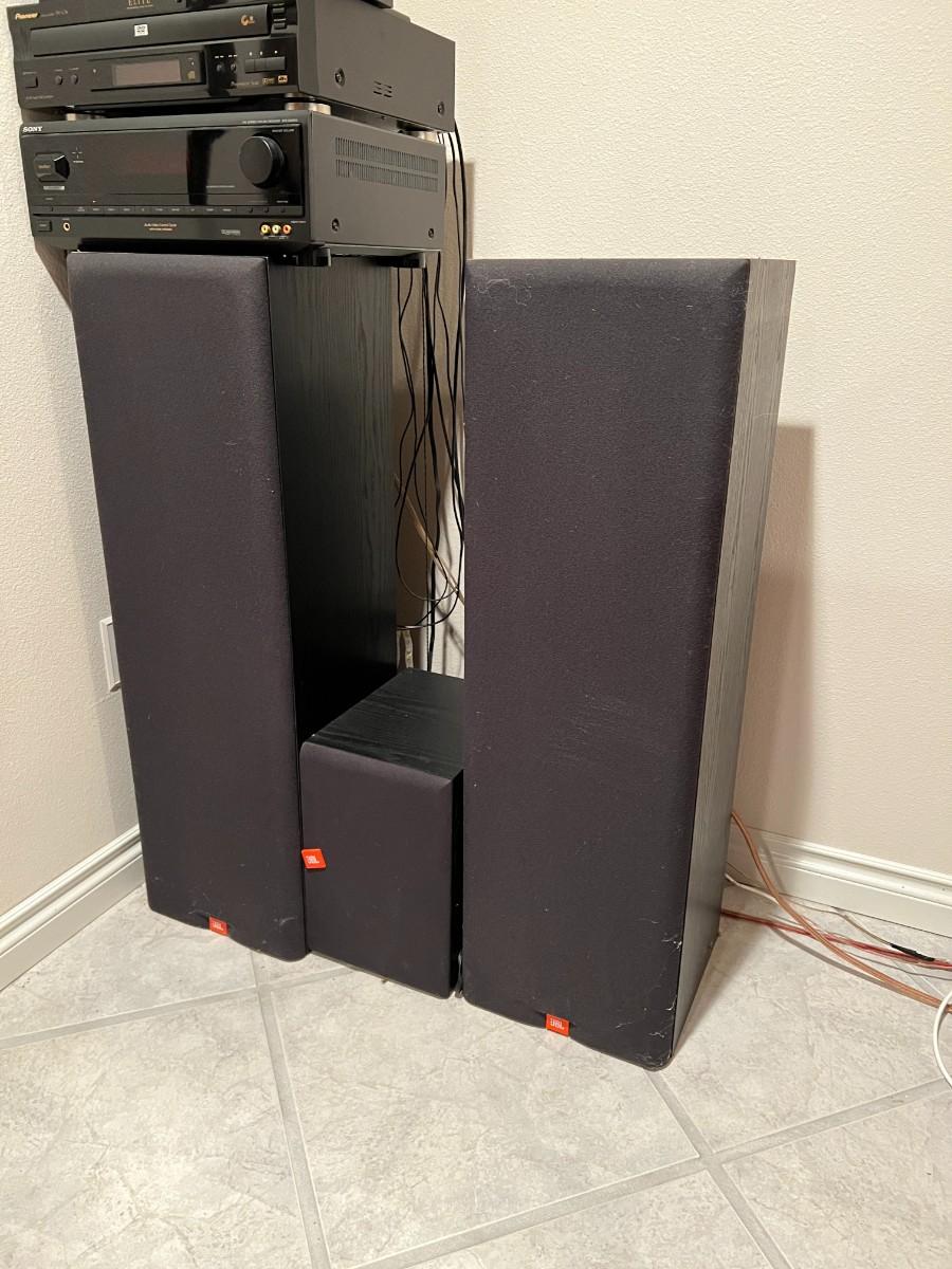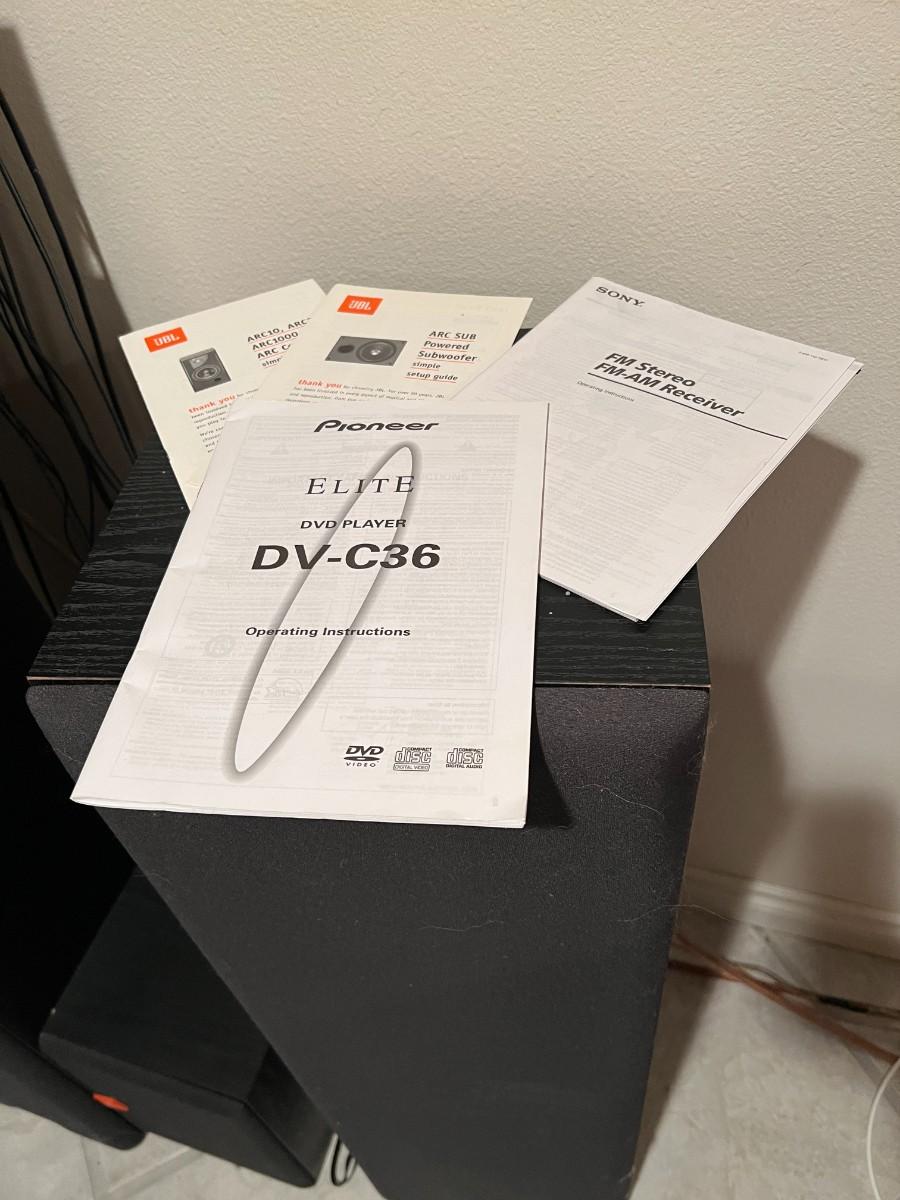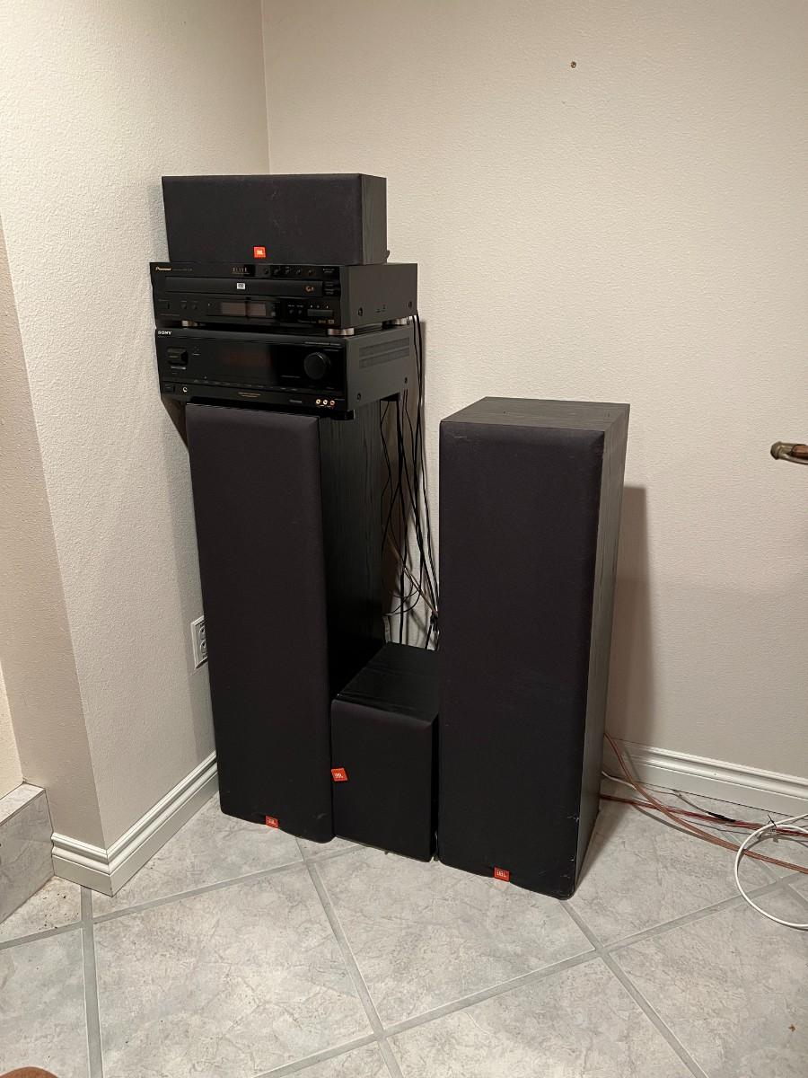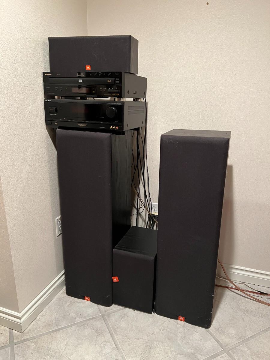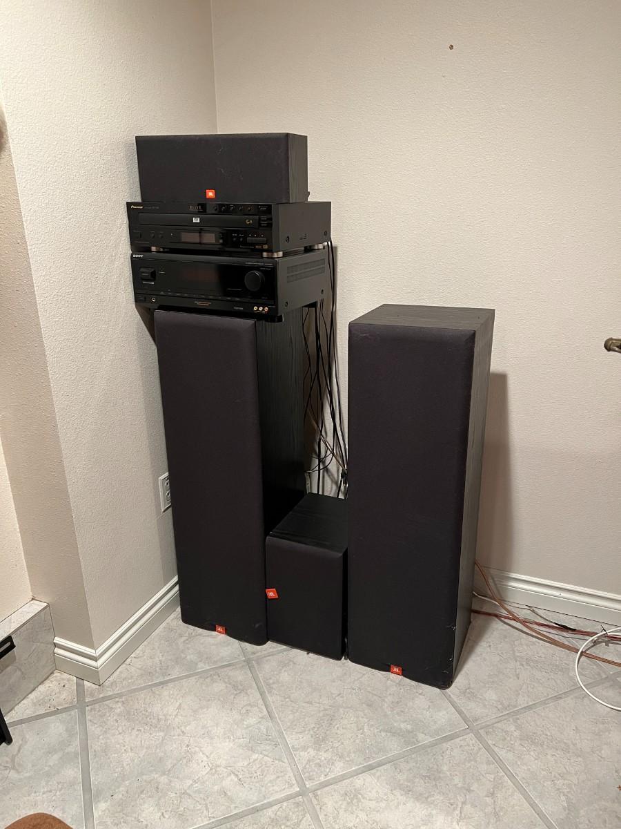 Great Media Equipment Lot of 6 JBL and Advent Speakers and Pioneer DVD and Sony Receiver. Fantastic sound system bundle. In good condition, as shown. Includes manuals shown in image.