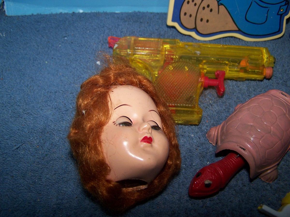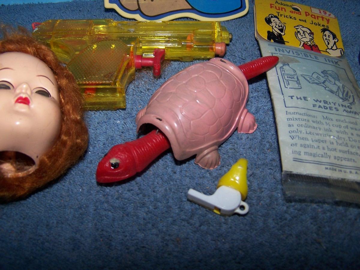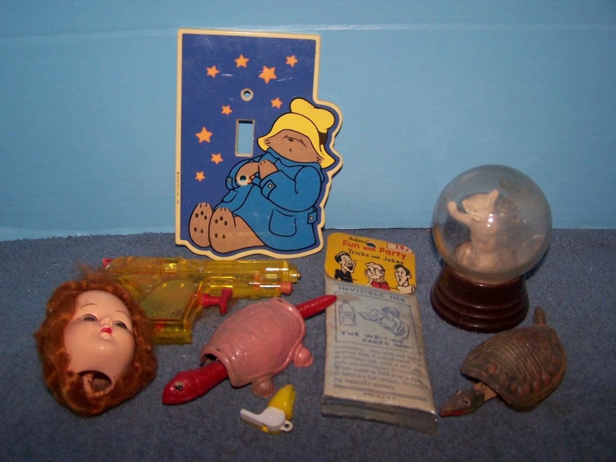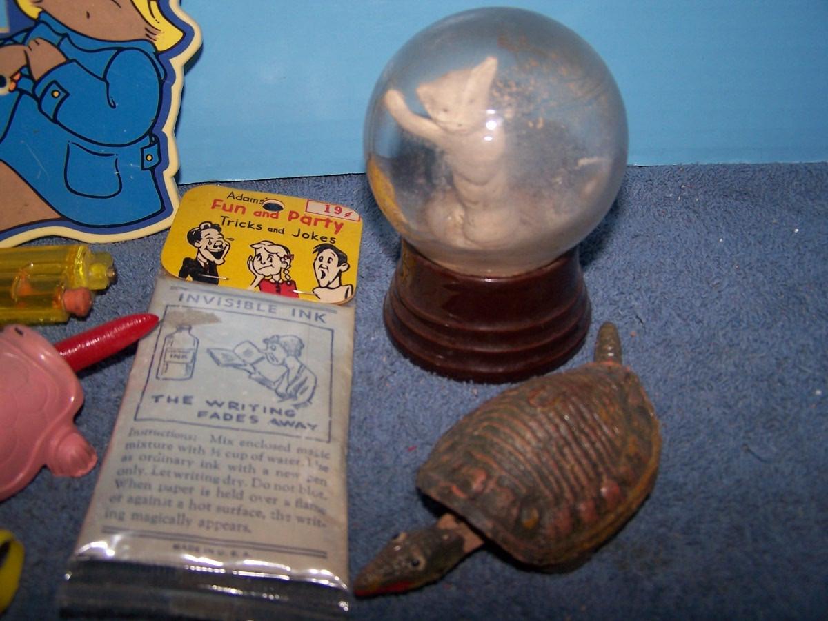 THIS IS GREAT VINTAGE TOY STUFF! BROWN BOBBLE HEAD TURTLE IS MARKED-MEXICO, IS POTTERY.. SNOW GLOBE'S WATER IS MOSTLY GONE.. ALL TOYS HAVE BEEN PLAYED WITH..