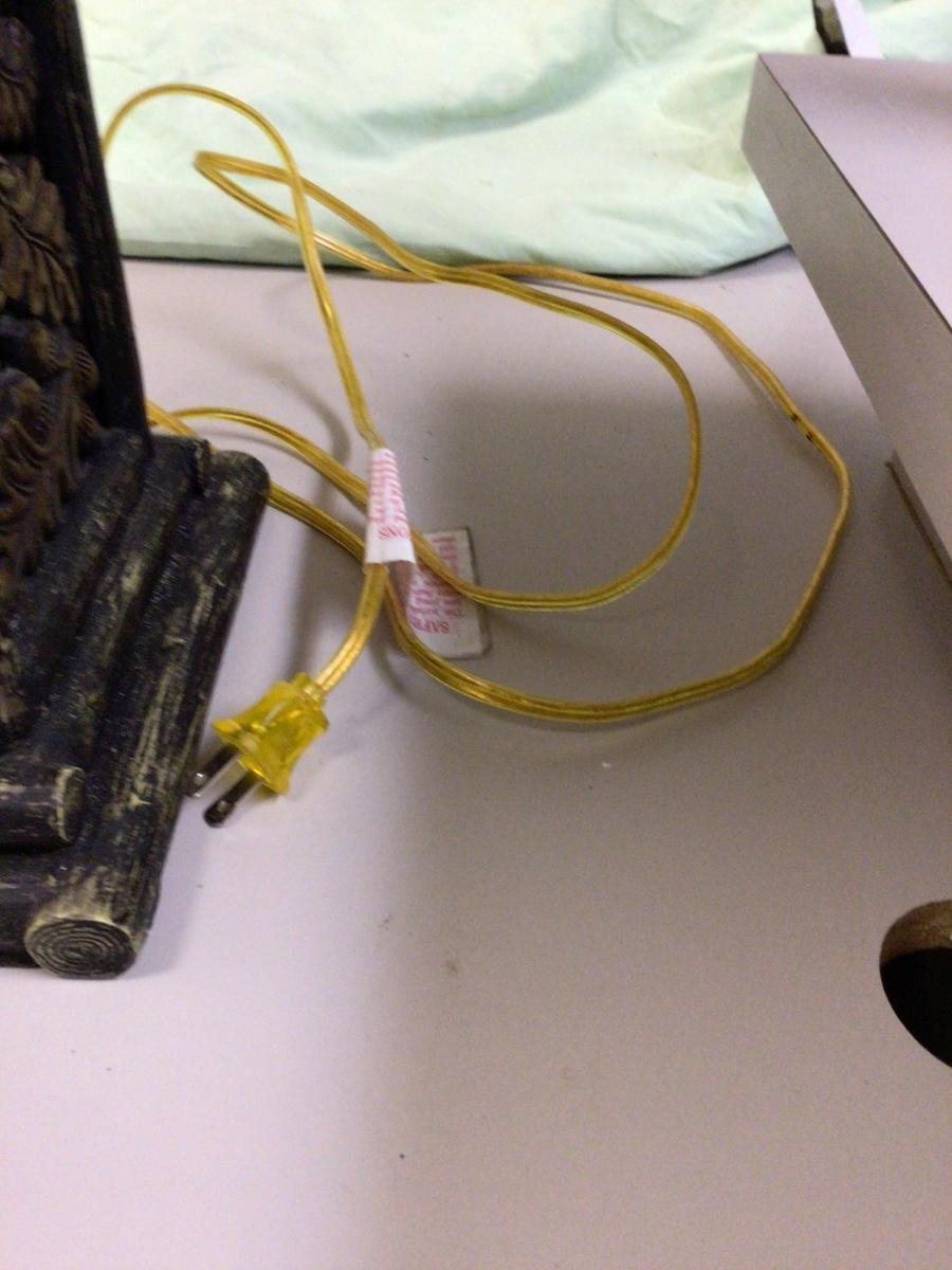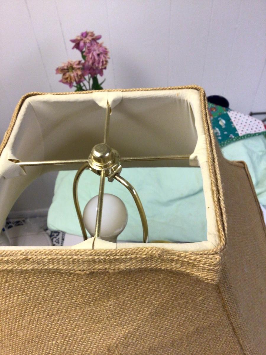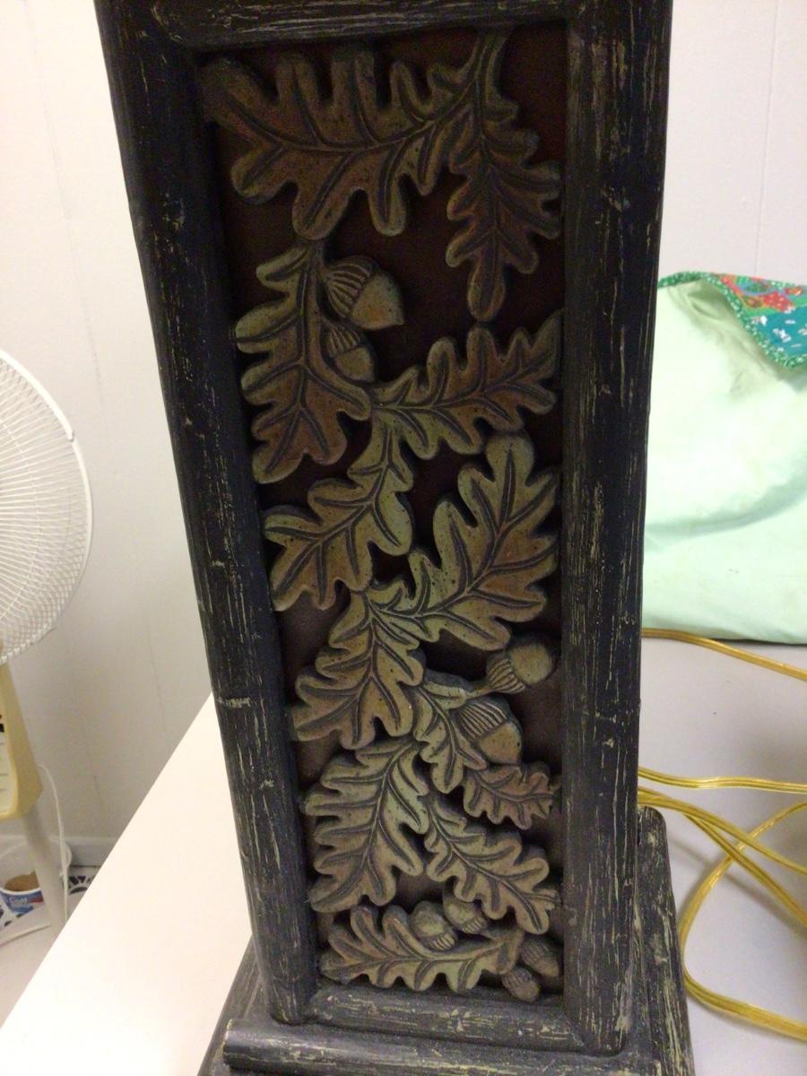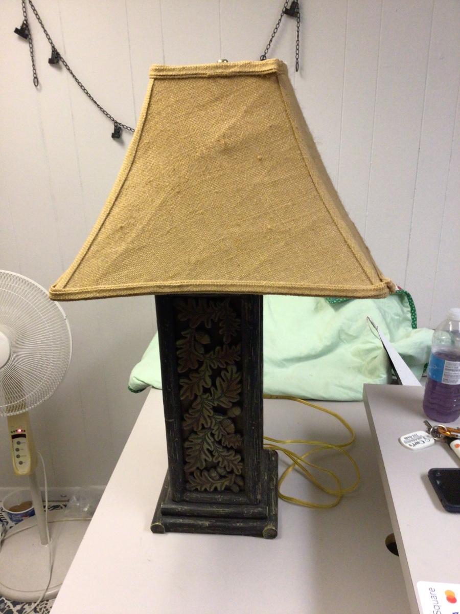 This is a great vintage oak leaf wood lamp with cloth lampnshade