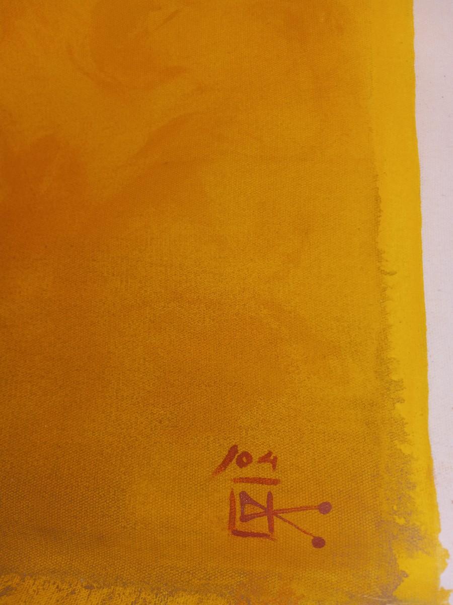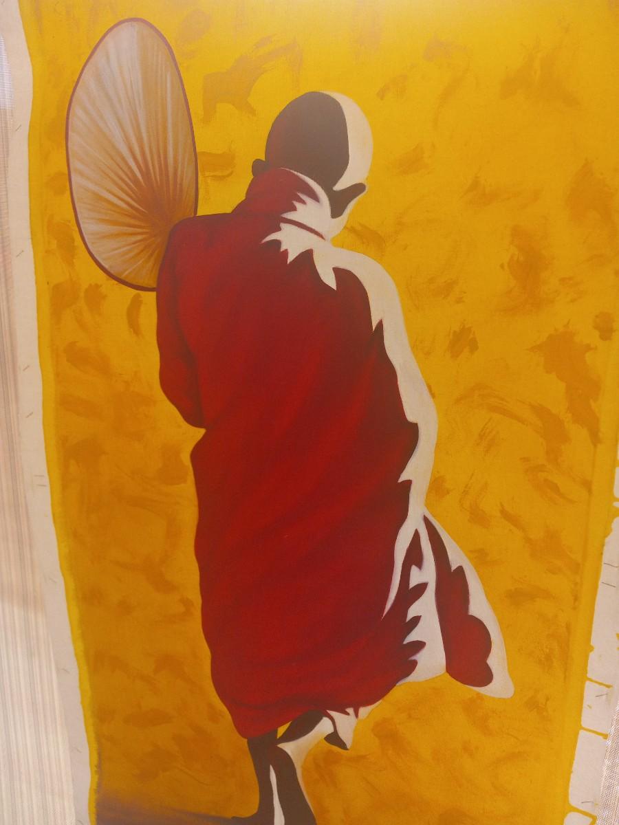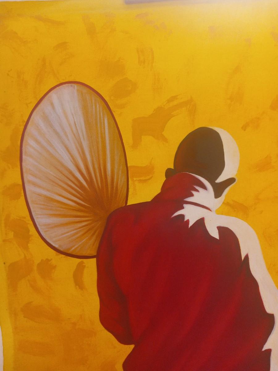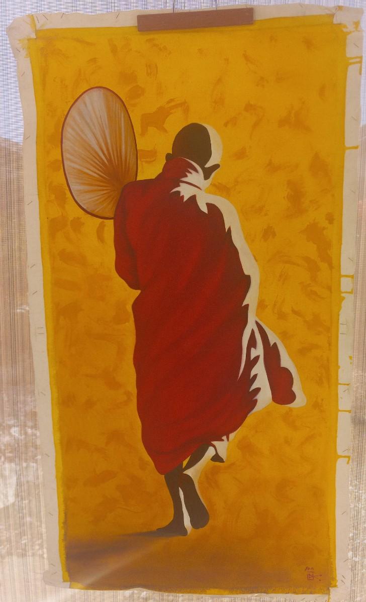 Great painting on canvas of an Asian monk in a robe carrying a fan.