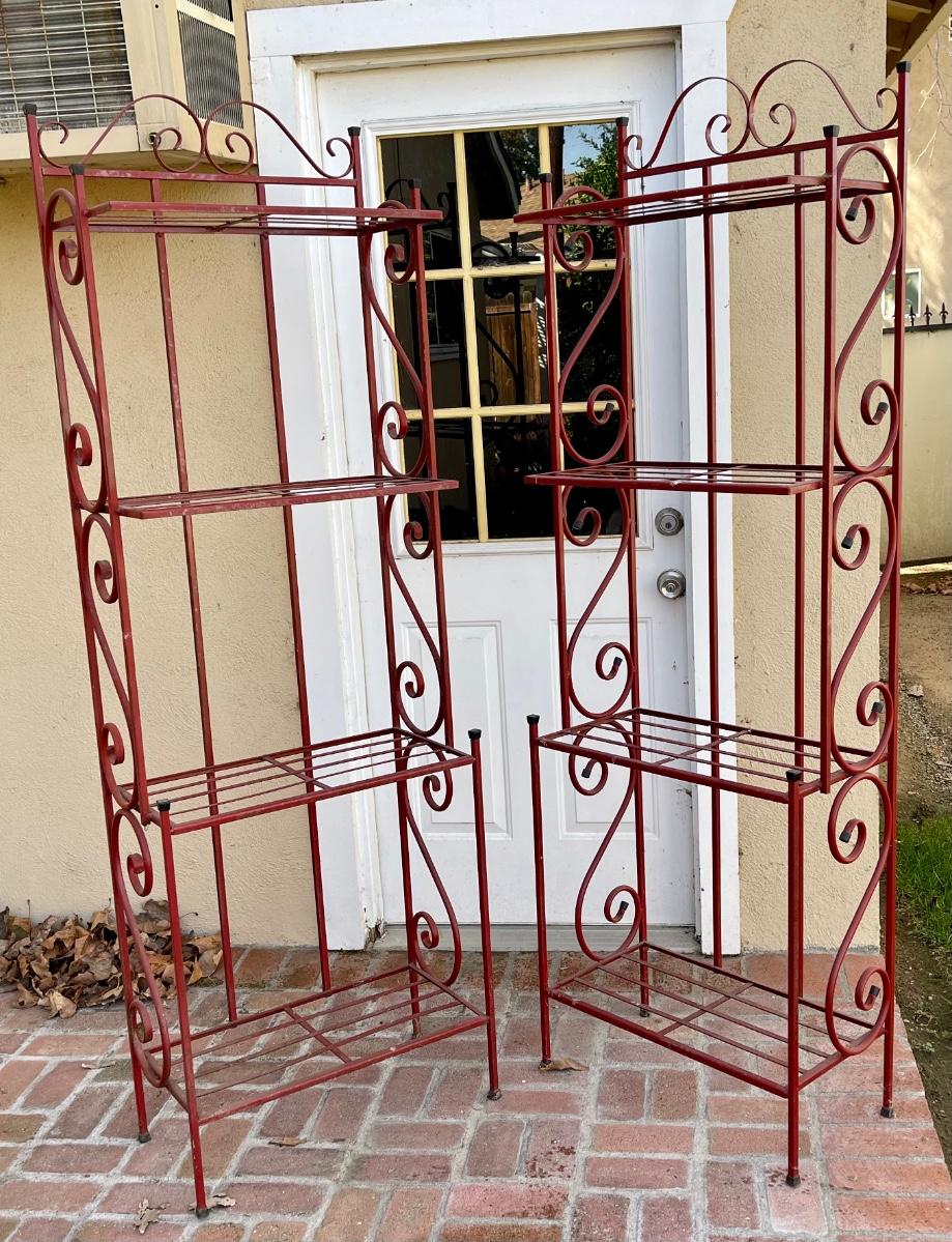 Pair of Red Painted Metal Bakers Rake Garden Shelves