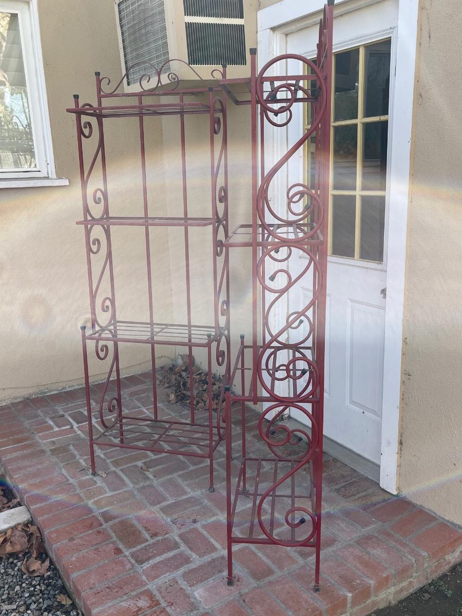 Pair of Red Painted Metal Bakers Rake Garden Shelves. 6’ tall. Good used condition.