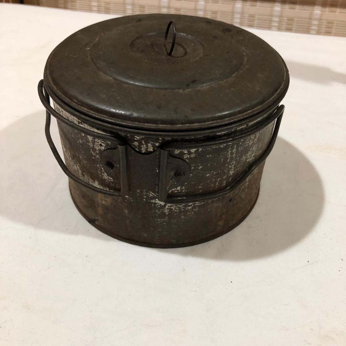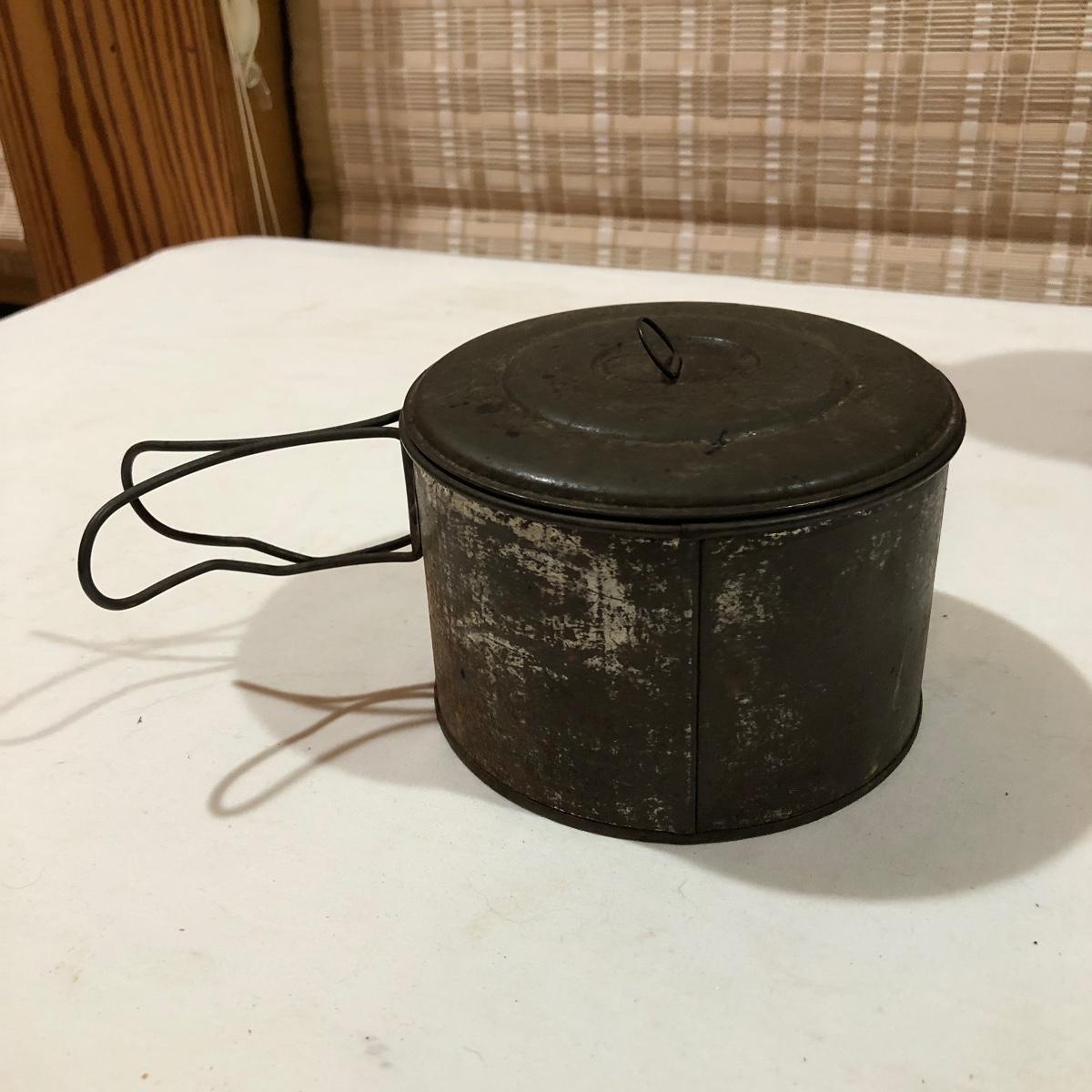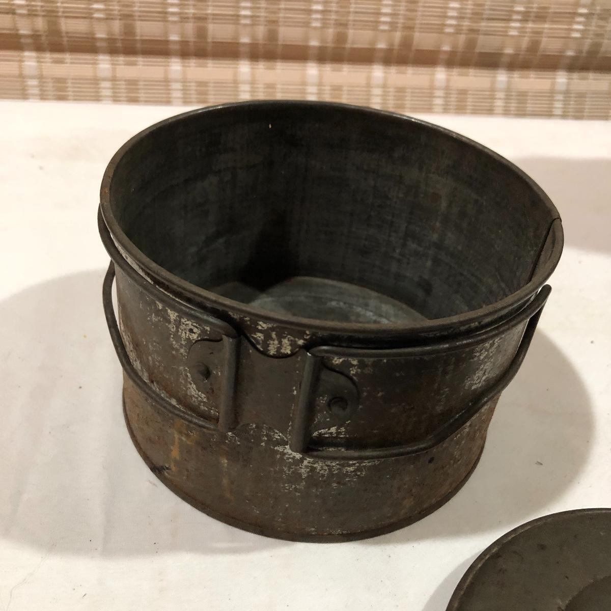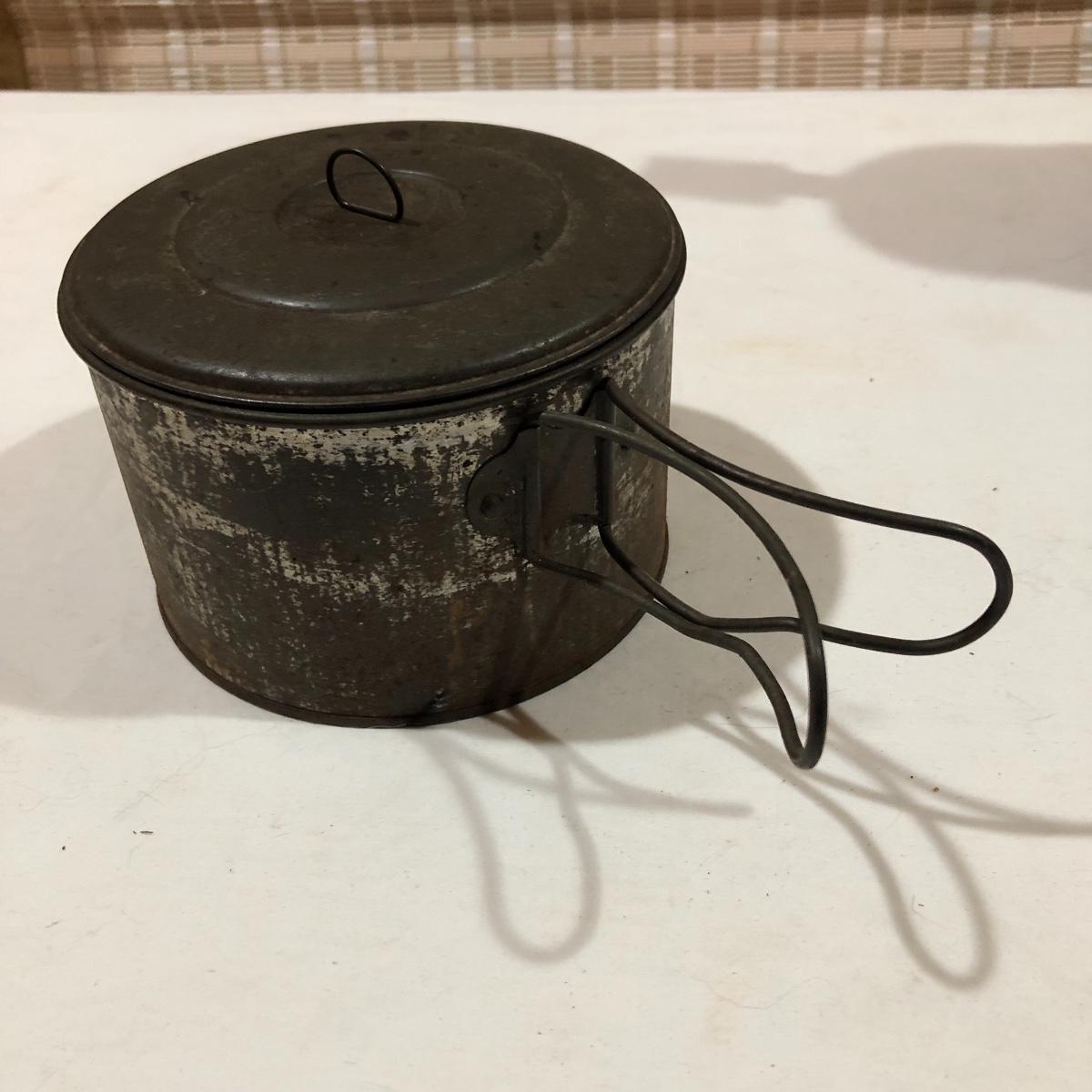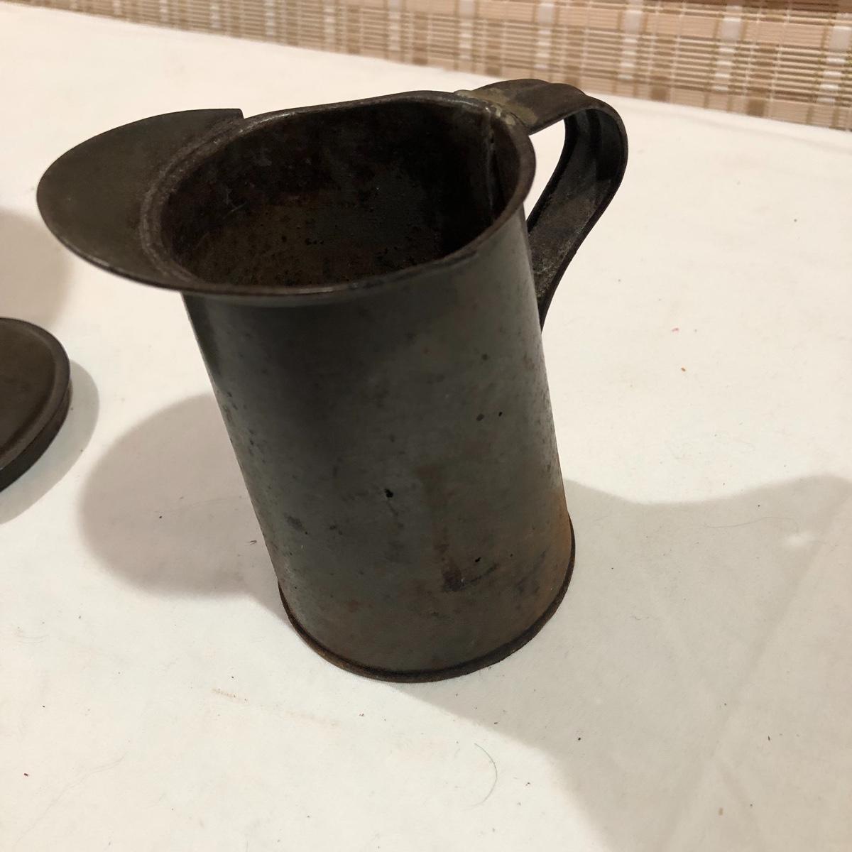 The standard French M1852 mess kit dates back to World War I 1914-1918. It measures 5” in diameter. There are no dents or dings and it is all intact. The coffee pot dates to the civil war. The handle and hinged lid needs soldering. It is made of tin and there is some rust inside. It is 8” tall. The small milk/cream pitcher is also tin, from the Civil War time frame and stands 4.5” tall. There are a few small pin holes in the side. Shipping Available.
