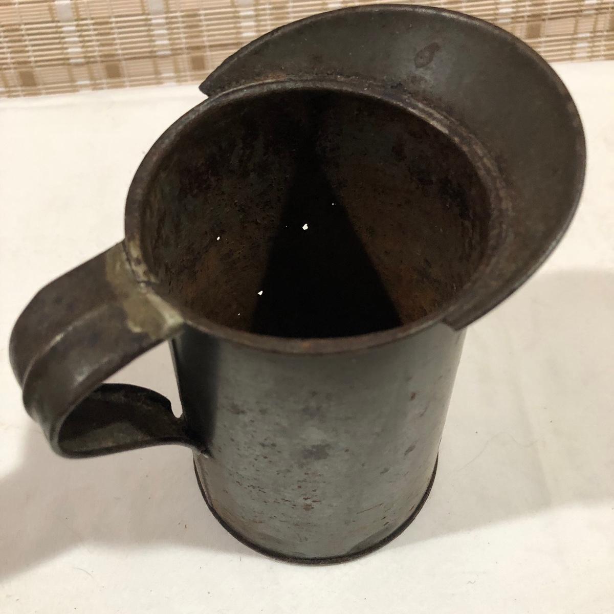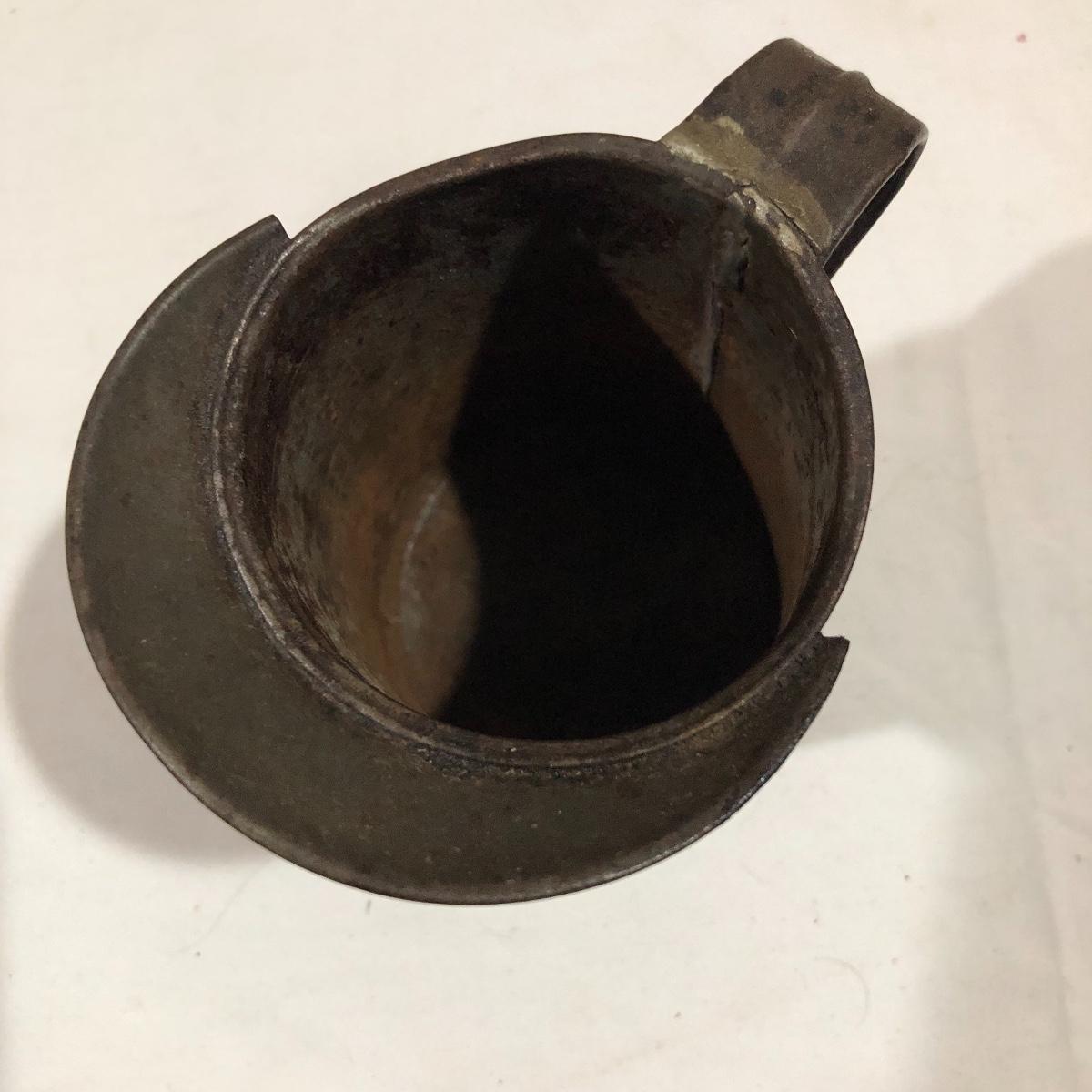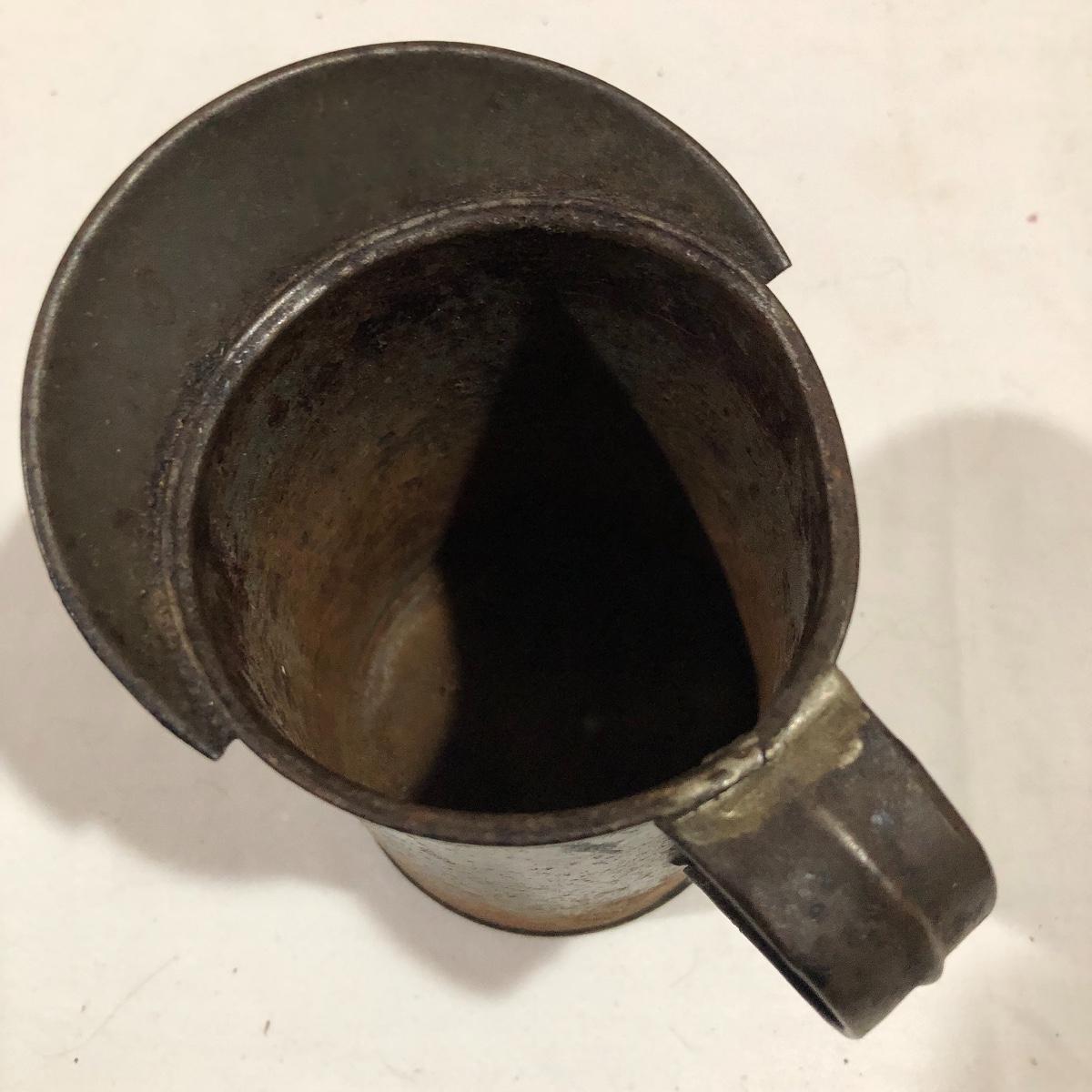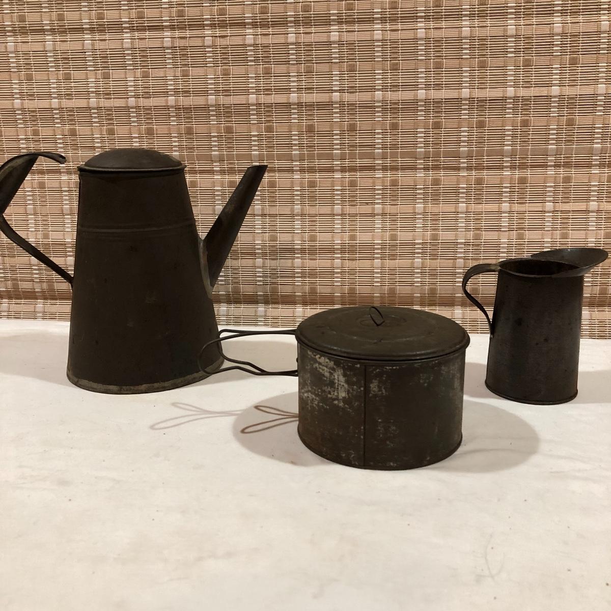 The standard French M1852 mess kit dates back to World War I 1914-1918. It measures 5” in diameter. There are no dents or dings and it is all intact. The coffee pot dates to the civil war. The handle and hinged lid needs soldering. It is made of tin and there is some rust inside. It is 8” tall. The small milk/cream pitcher is also tin, from the Civil War time frame and stands 4.5” tall. There are a few small pin holes in the side. Shipping Available.