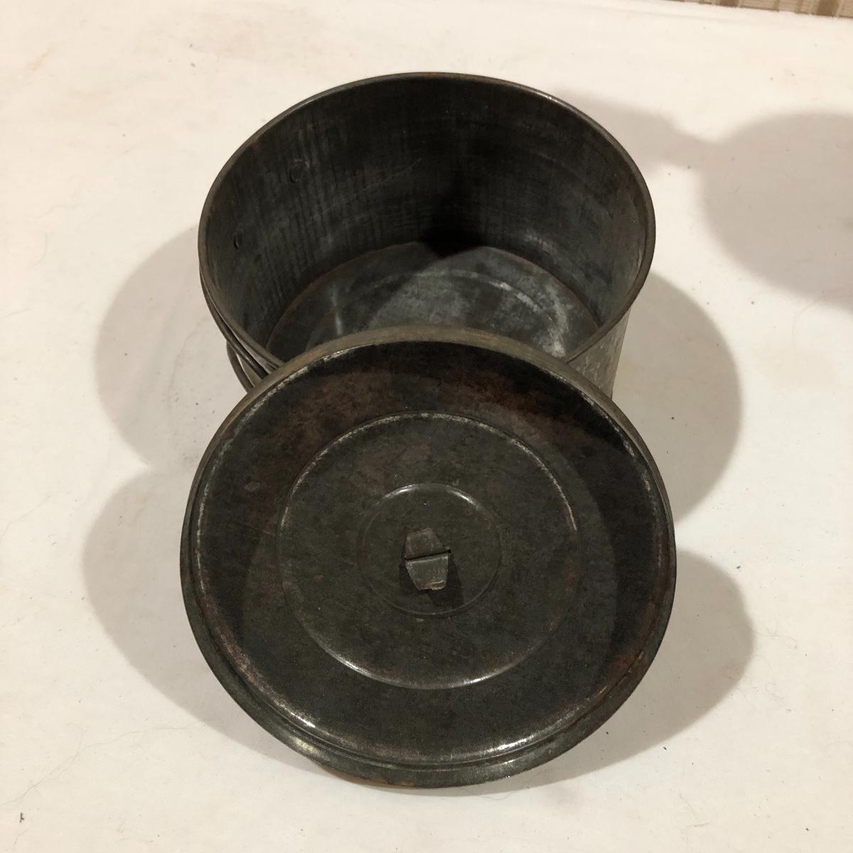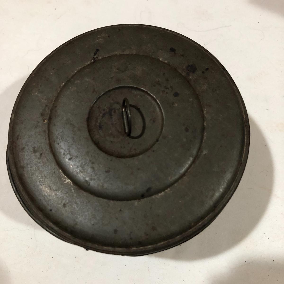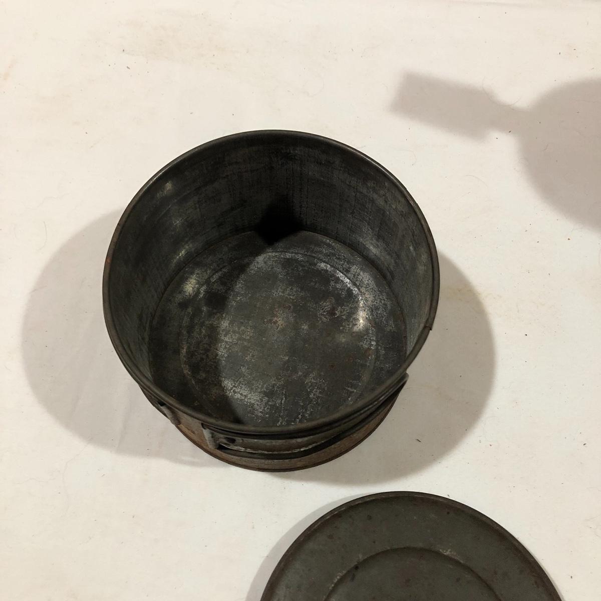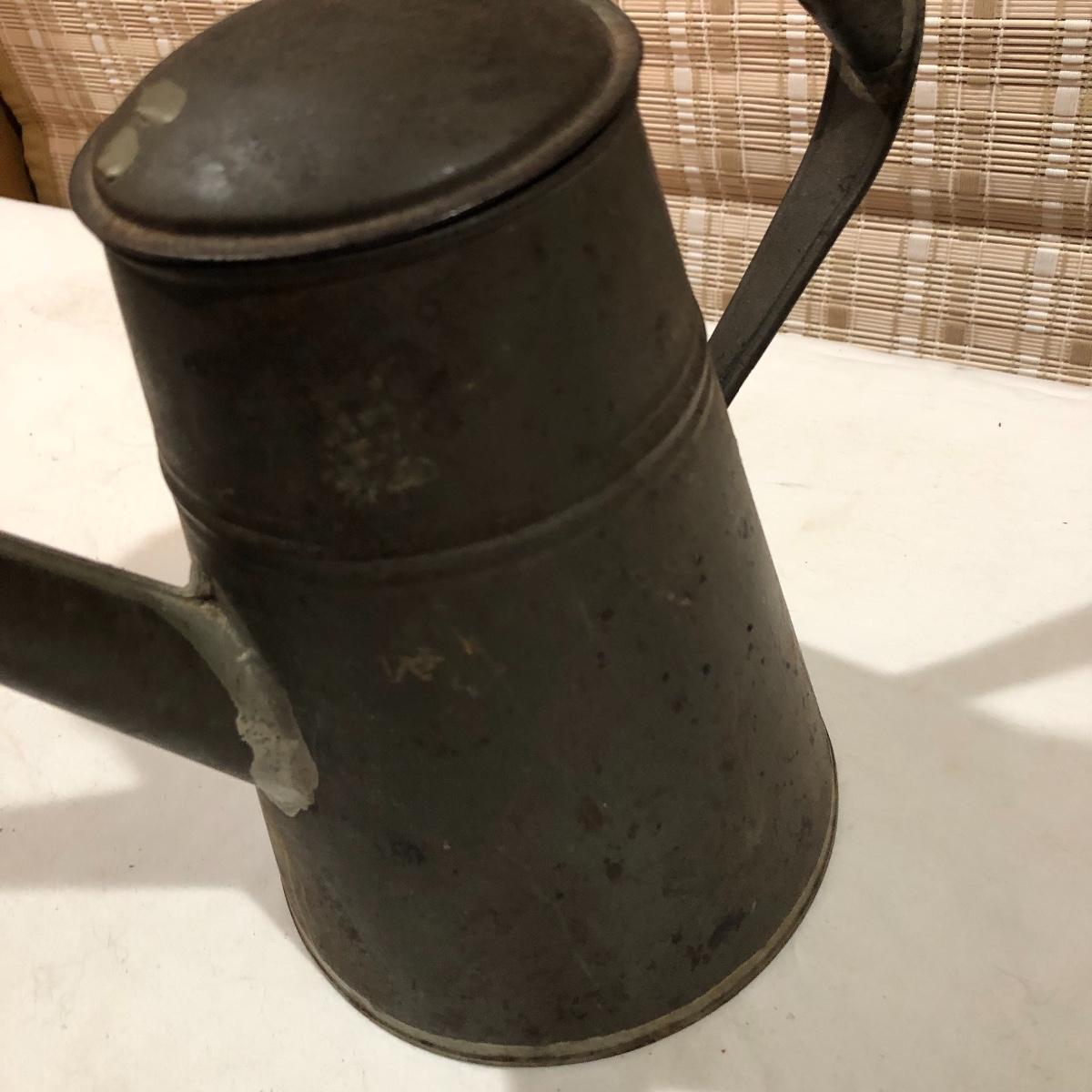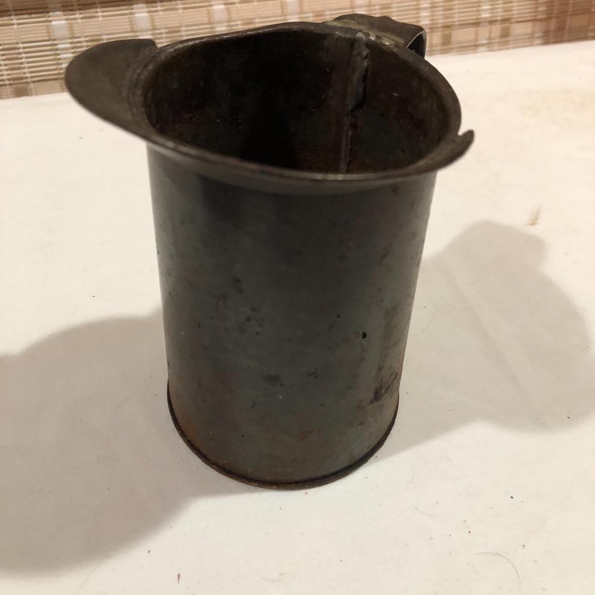 The standard French M1852 mess kit dates back to World War I 1914-1918. It measures 5” in diameter. There are no dents or dings and it is all intact. The coffee pot dates to the civil war. The handle and hinged lid needs soldering. It is made of tin and there is some rust inside. It is 8” tall. The small milk/cream pitcher is also tin, from the Civil War time frame and stands 4.5” tall. There are a few small pin holes in the side. Shipping Available.