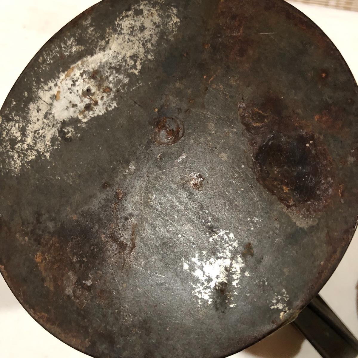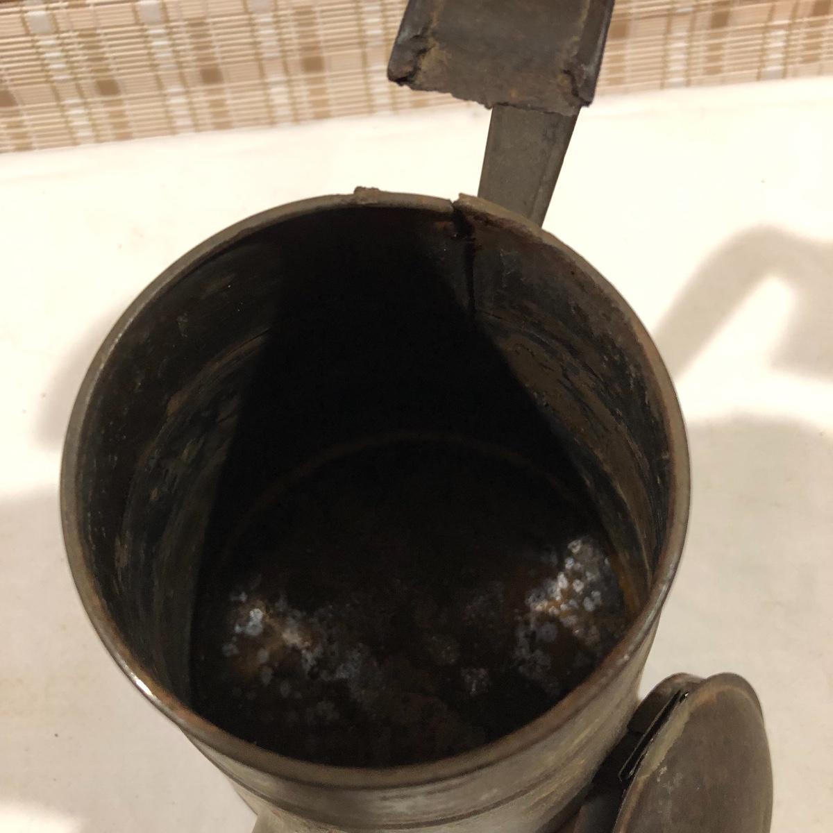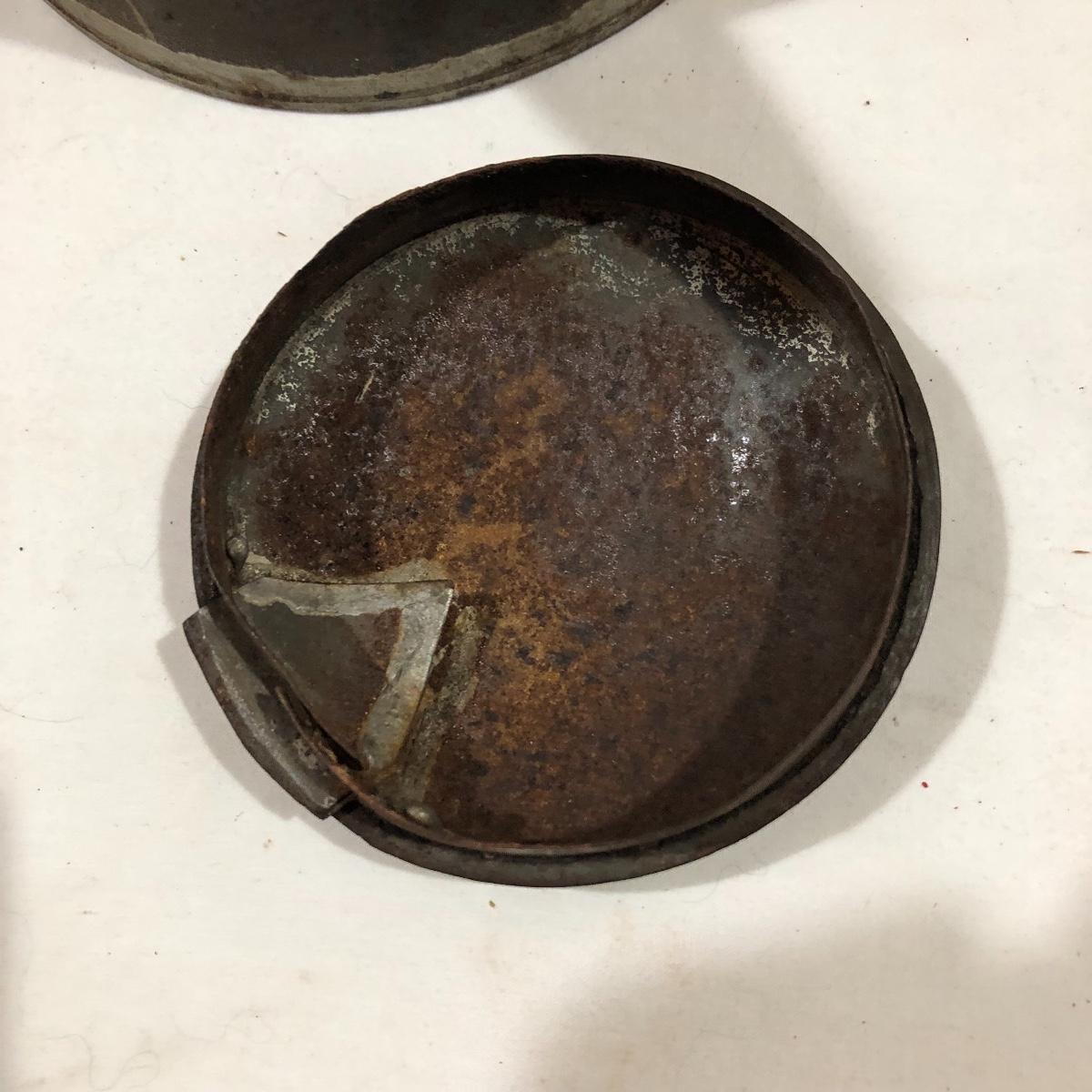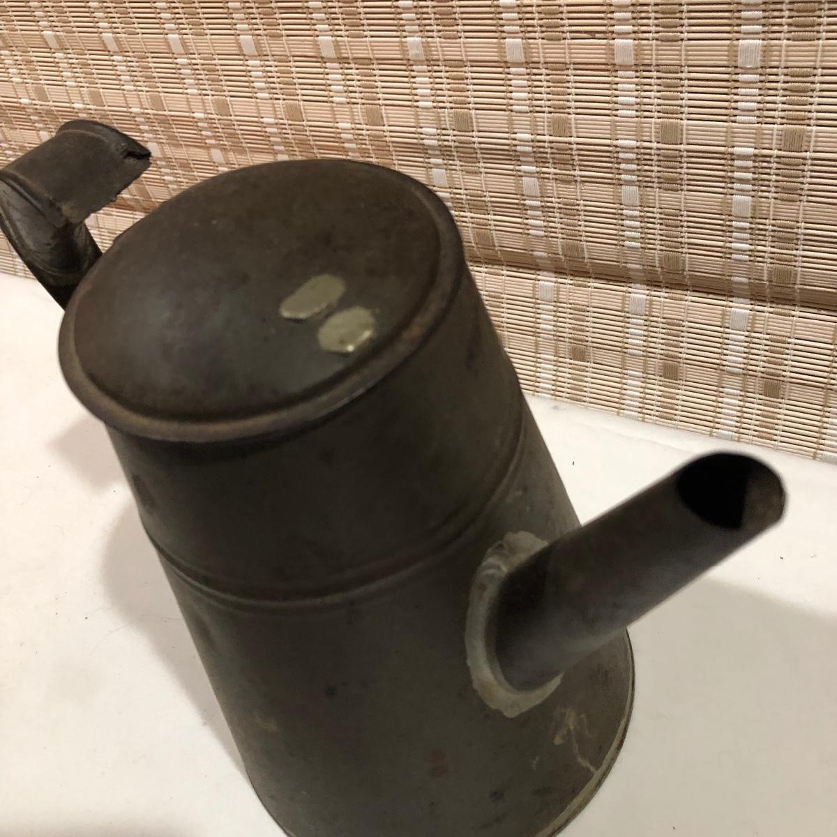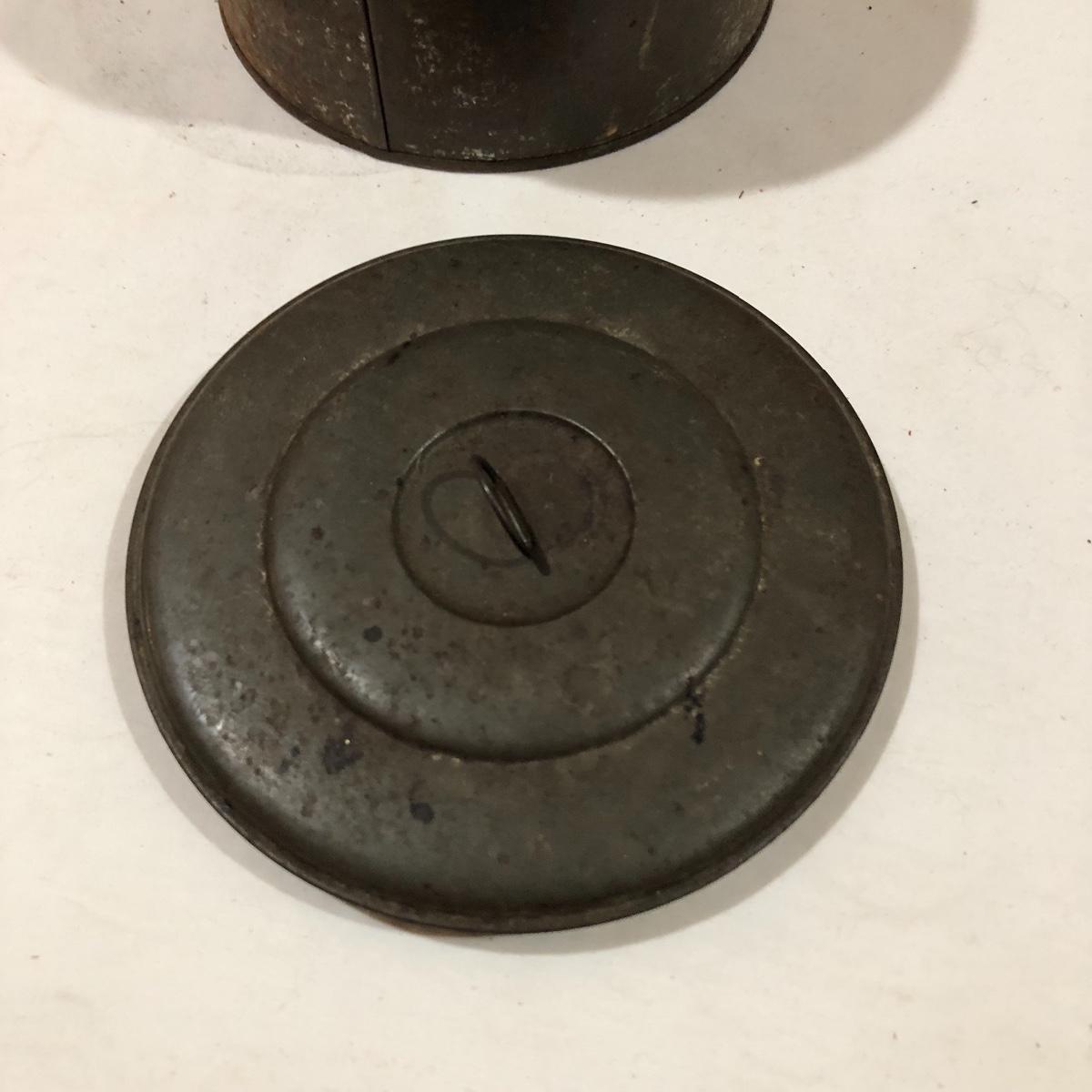 The standard French M1852 mess kit dates back to World War I 1914-1918. It measures 5” in diameter. There are no dents or dings and it is all intact. The coffee pot dates to the civil war. The handle and hinged lid needs soldering. It is made of tin and there is some rust inside. It is 8” tall. The small milk/cream pitcher is also tin, from the Civil War time frame and stands 4.5” tall. There are a few small pin holes in the side. Shipping Available.